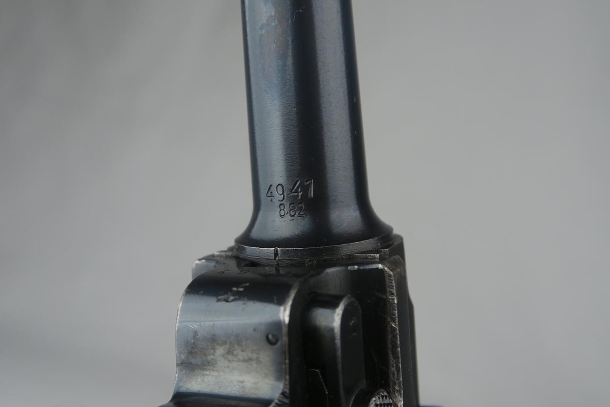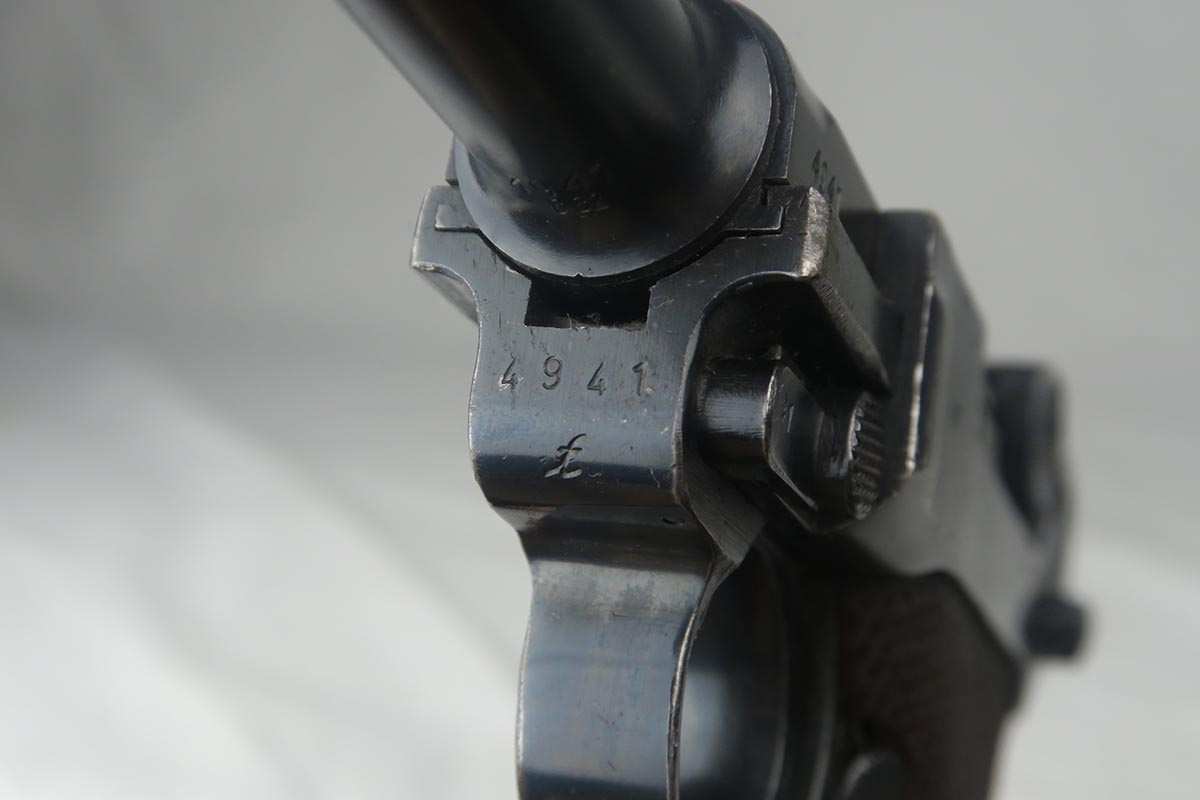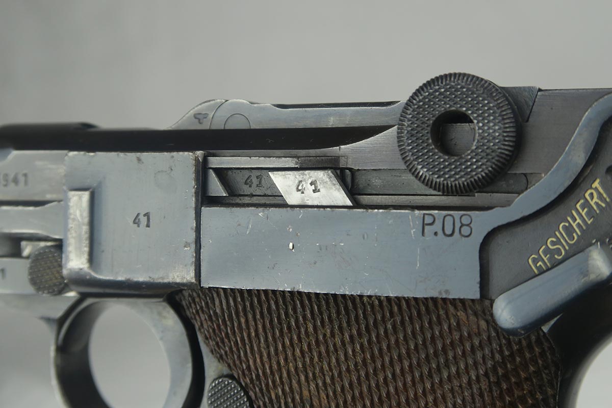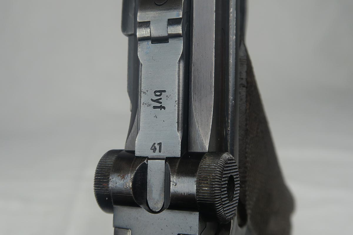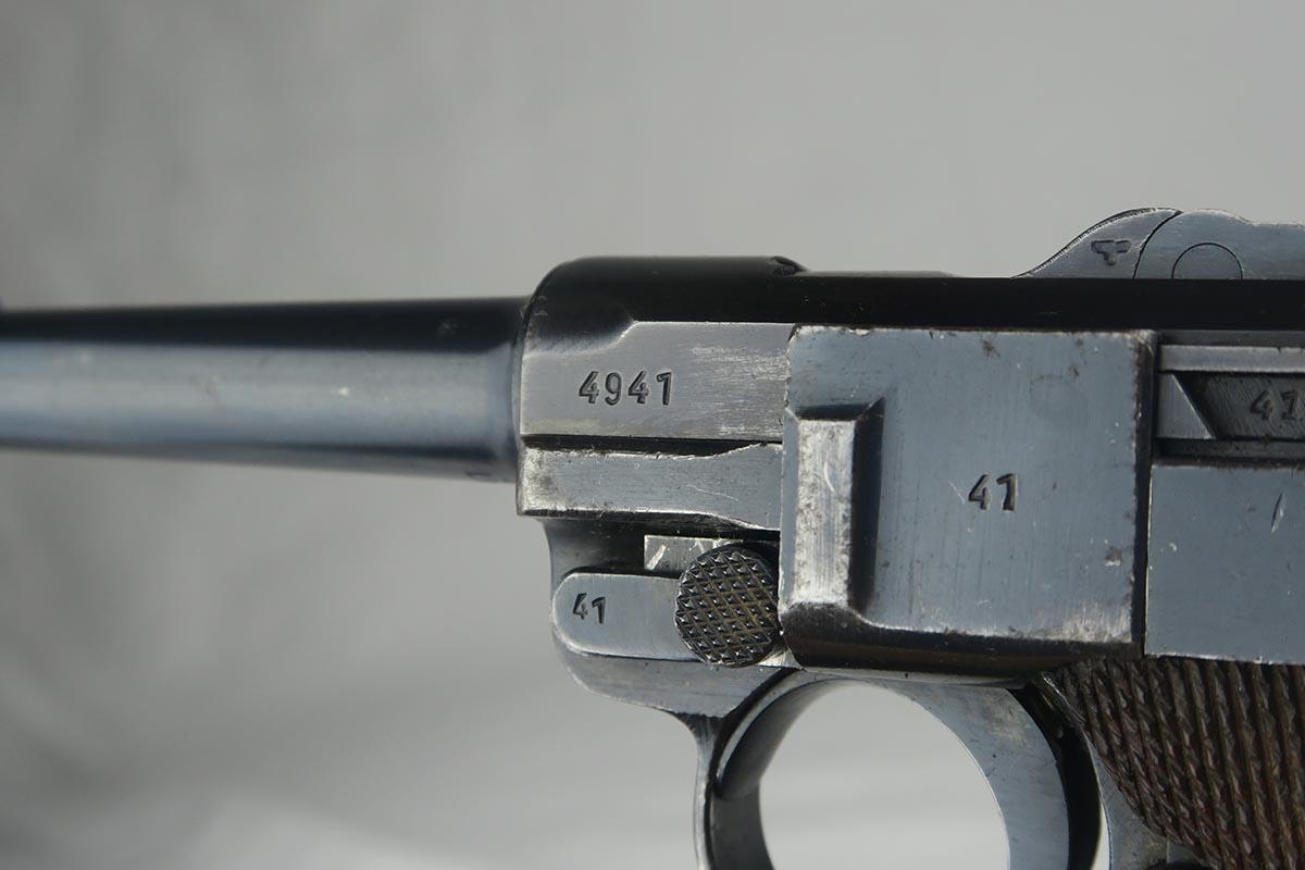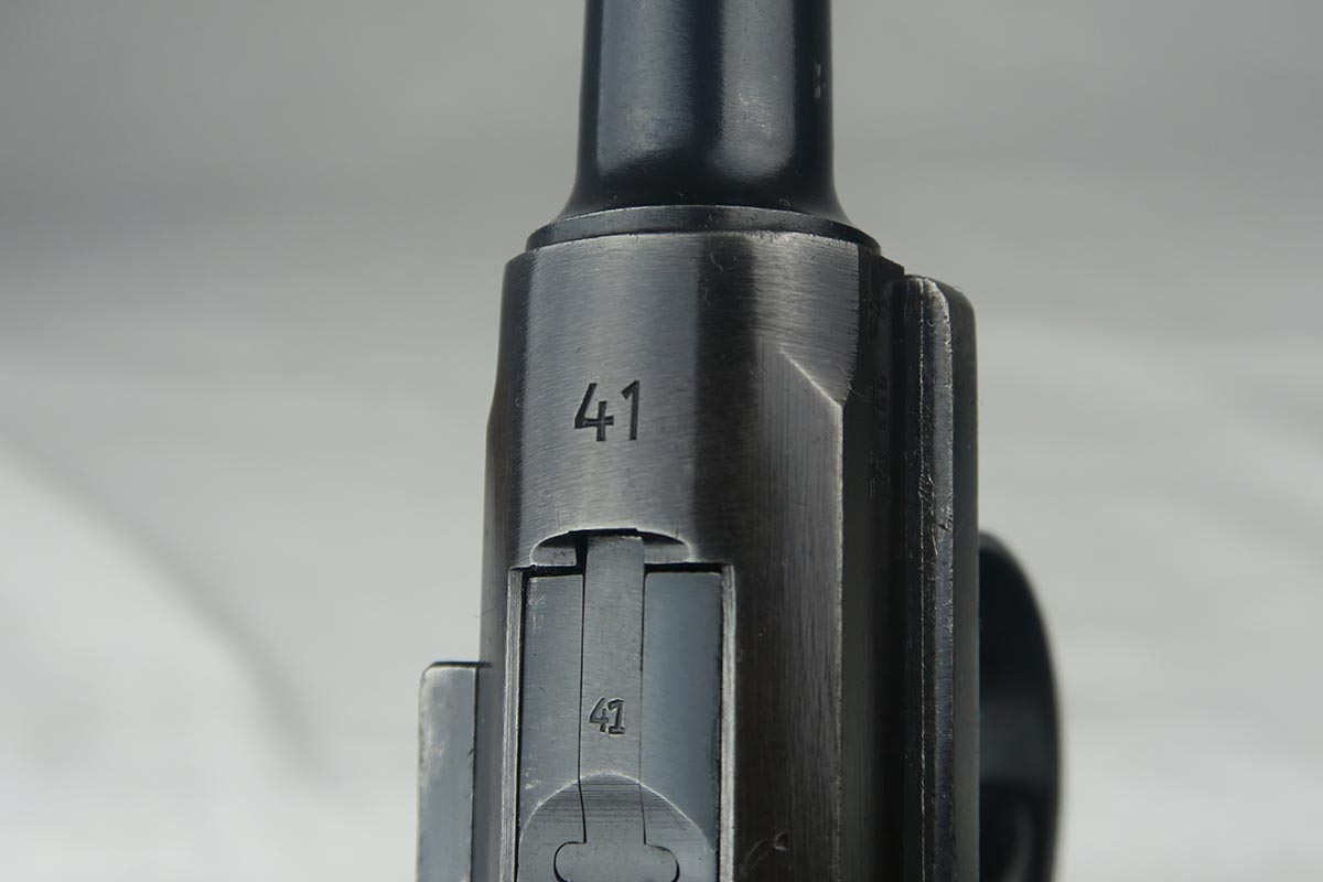 8/15/17 – This is an all original and correct Mauser byf 41 luger from WW2.  All numbered small parts are matching, as are the grips.  The magazine is period correct but numbered to another gun.  Original finish rates at 93-94% with most of the wear on the high edges (sideplate, muzzle, stock lug).  Grips have no major chips or cracks.  Bore is a little frosted, maybe with a little freckling, but still in solid shooting condition.