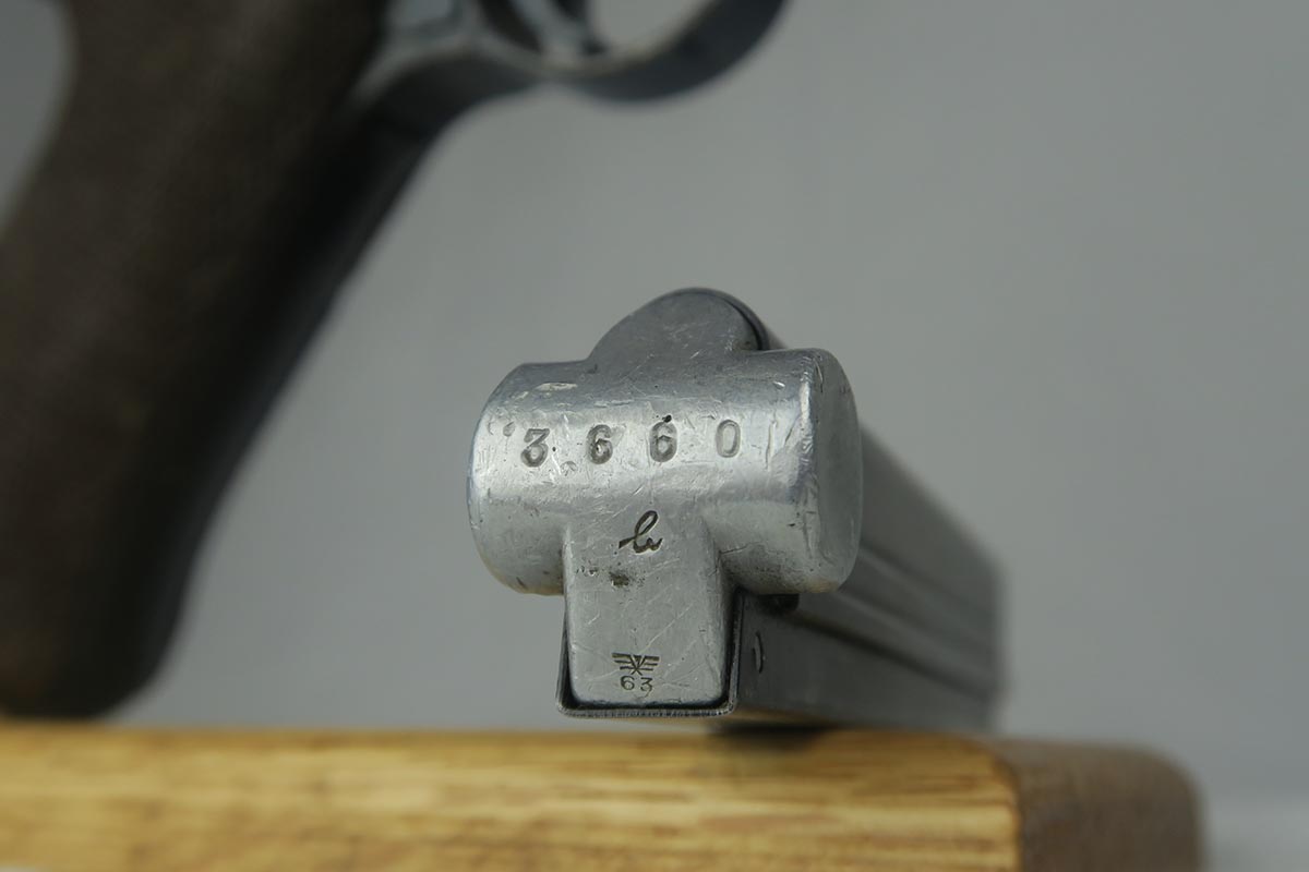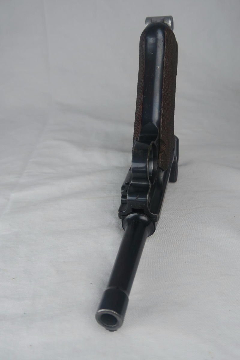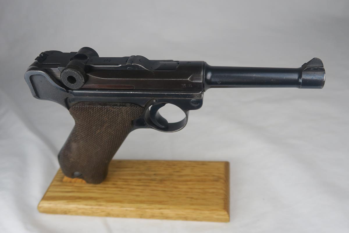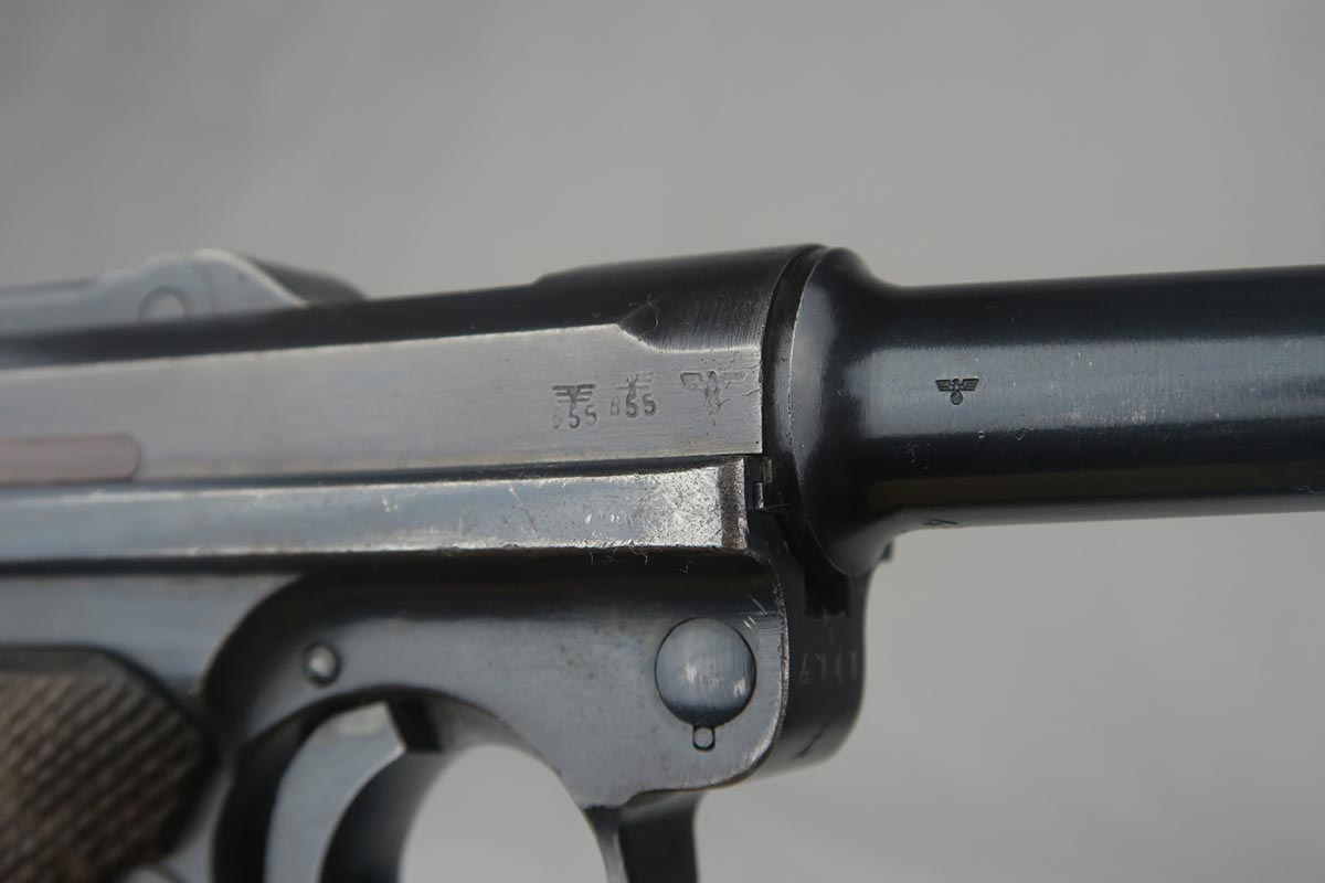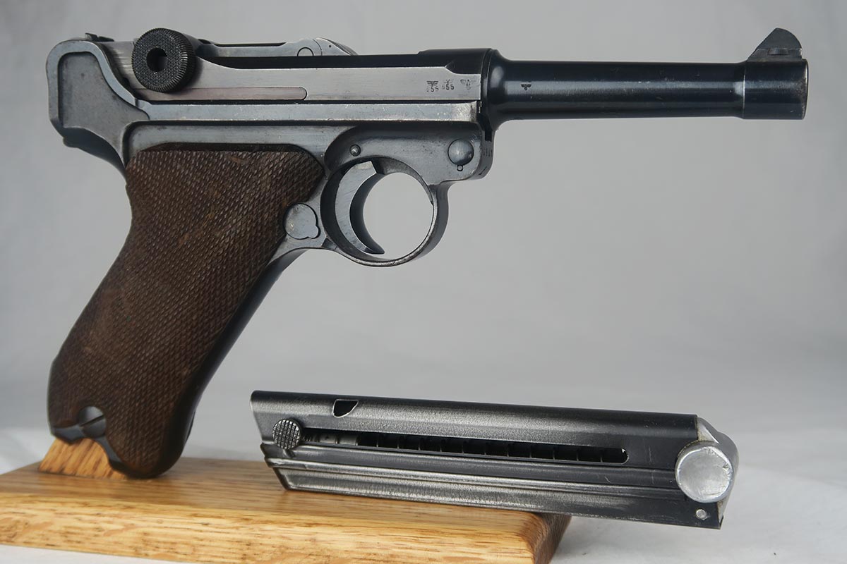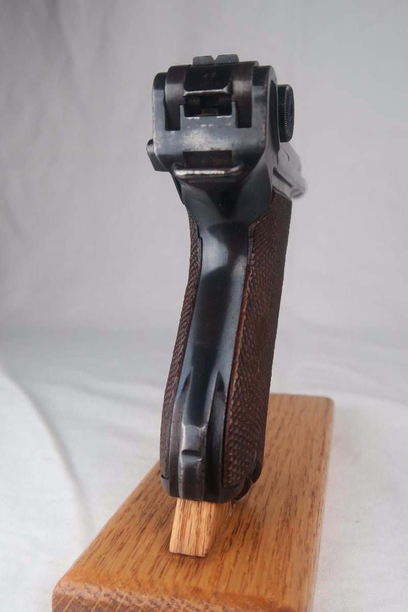8/15/17 – This is an all original and correct Mauser byf 41 luger from WW2.  All numbered small parts are matching, as are the grips.  The magazine is period correct but numbered to another gun.  Original finish rates at 93-94% with most of the wear on the high edges (sideplate, muzzle, stock lug).  Grips have no major chips or cracks.  Bore is a little frosted, maybe with a little freckling, but still in solid shooting condition.