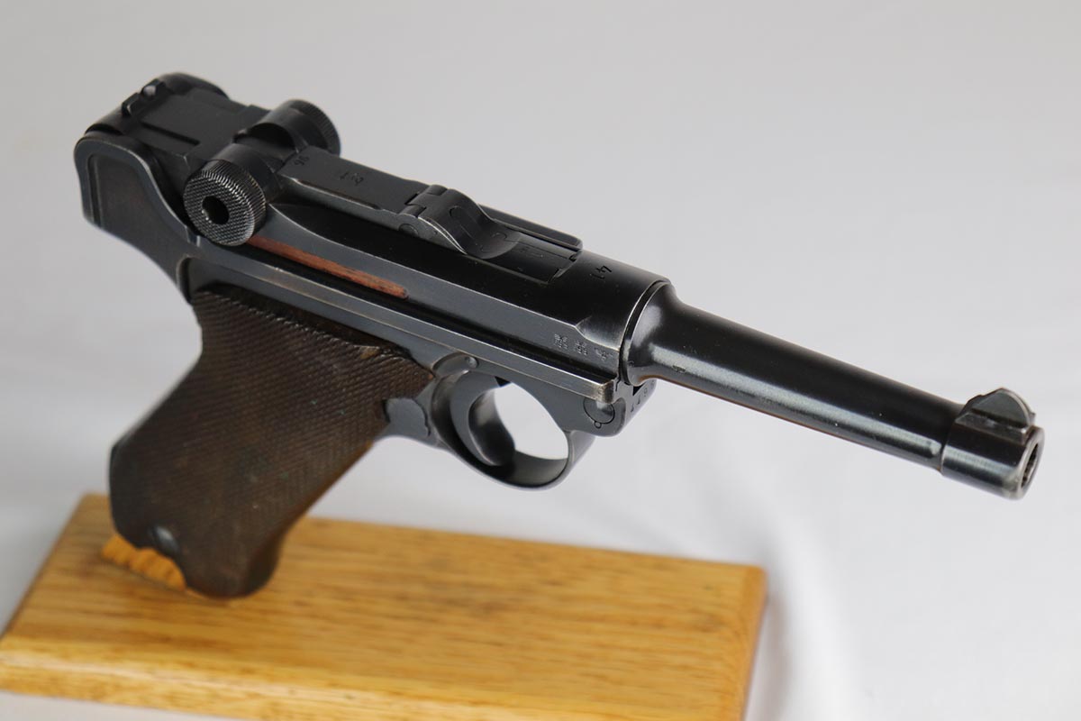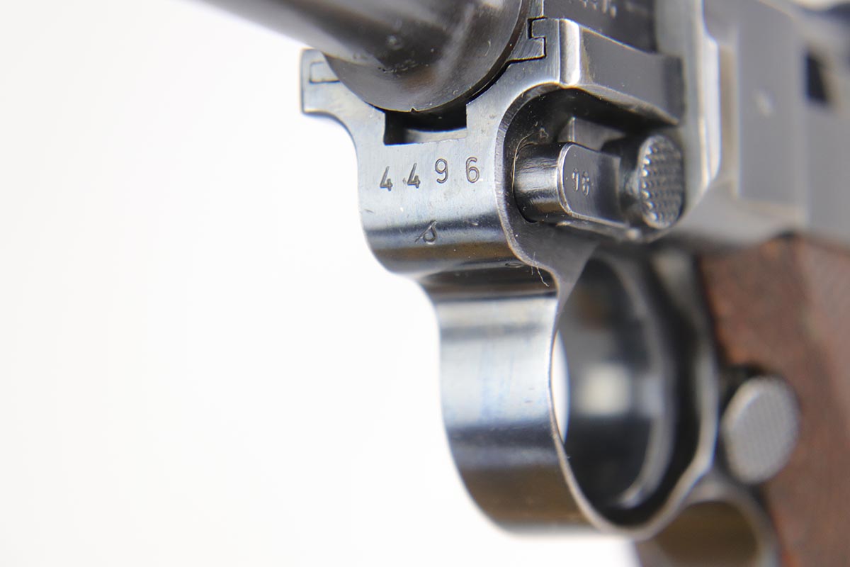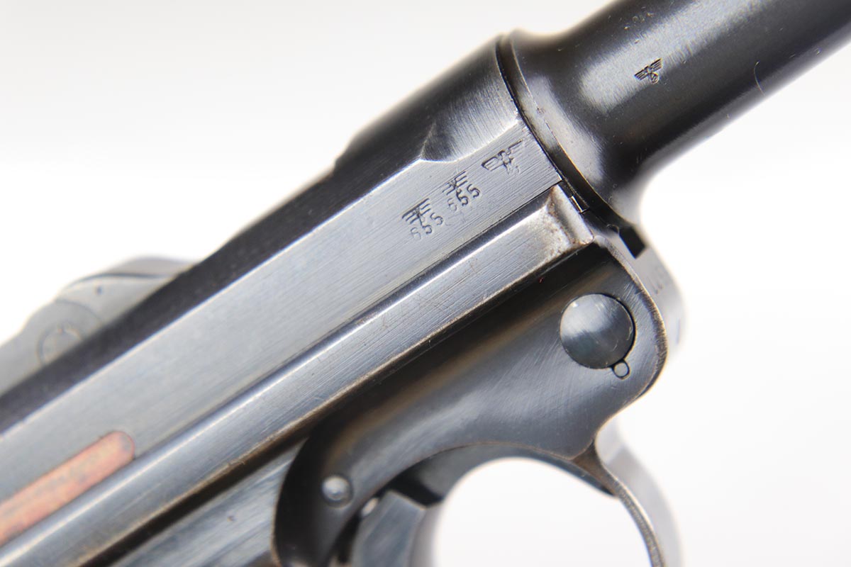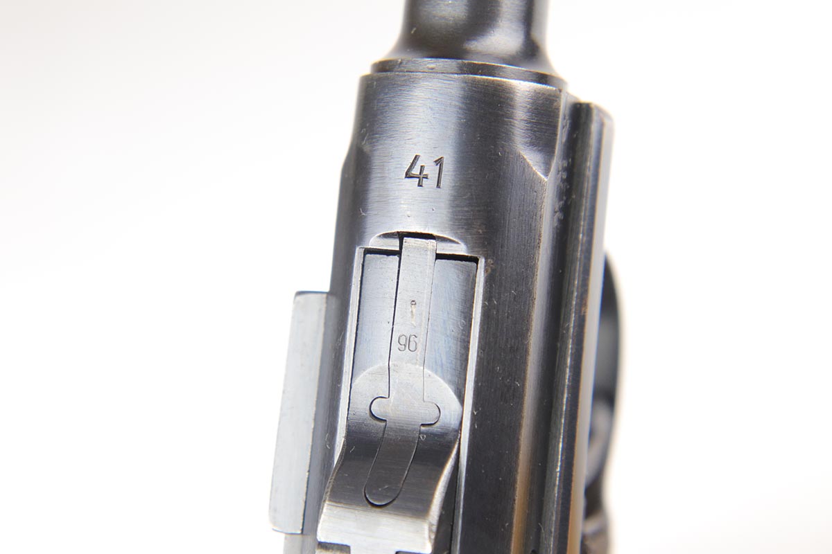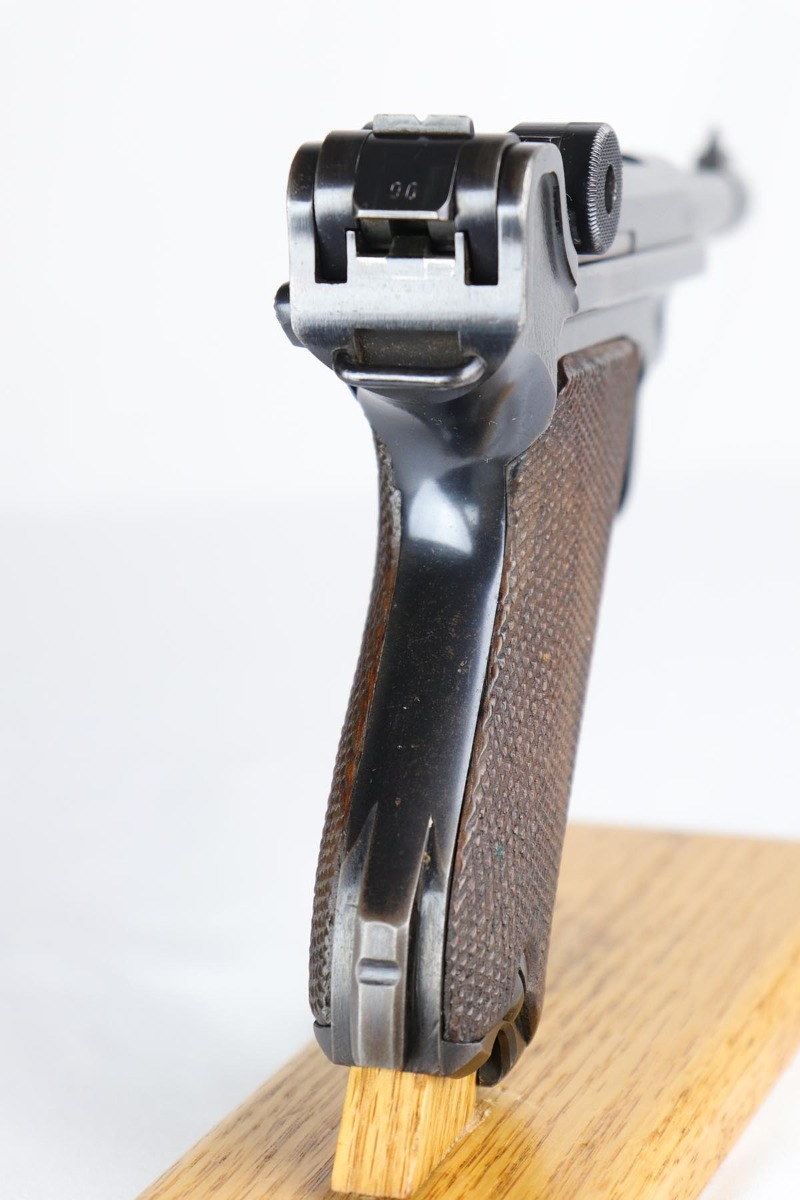 2/20/18 – This is a nice example of a fully original and matching Mauser luger from 1941. It has the original matching grips and a period correct but mismatched magazine. All other small parts are matching. The finish rates at about 95% with sideplate and edge wear, as well as an area of finish loss at the bottom of the front strap. Grips and magazine are in excellent condition. Bore shows minor use but no frost/corrosion and strong rifling.