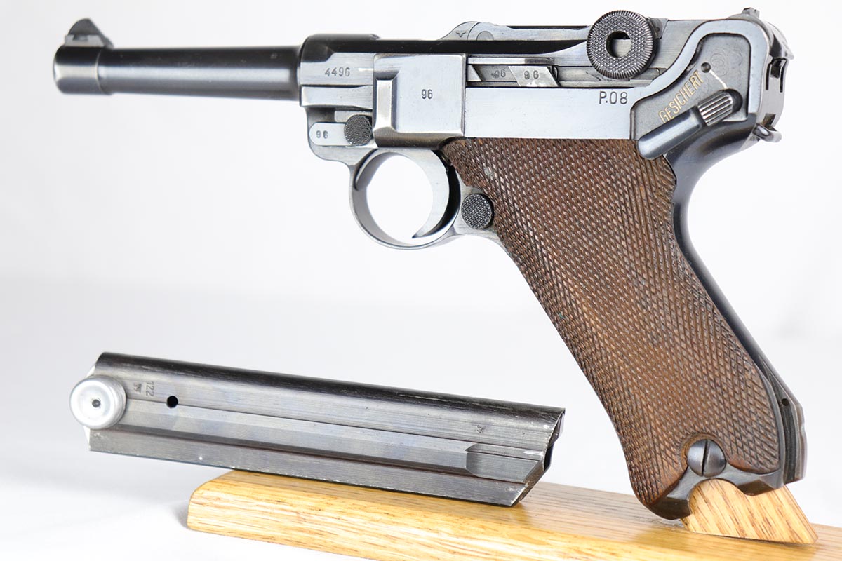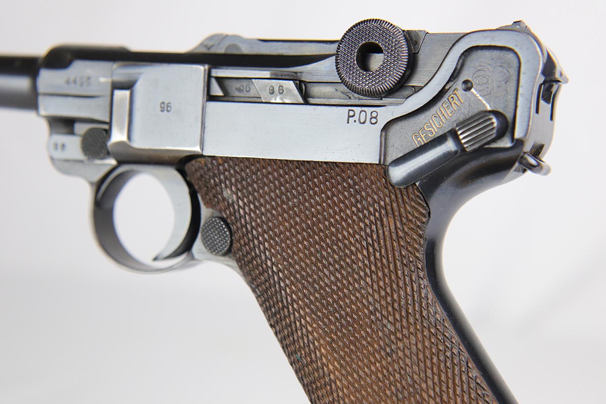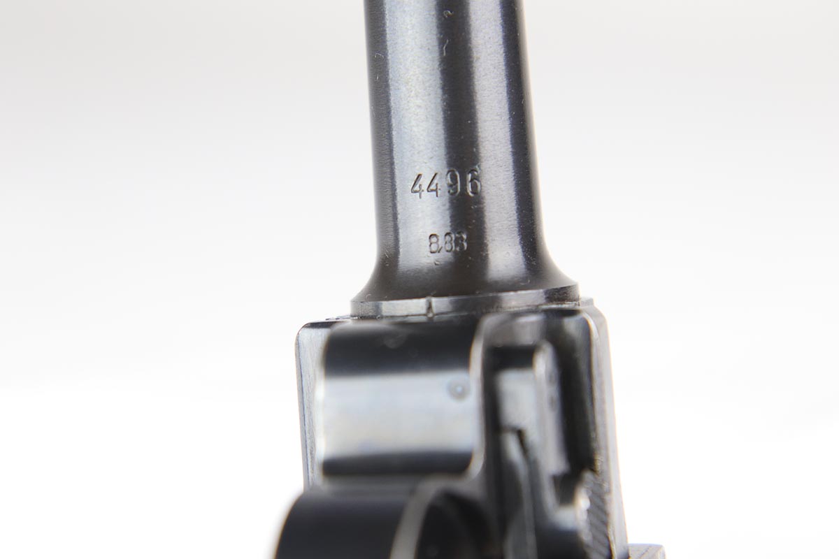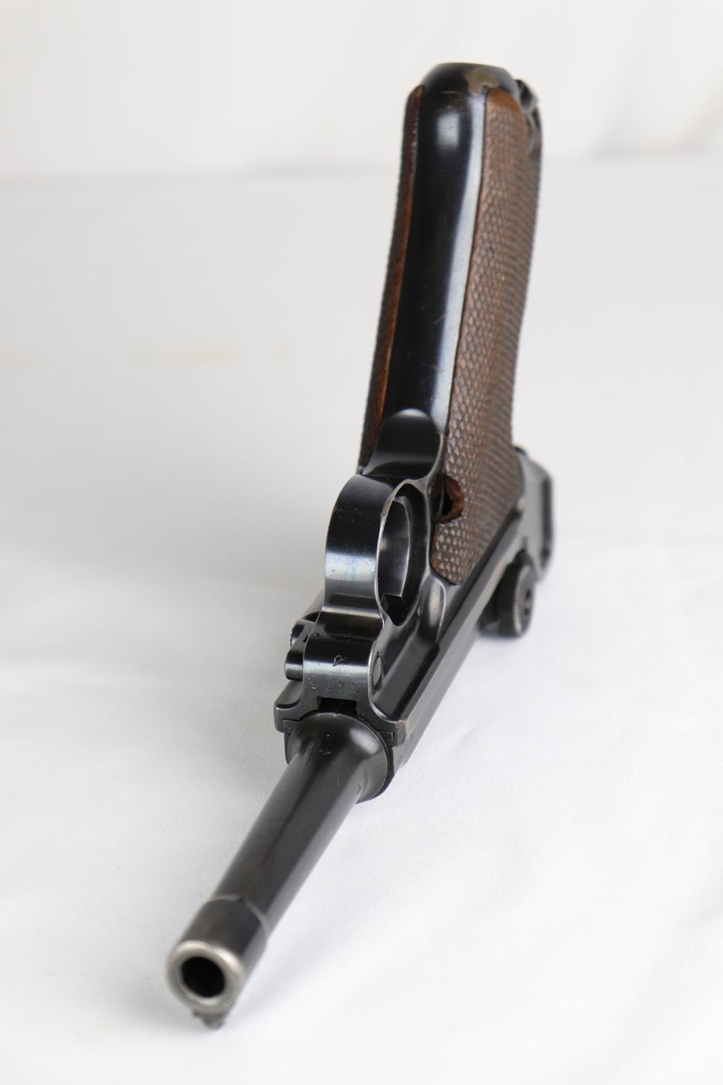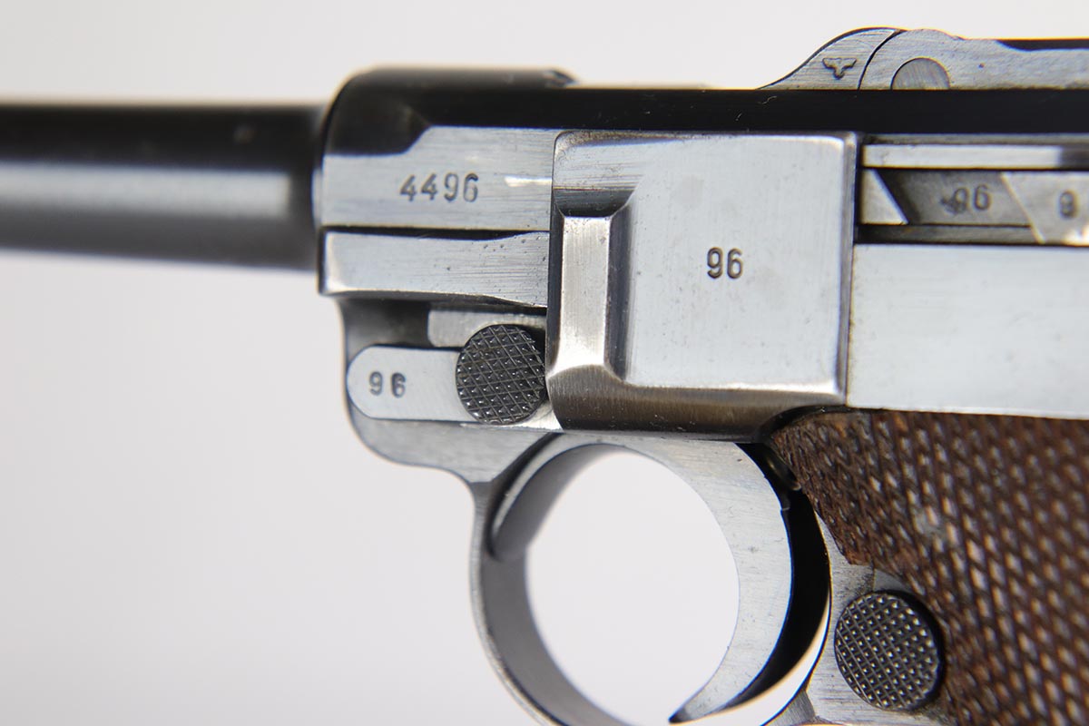 2/20/18 – This is a nice example of a fully original and matching Mauser luger from 1941. It has the original matching grips and a period correct but mismatched magazine. All other small parts are matching. The finish rates at about 95% with sideplate and edge wear, as well as an area of finish loss at the bottom of the front strap. Grips and magazine are in excellent condition. Bore shows minor use but no frost/corrosion and strong rifling.