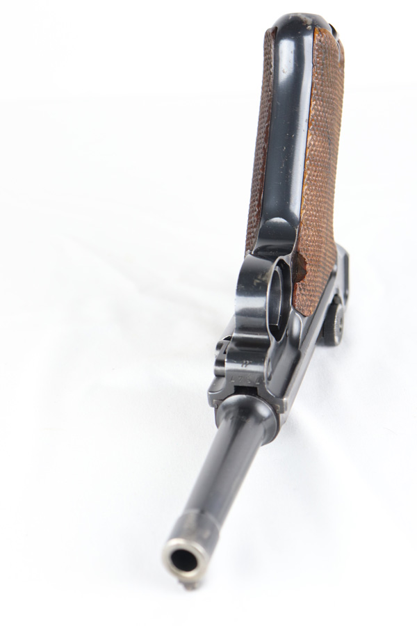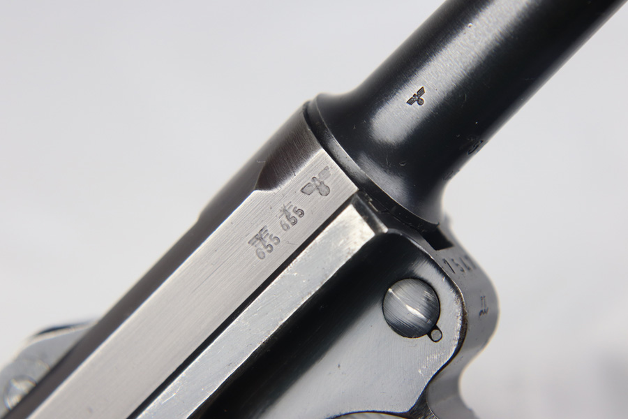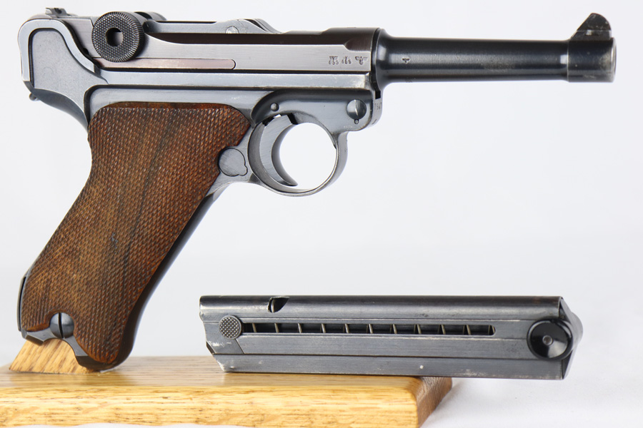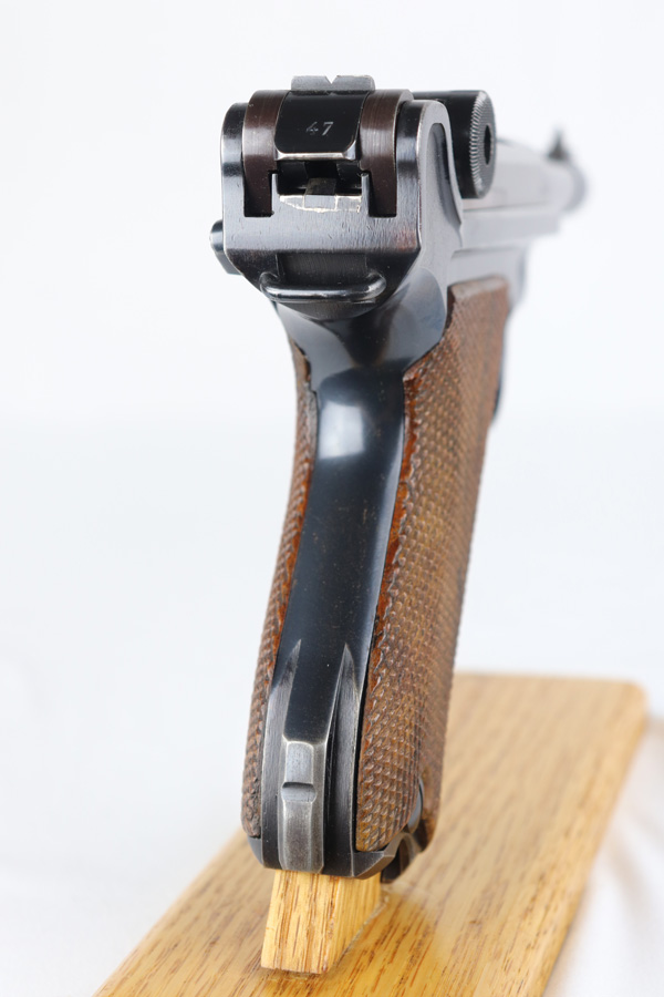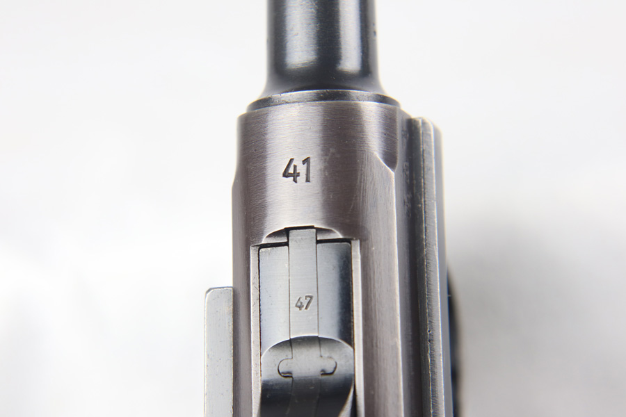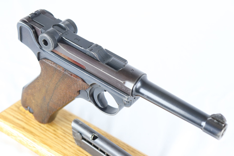 11/20/18 – This is a Mauser Luger that was manufactured and issued to the German Army in 1941. It is all matching, including the original grips. It has a proper Black Widow style magazine with minor handling wear and a couple of dings in the base. The finish on the gun is original and rates at 94% with high edge and muzzle wear, as well as some finish loss on the bottom of the straps and the trigger guard. Bore is shiny with minor frost.
