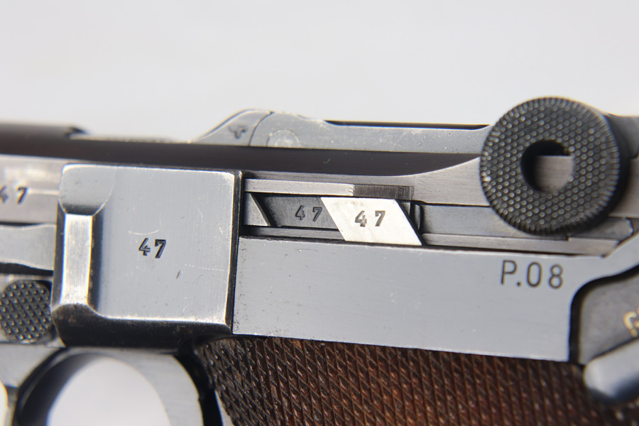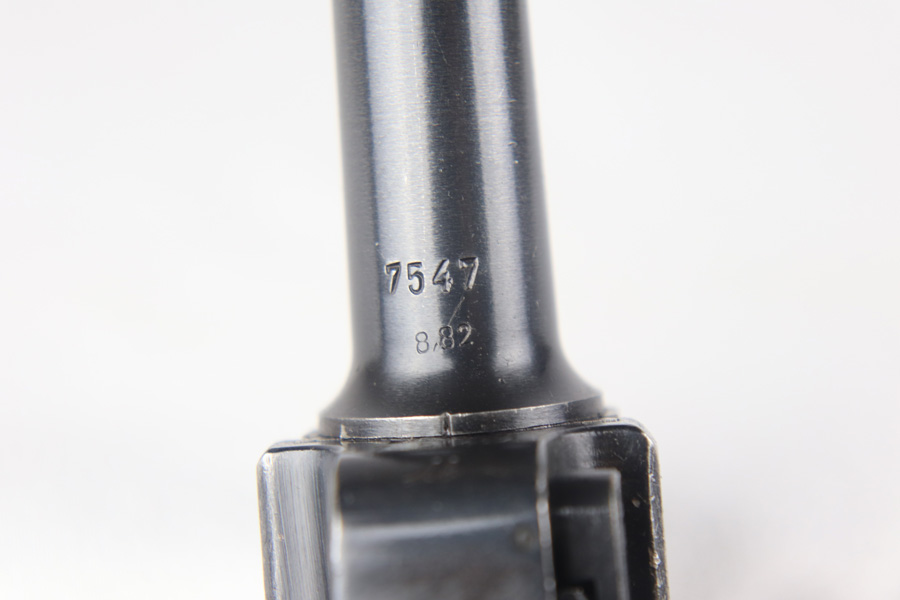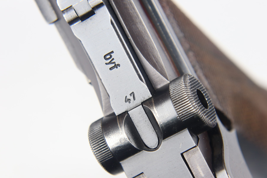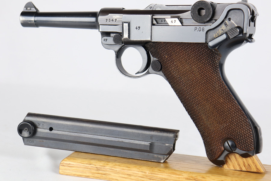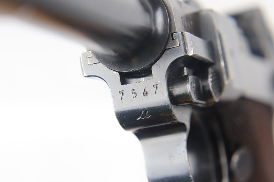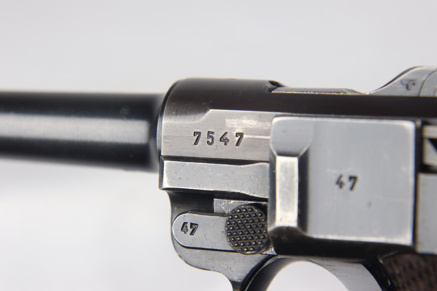 11/20/18 – This is a Mauser Luger that was manufactured and issued to the German Army in 1941. It is all matching, including the original grips. It has a proper Black Widow style magazine with minor handling wear and a couple of dings in the base. The finish on the gun is original and rates at 94% with high edge and muzzle wear, as well as some finish loss on the bottom of the straps and the trigger guard. Bore is shiny with minor frost.