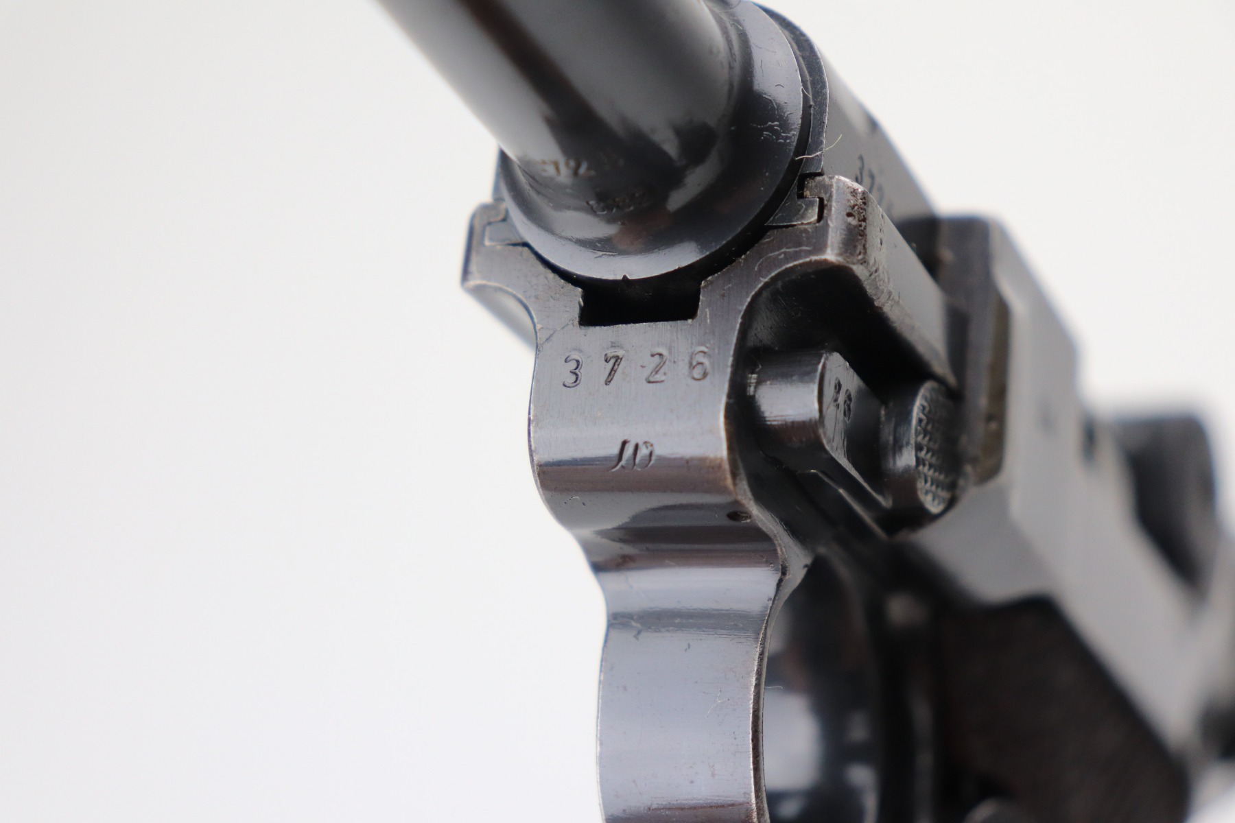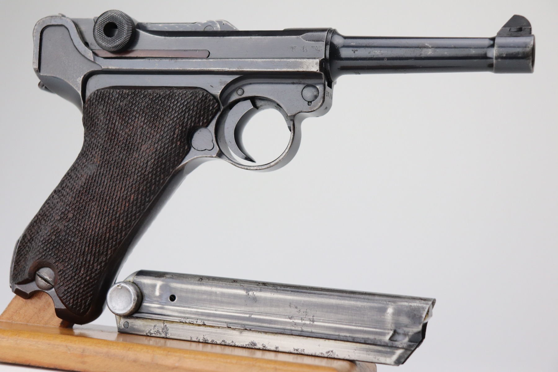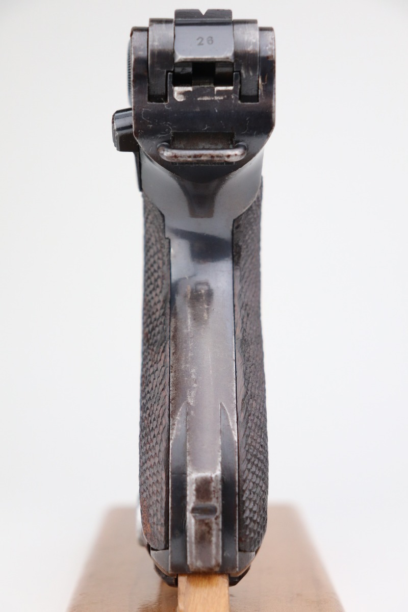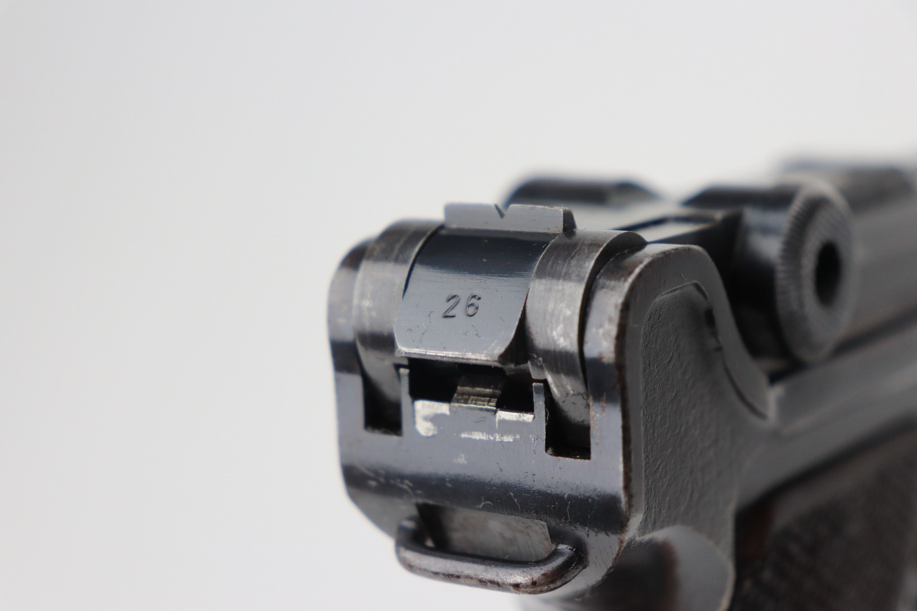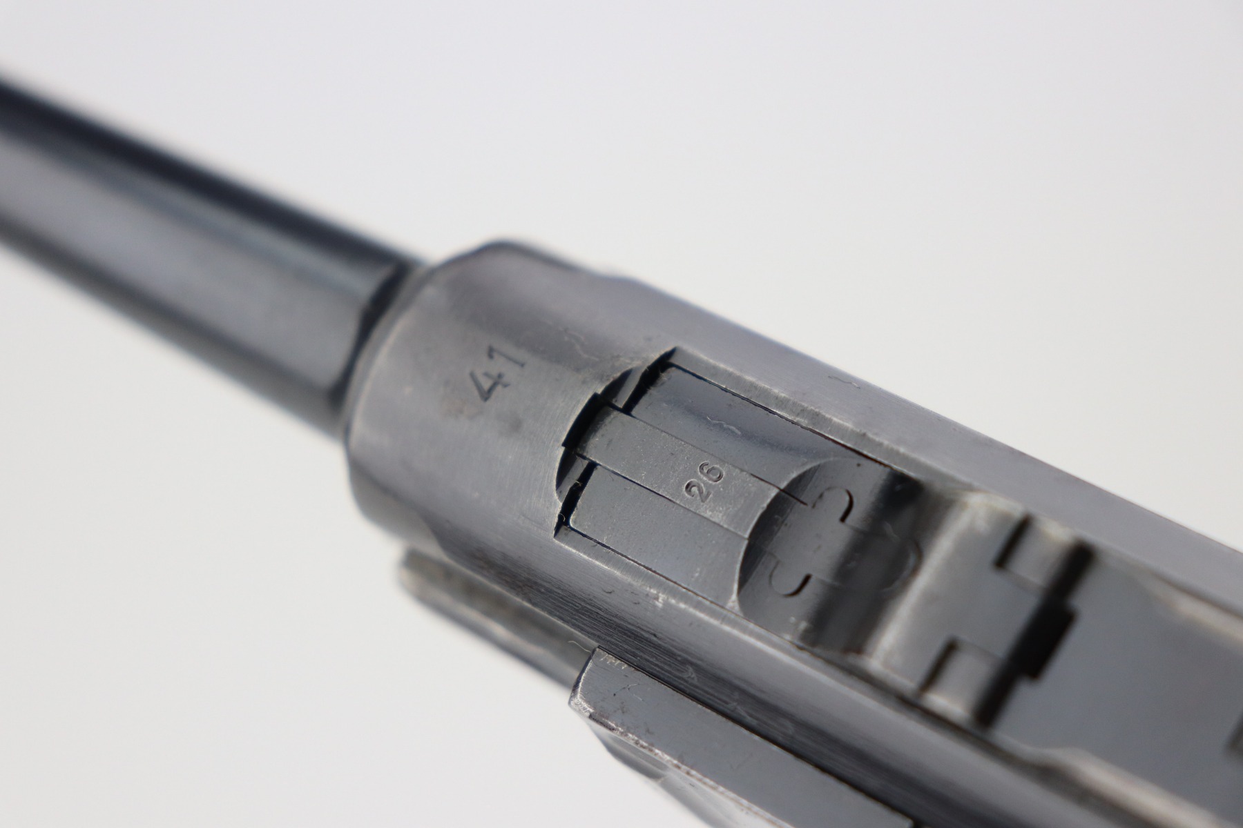 2/9/21 – This is a nice example of a Mauser Luger issued to the Nazi military in 1941. It is all matching and has the proper “Eagle 655” military proofs. It has retained roughly 85% of its original finish. There is minor wear around the muzzle, side plate, and high edges of the frame. Thinning and patina on the straps. Handling marks on the barrel and spotty wear on the left side of the frame. It comes with very nice grips and a period-correct armorer’s replacement magazine. Excellent bore – shiny with strong rifling.