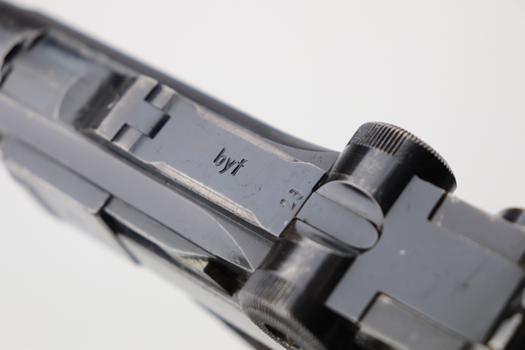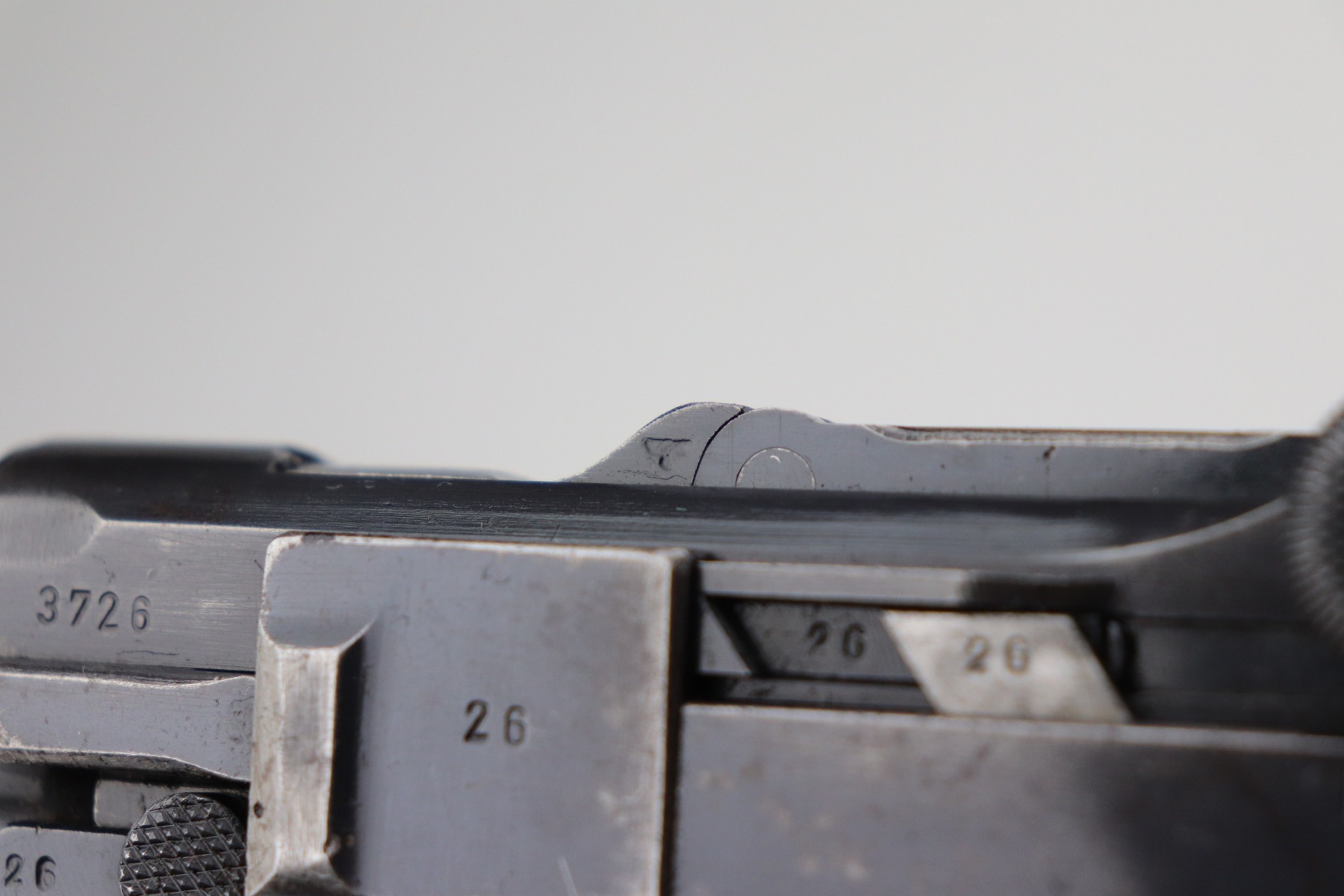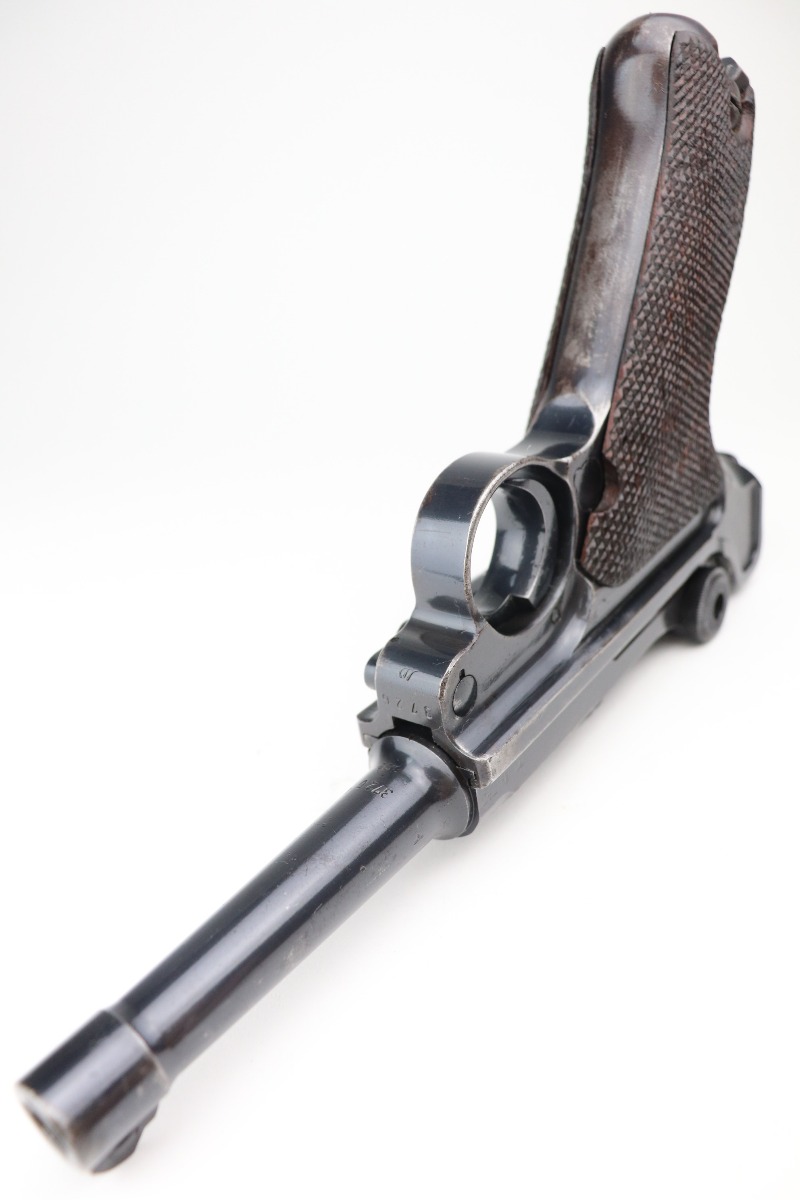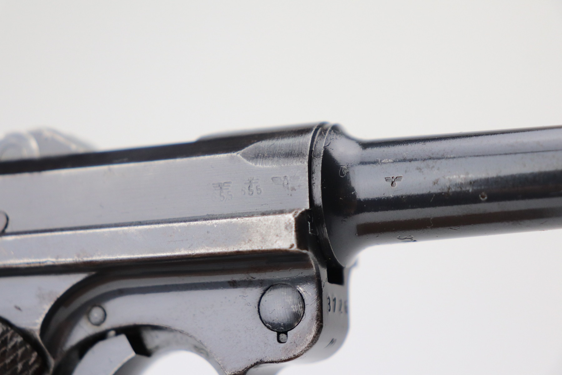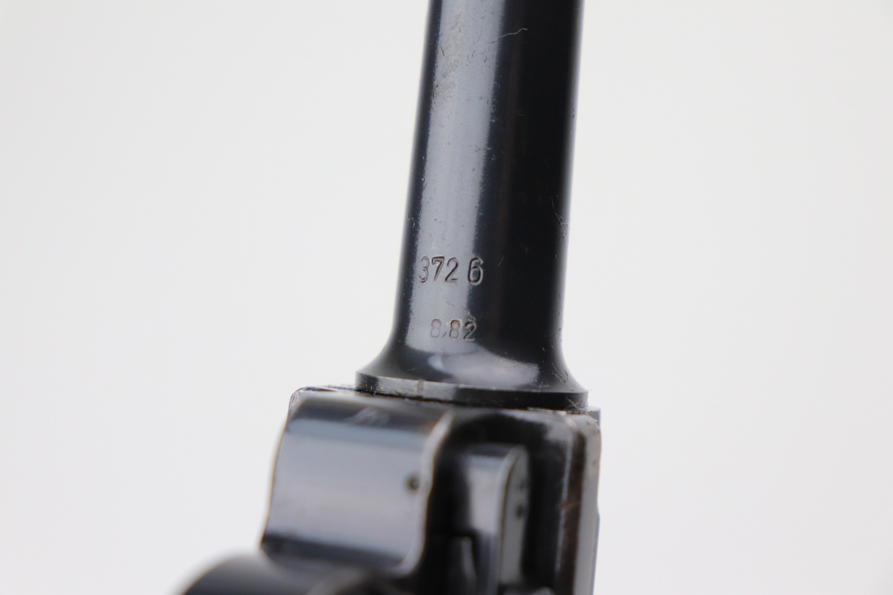 2/9/21 – This is a nice example of a Mauser Luger issued to the Nazi military in 1941. It is all matching and has the proper “Eagle 655” military proofs. It has retained roughly 85% of its original finish. There is minor wear around the muzzle, side plate, and high edges of the frame. Thinning and patina on the straps. Handling marks on the barrel and spotty wear on the left side of the frame. It comes with very nice grips and a period-correct armorer’s replacement magazine. Excellent bore – shiny with strong rifling.