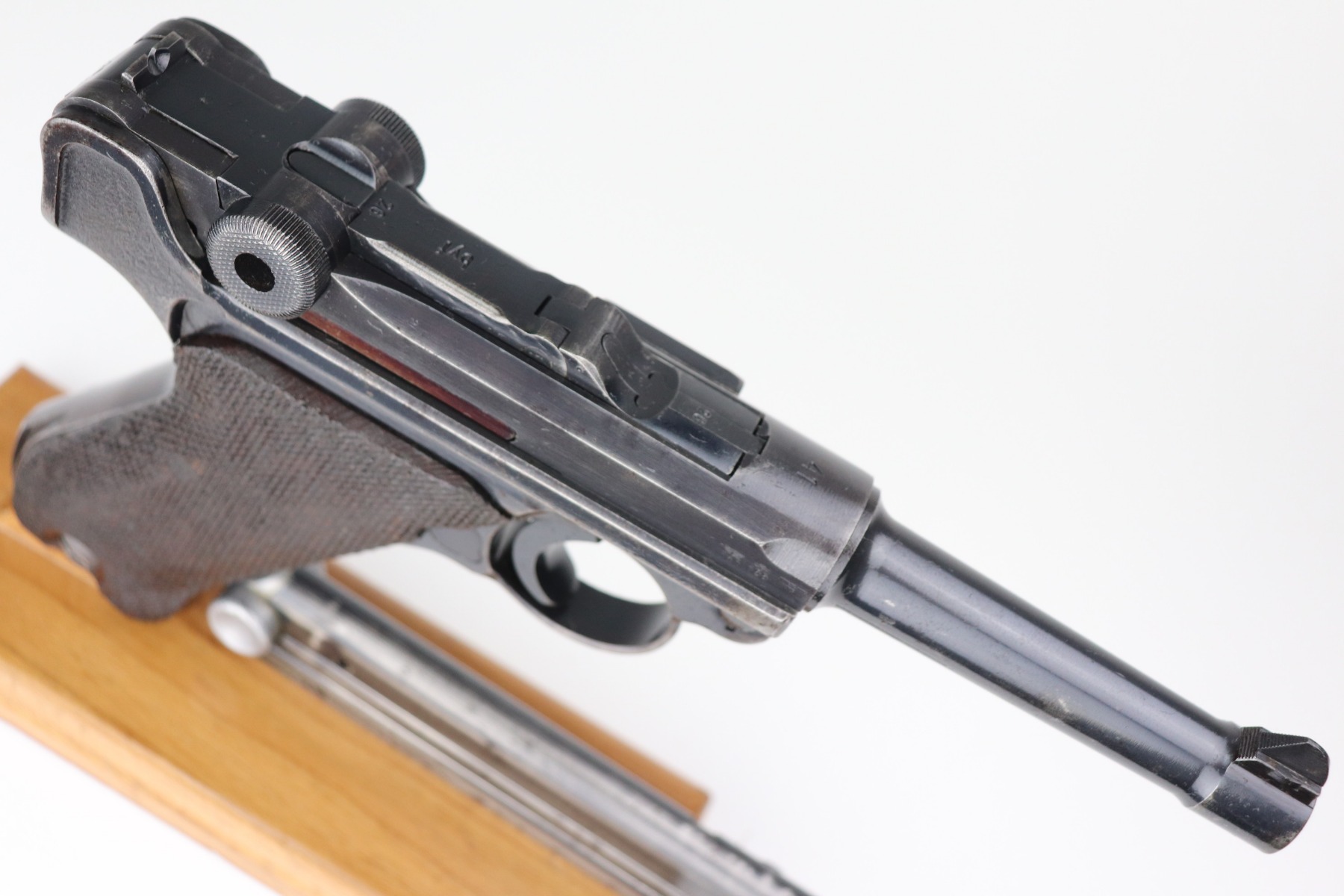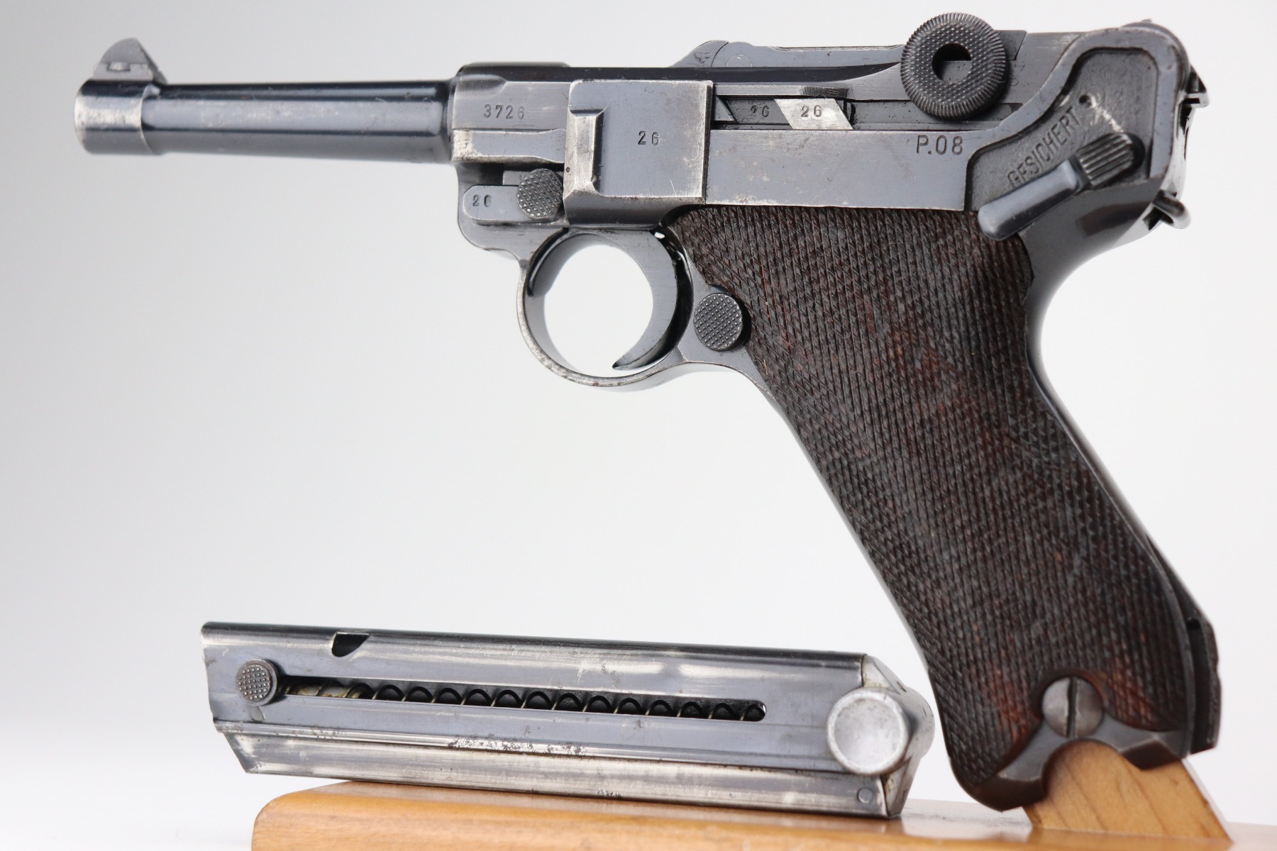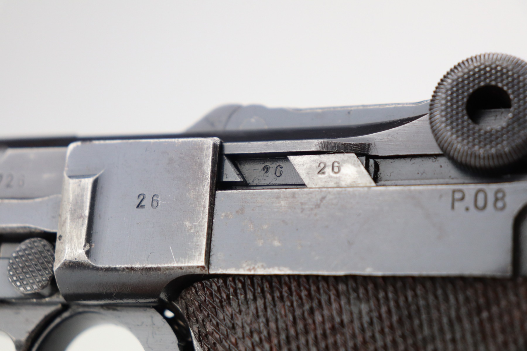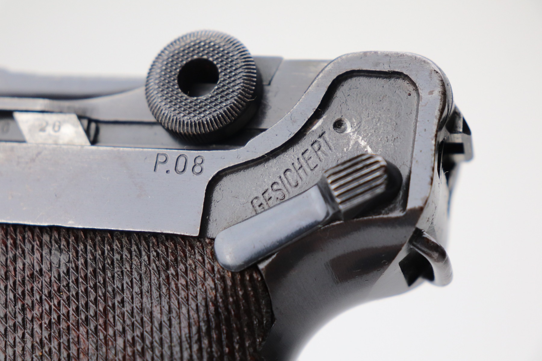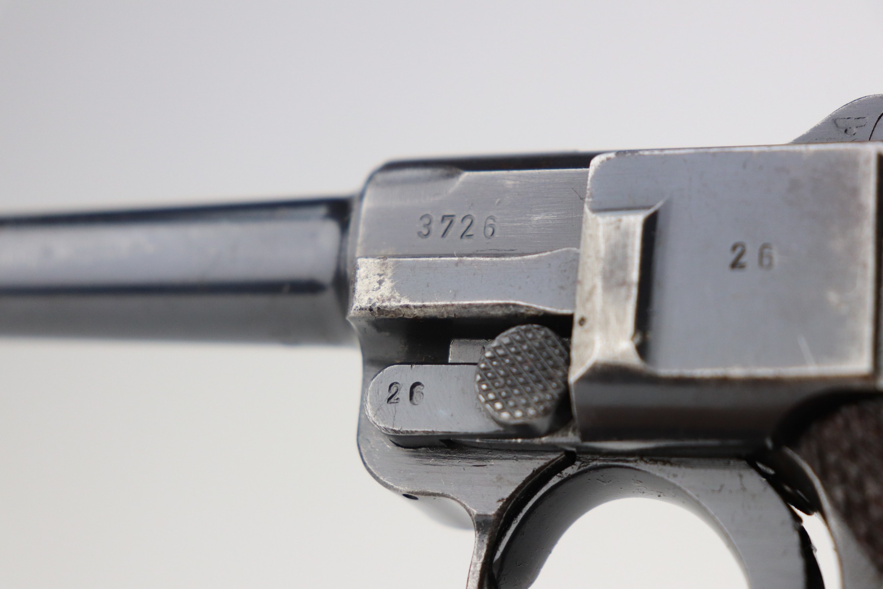 2/9/21 – This is a nice example of a Mauser Luger issued to the Nazi military in 1941. It is all matching and has the proper “Eagle 655” military proofs. It has retained roughly 85% of its original finish. There is minor wear around the muzzle, side plate, and high edges of the frame. Thinning and patina on the straps. Handling marks on the barrel and spotty wear on the left side of the frame. It comes with very nice grips and a period-correct armorer’s replacement magazine. Excellent bore – shiny with strong rifling.