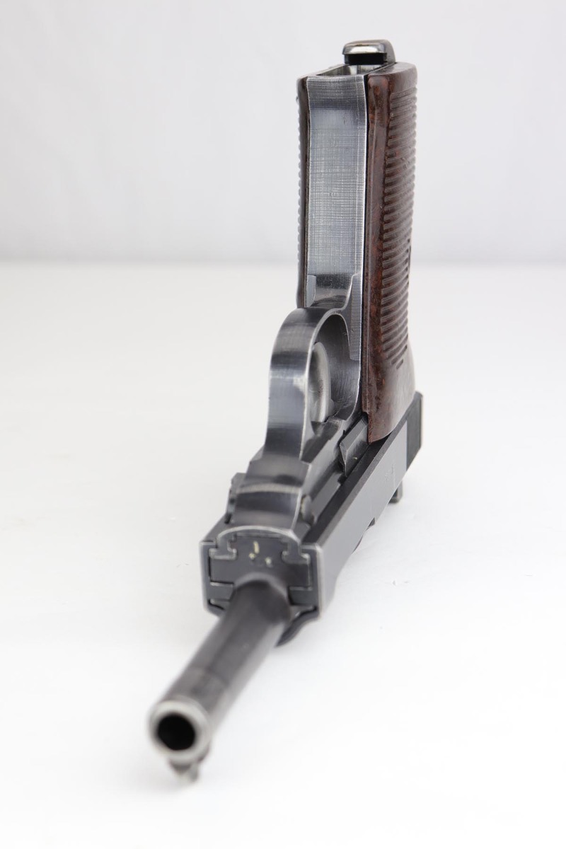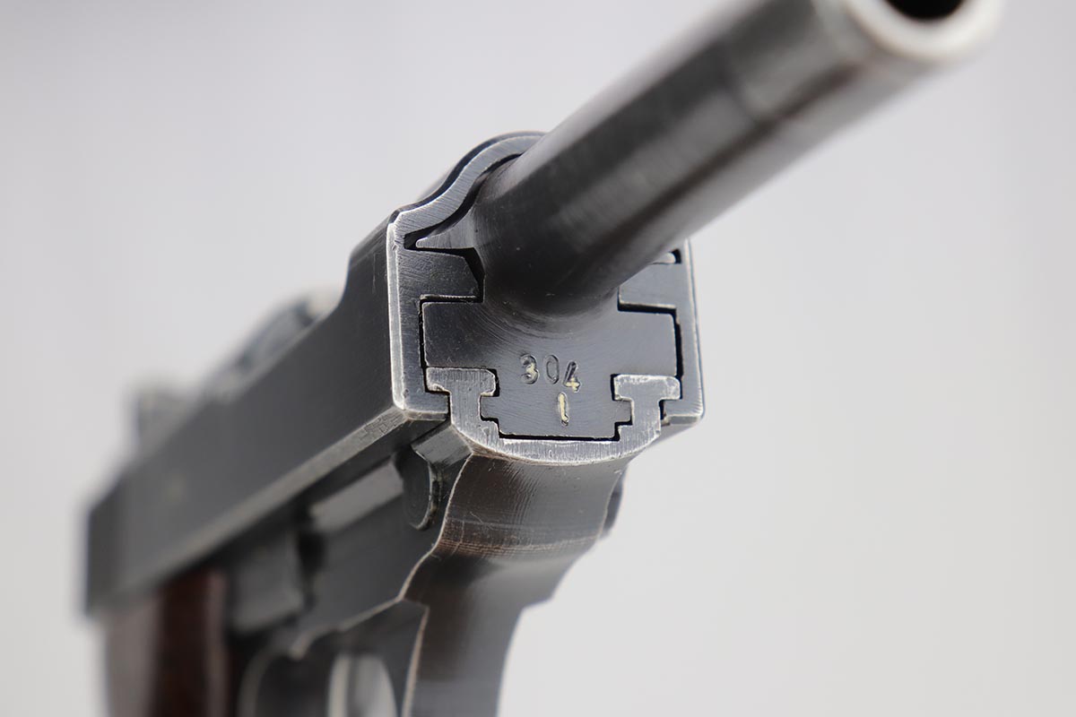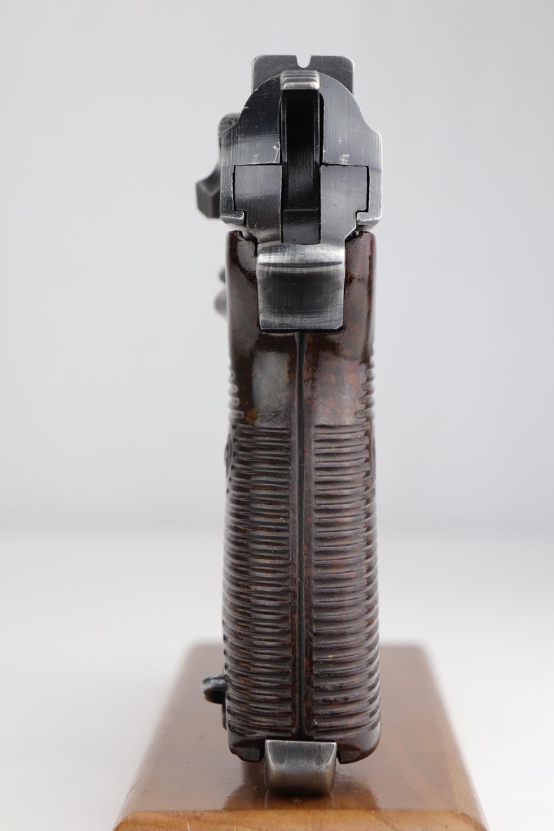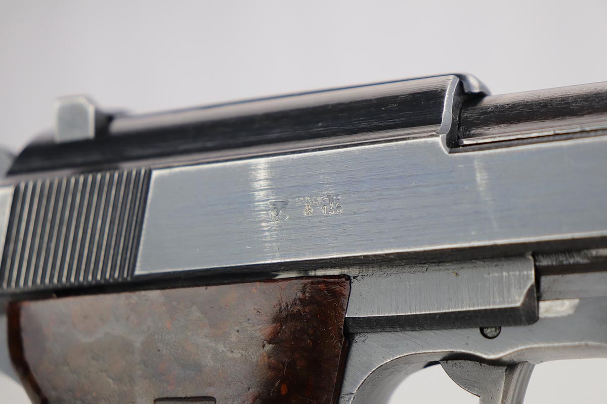 9/24/19 – This is an honest example of an all matching and original Mauser P.38 from October of 1943. The bluing rates at 85-90% with thinning in several areas but the majority of finish loss on the barrel and top plate. Minty bore and proper mechanics, including de-cocker, so this one could be a good candidate for a shooter. Excellent reddish grips. Mauser magazine.