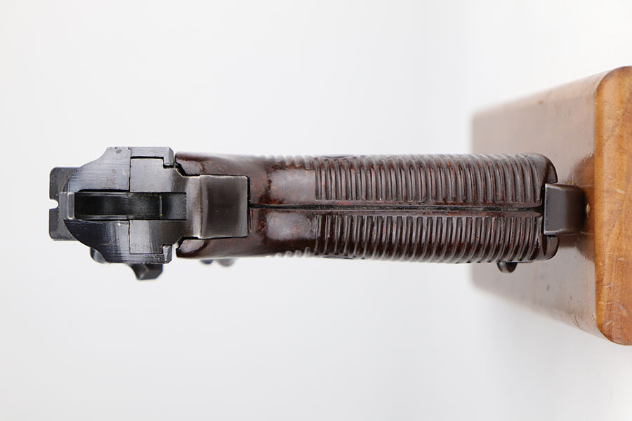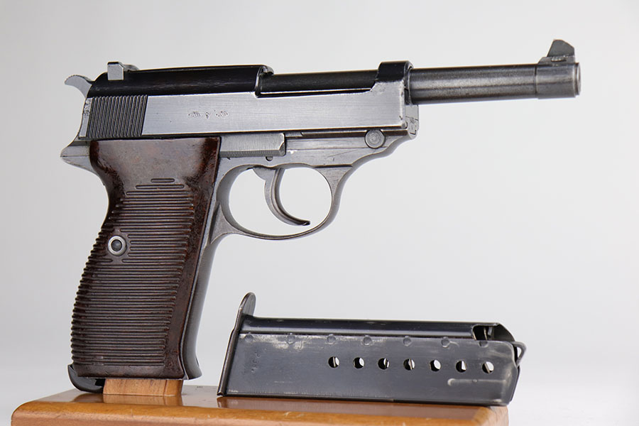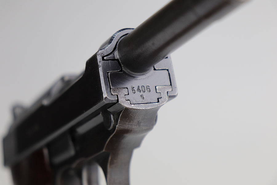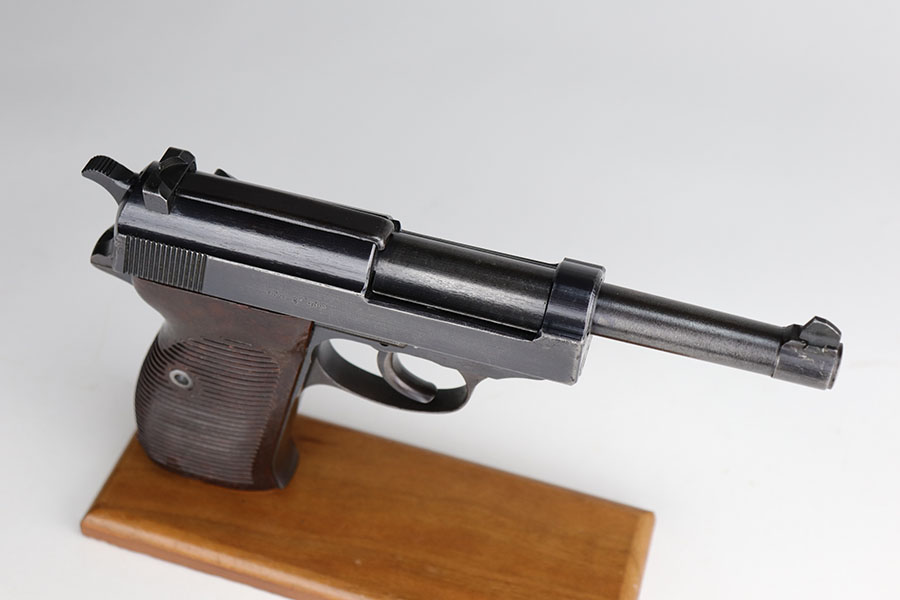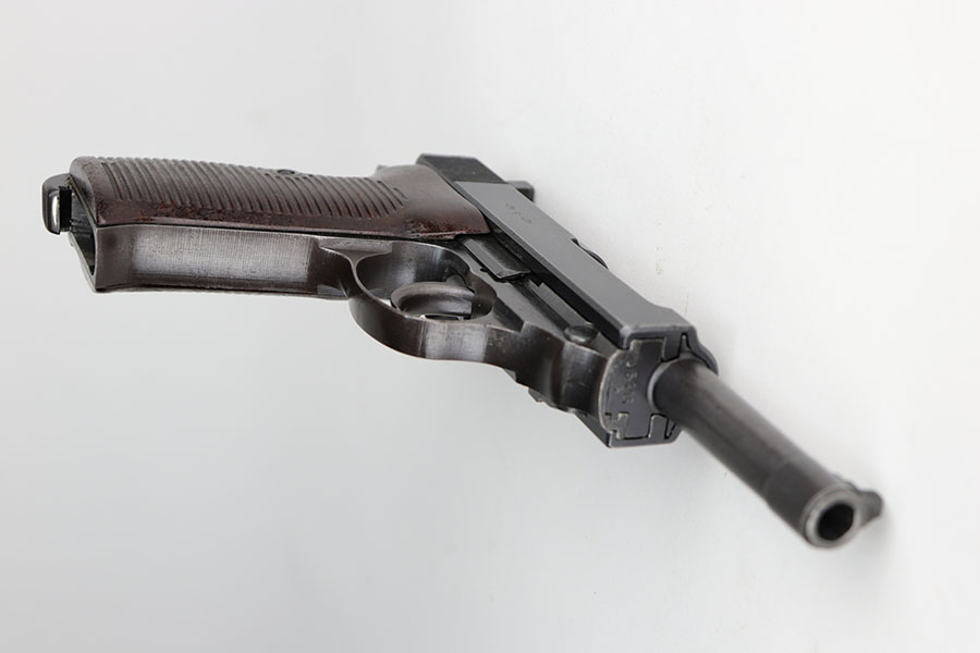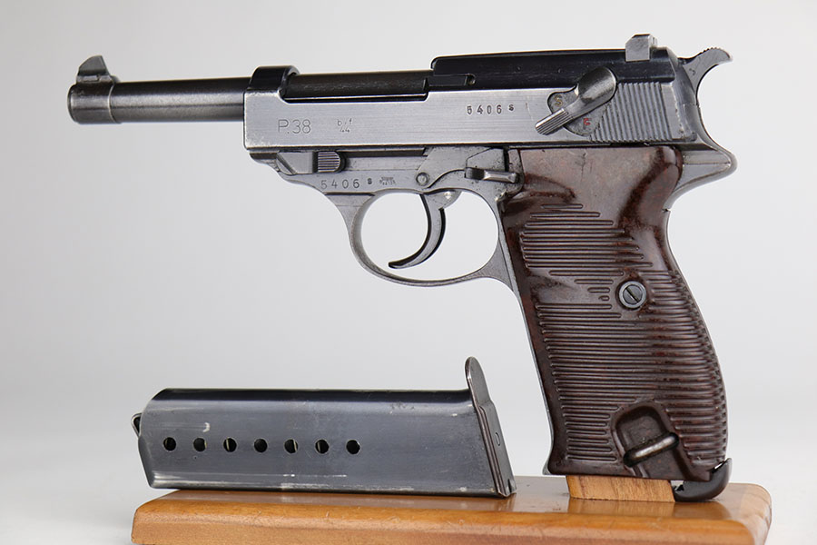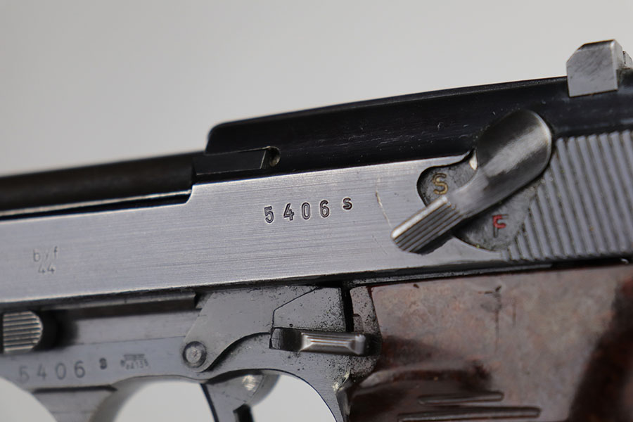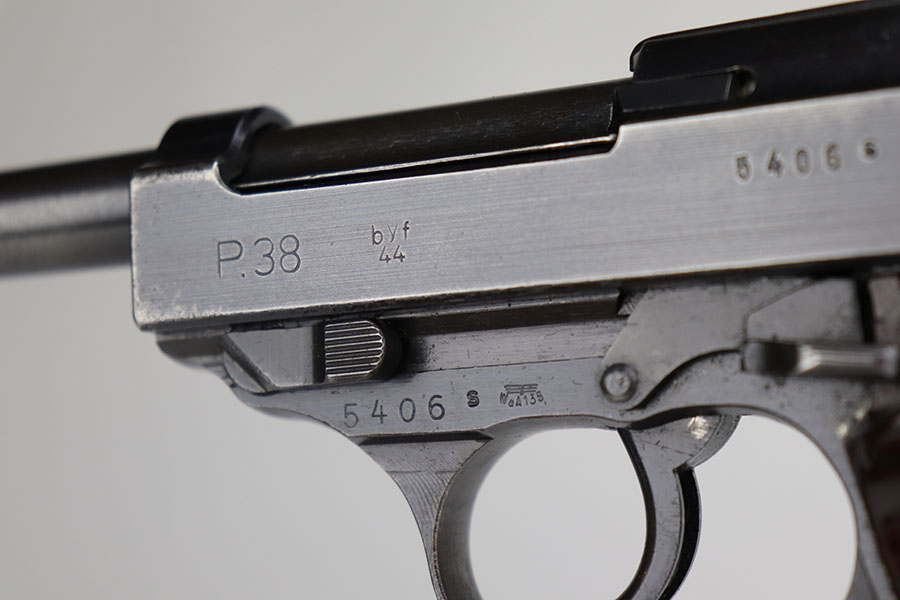 12/1/20 – This is an excellent example of a Mauser P.38 issued to the Nazi military in 1944. It is all matching and has the proper “Waffen 135” Nazi military acceptance proofs. This one has retained about 95% of its original finish. There is minor muzzle wear, wear on the front edges of the slide, and thinning on the front strap. There is spotty oxidation on the front strap and areas of minor pitting on the front and back edges of the slide. Comes with excellent reddish grips and a period-correct magazine. The bore has good rifling, but there are areas of freckling throughout.