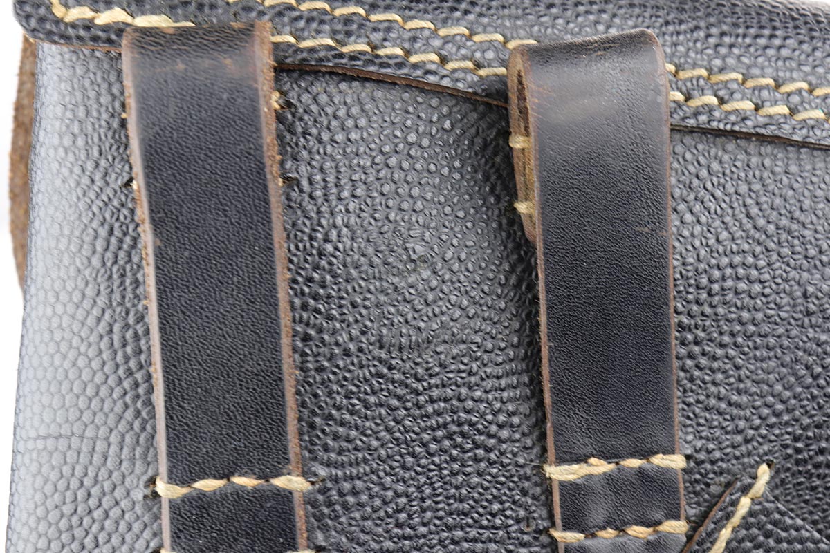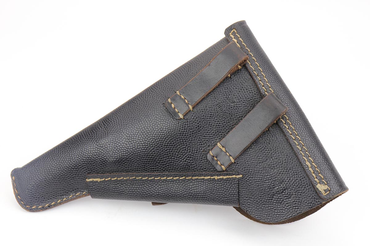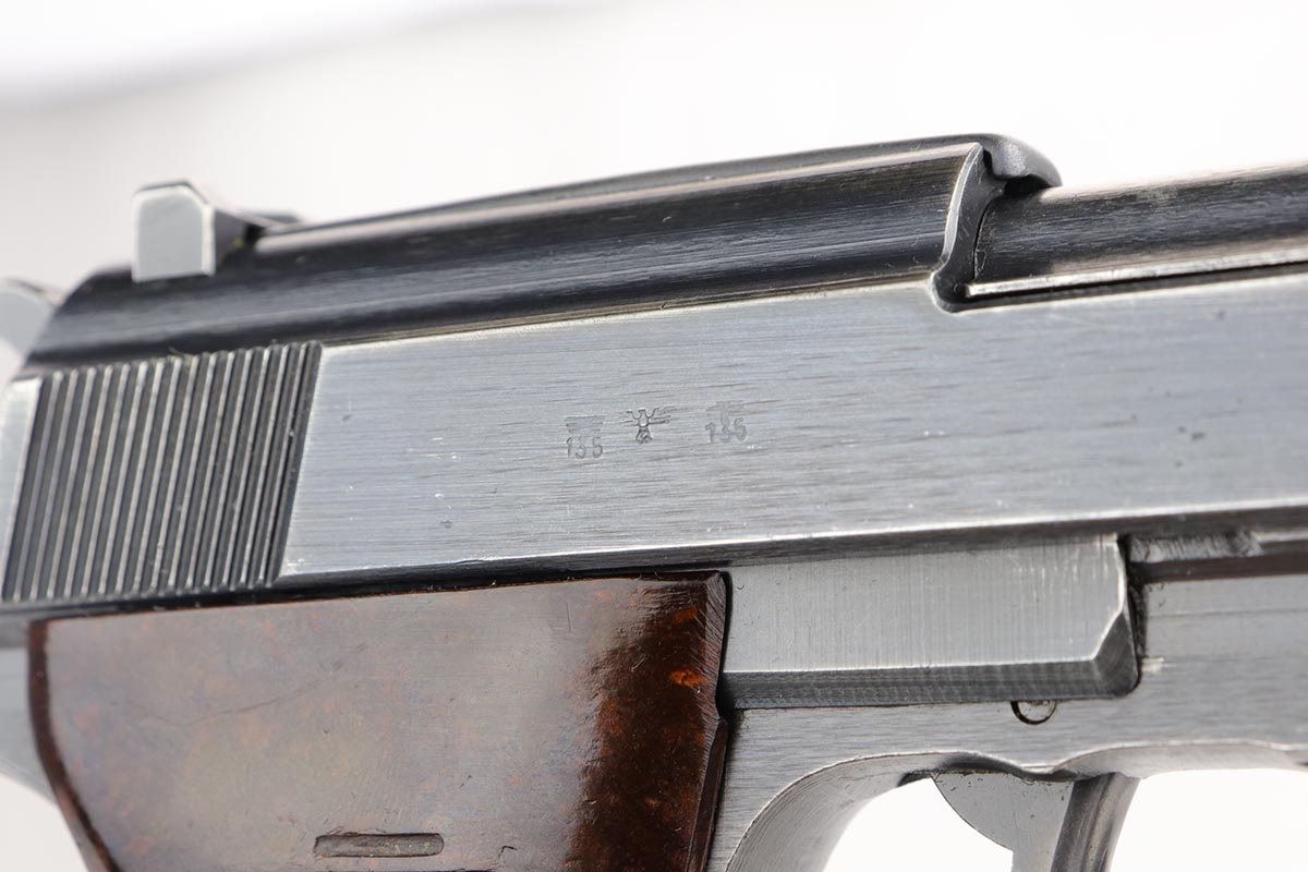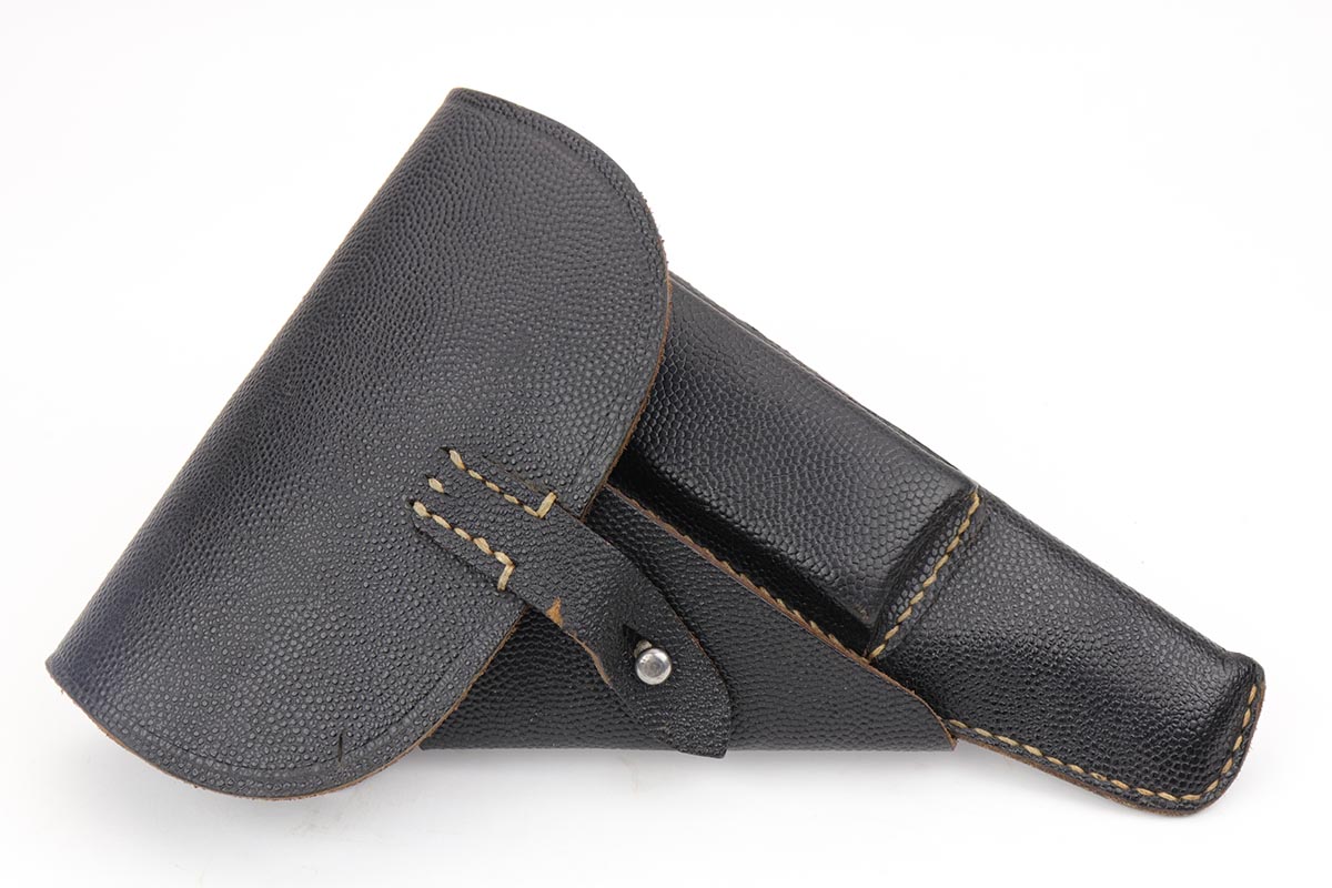 11/22/19 – This is a complete Mauser P.38 rig from December of 1944. The pistol is all matching and has a nice, honest look to it. There’s minor thinning throughout, most notably on barrel and front strap, but it’s uniform wear. Pistol has a mint bore and good mechanics, so would be a nice shooter. Excellent reddish grips. Rig includes two total magazines. One magazine is Mauser, one is Walther. The rig is completed by a minty, softshell holster. It’s got a pebble grain texture, with ’44 date on the back and faint waffenamt.