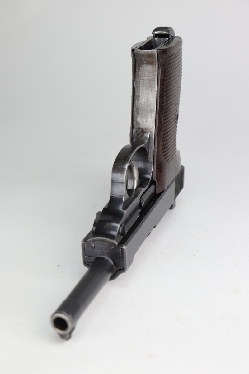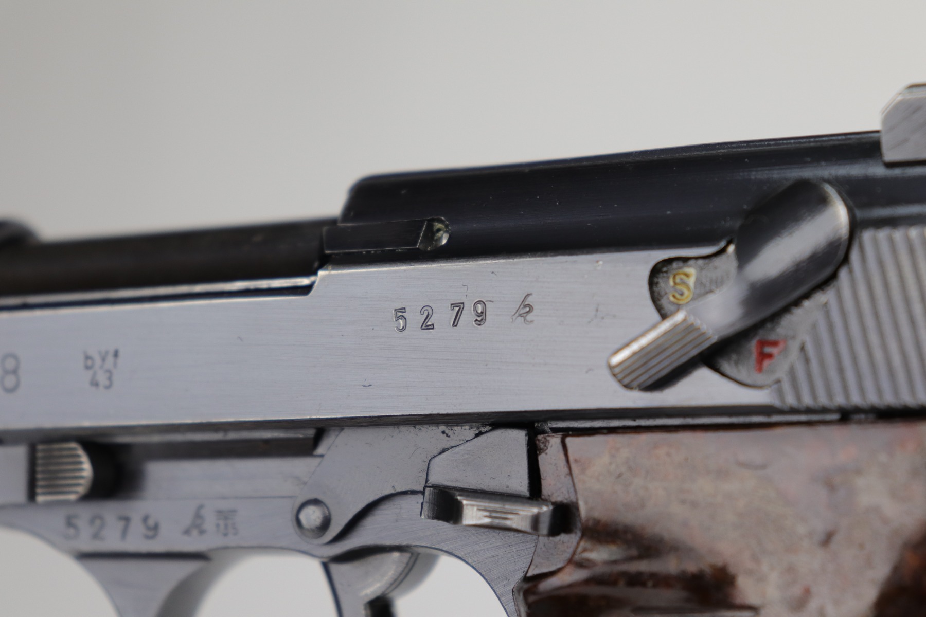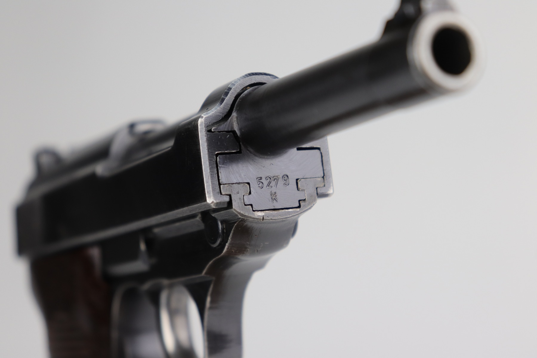 10/13/20 – This is a Mauser P.38 rig issued to the Nazi military in 1943. It is all matching and has the proper “Eagle 135” Nazi military acceptance proofs. It comes with a very nice, 1943-dated, waffenamt holster and two period-correct magazines. It has retained somewhere between 80-85% of its original finish. Most of the wear is on the front strap and underside of the trigger guard. There is also minor muzzle wear, wear on the high edges of the slide, and one small spot of wear on the right side of the slide. Excellent original grips. The bore is shiny and has very strong rifling – there are just areas of freckling. The de-cocker works, but the slide does not stay back with either magazine. It works if you manually engage the slide stop.