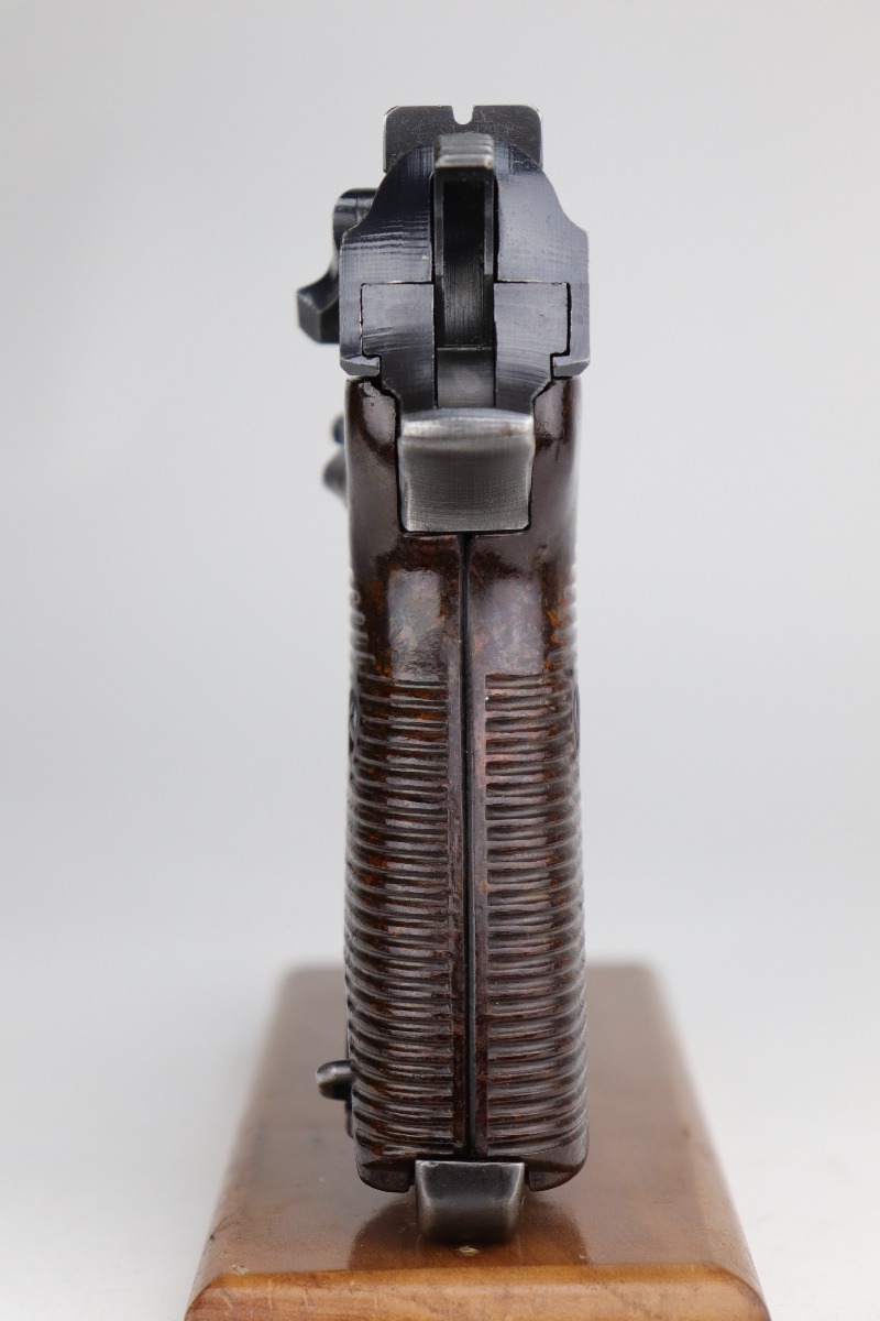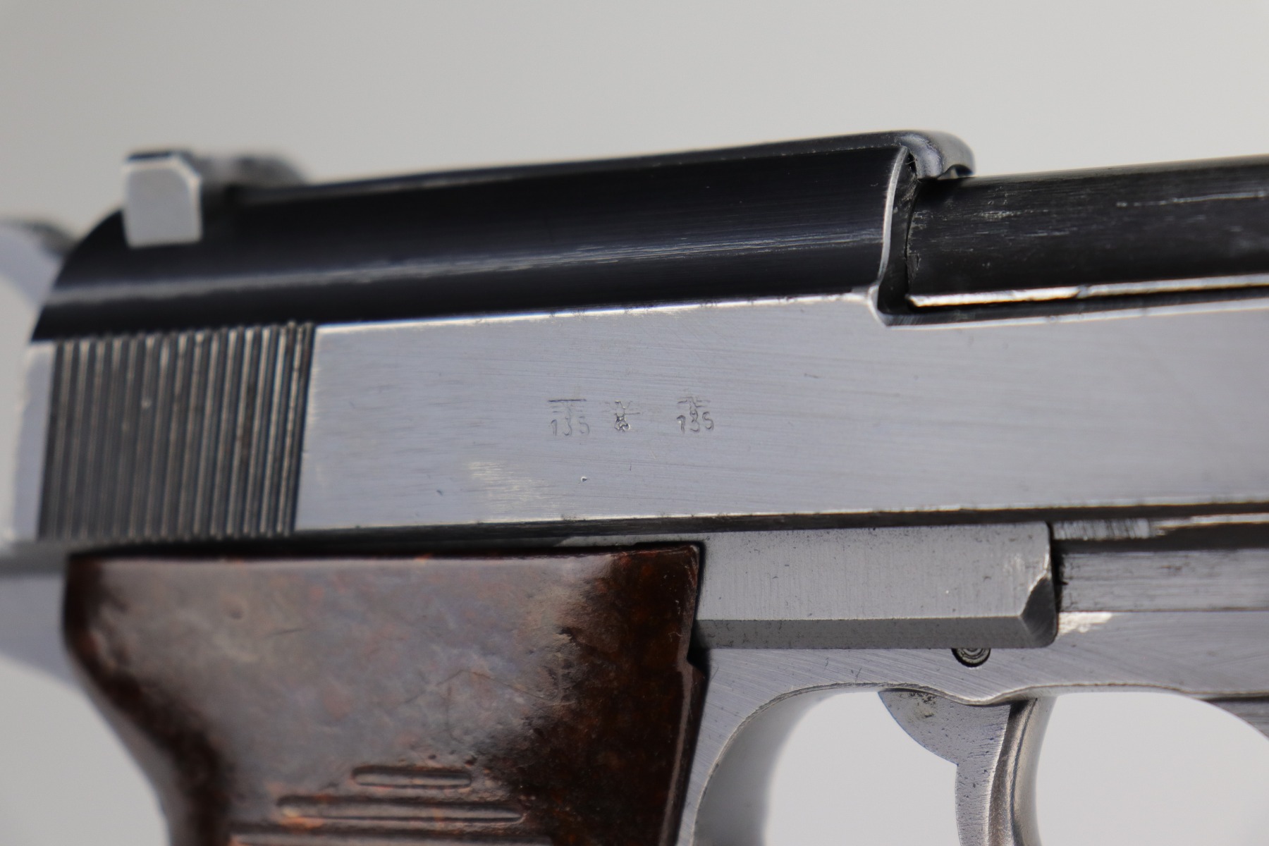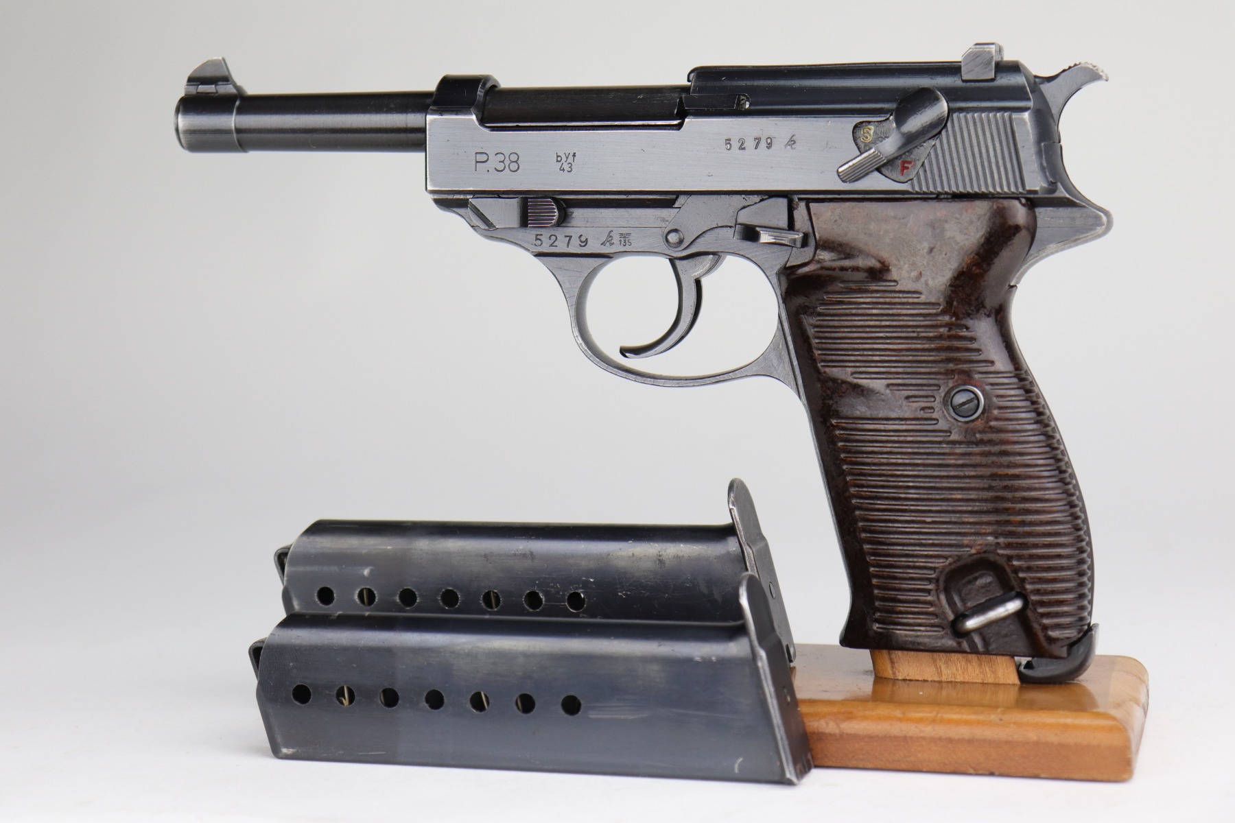 10/13/20 – This is a Mauser P.38 rig issued to the Nazi military in 1943. It is all matching and has the proper “Eagle 135” Nazi military acceptance proofs. It comes with a very nice, 1943-dated, waffenamt holster and two period-correct magazines. It has retained somewhere between 80-85% of its original finish. Most of the wear is on the front strap and underside of the trigger guard. There is also minor muzzle wear, wear on the high edges of the slide, and one small spot of wear on the right side of the slide. Excellent original grips. The bore is shiny and has very strong rifling – there are just areas of freckling. The de-cocker works, but the slide does not stay back with either magazine. It works if you manually engage the slide stop.