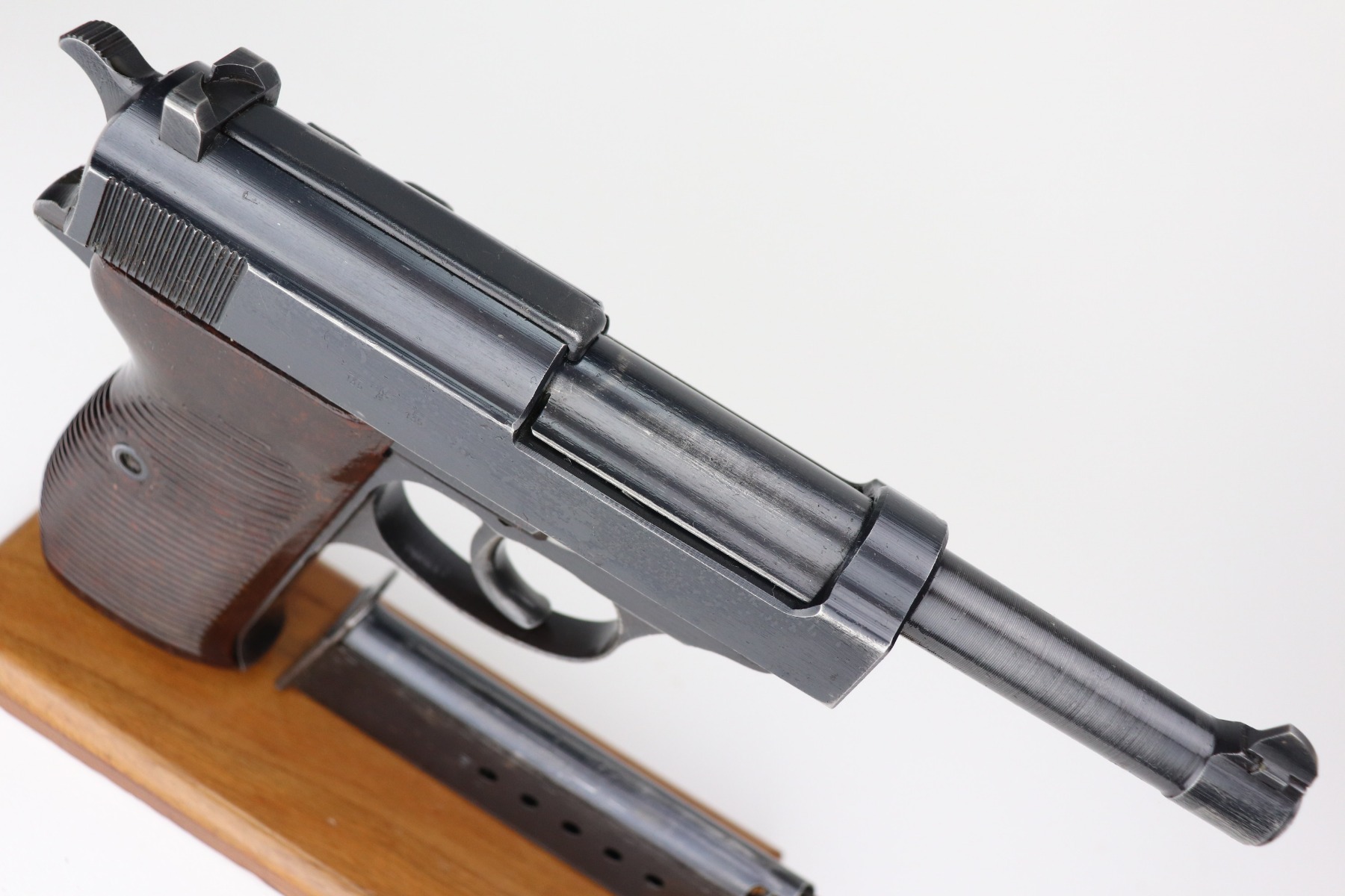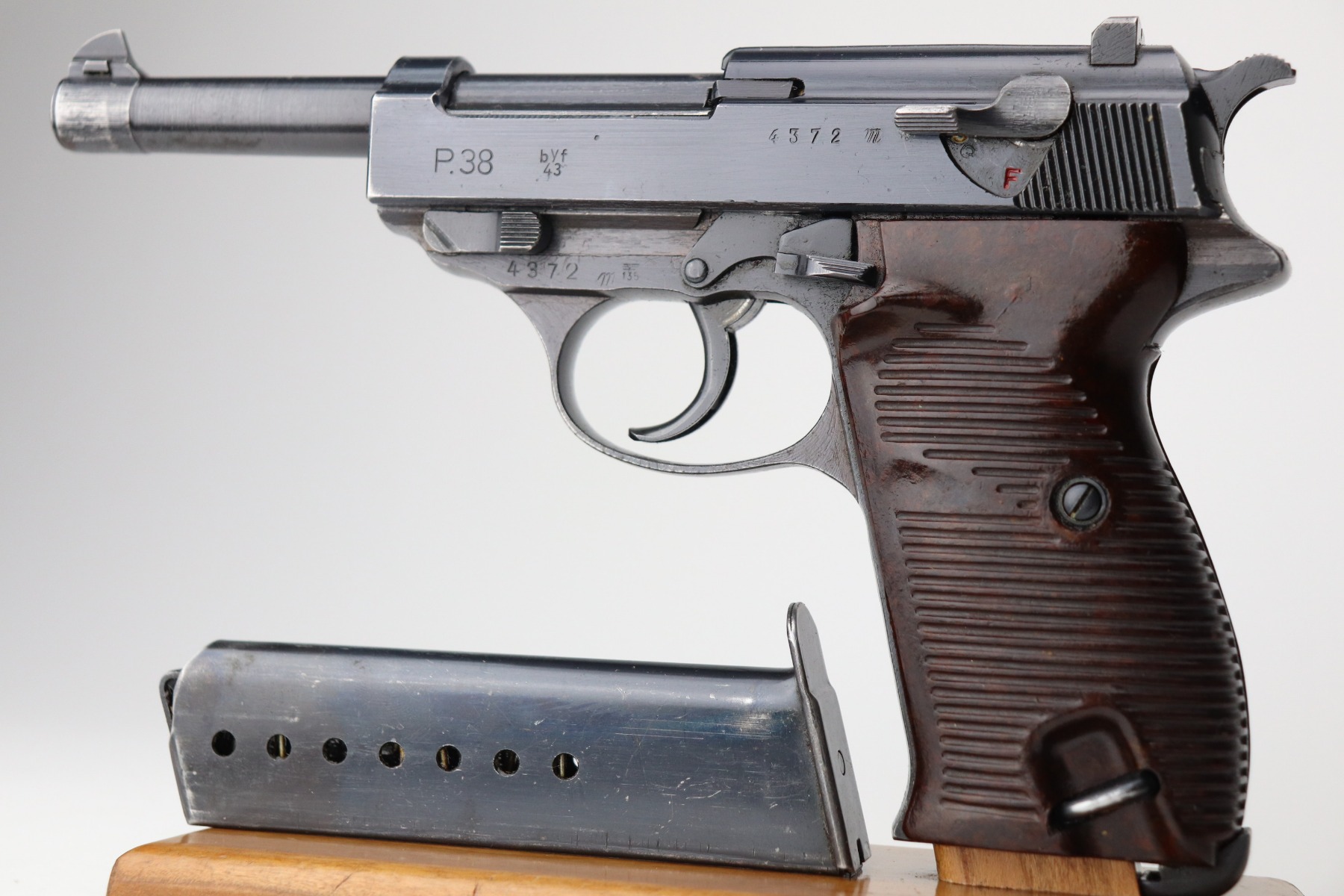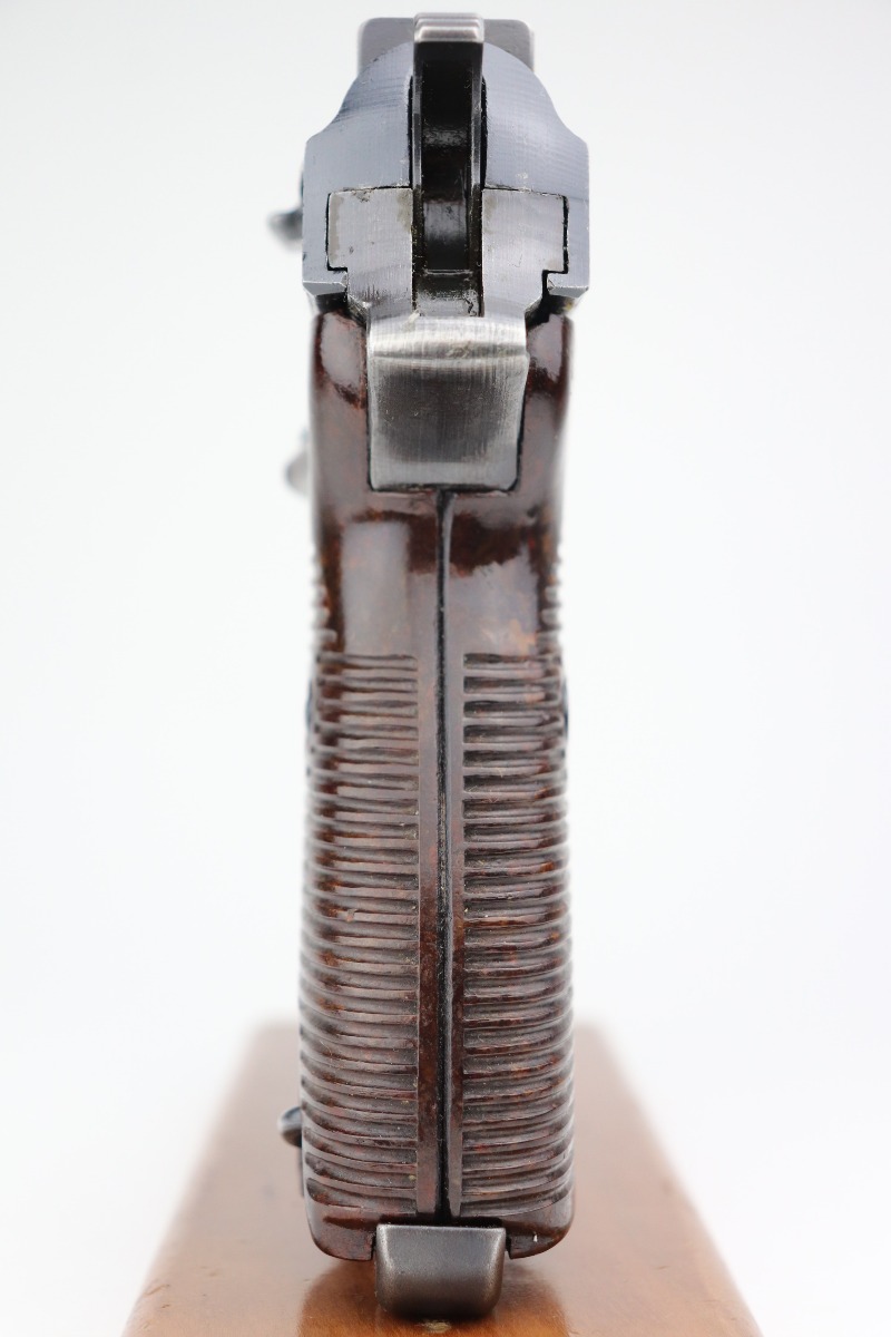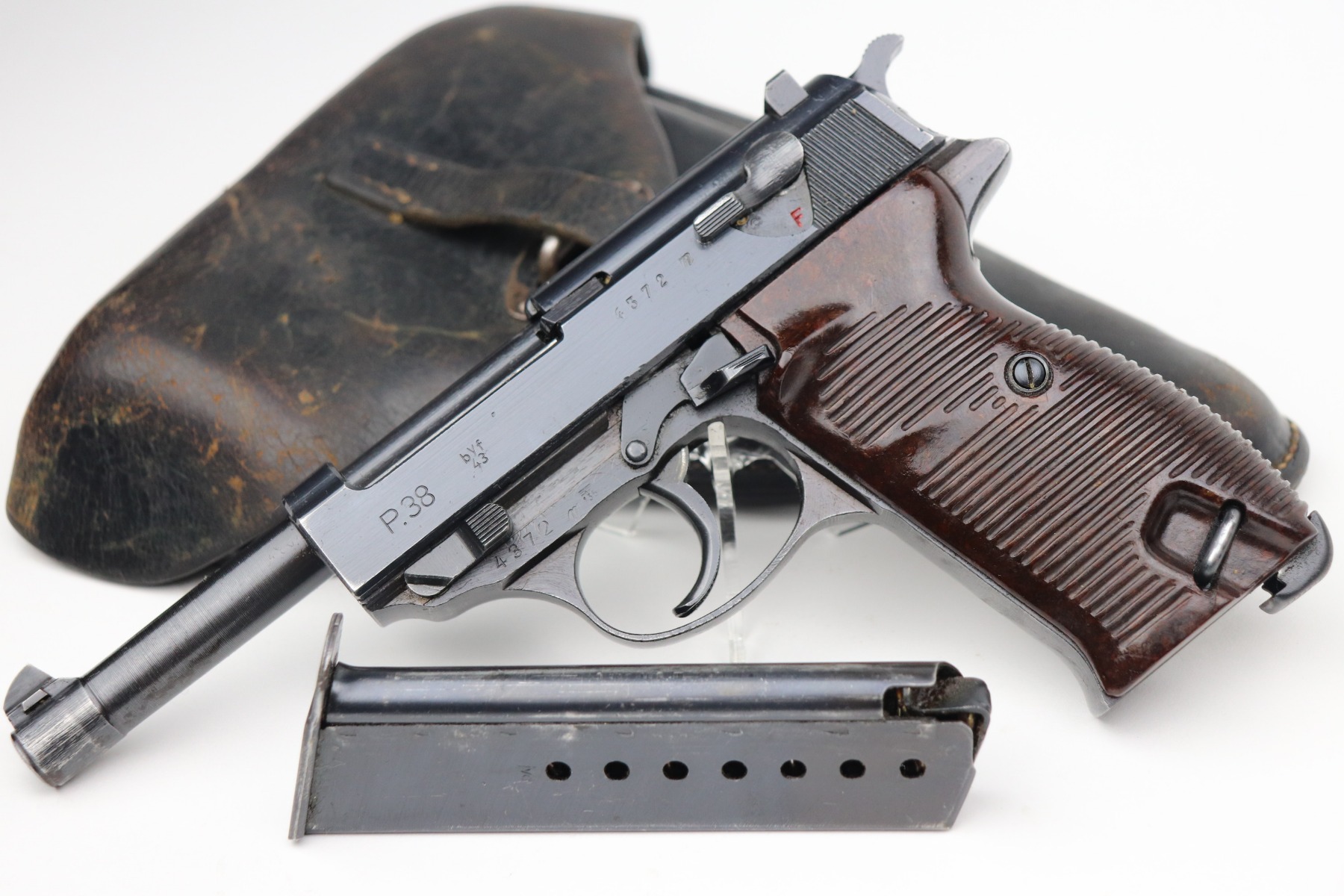 2/10/21 – This is a very nice example of a Mauser P.38 issued to the Nazi military in 1943. It is all matching and has the proper “Eagle 135” military proofs. The rig comes with one period-correct magazine and a 1943-dated holster (inside strap may have been replaced). The gun has retained about 90% of its original finish. There is minor wear around the muzzle and high edges of the slide. Thinning and spotty oxidation on the barrel and front strap. Excellent grips. Excellent bore – very shiny with strong rifling with just very minor freckling here and there. The de-cocker is fully functional.