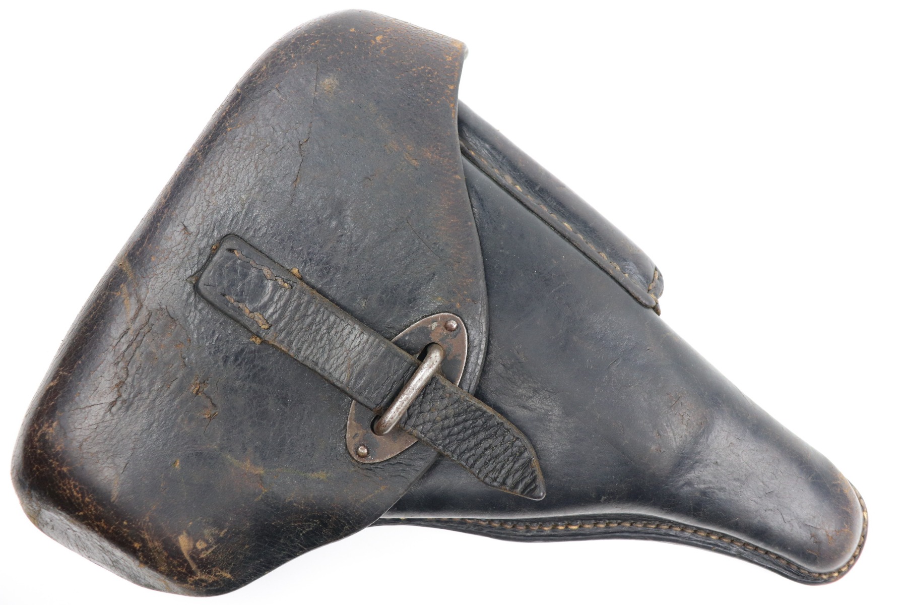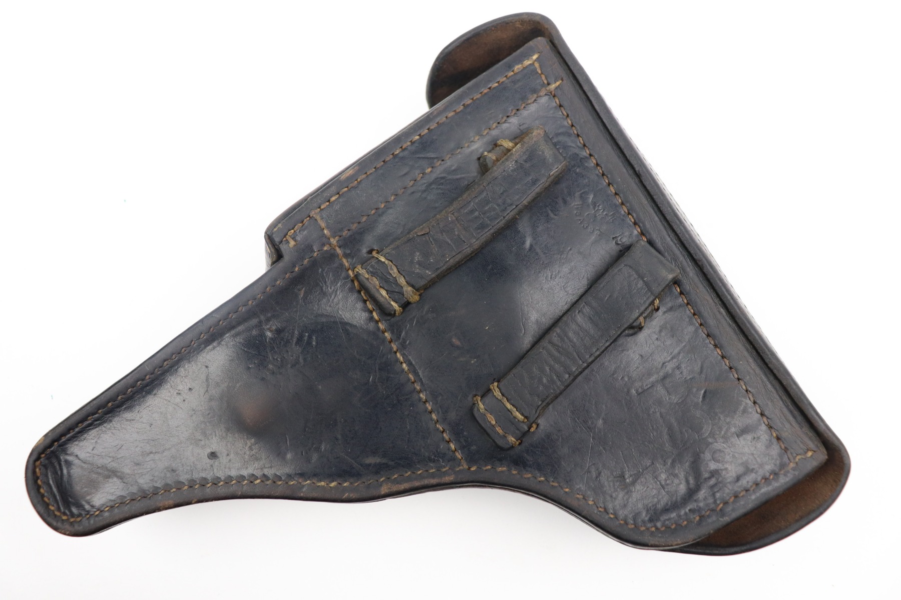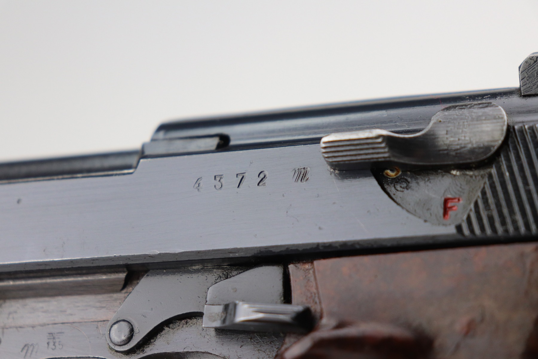 2/10/21 – This is a very nice example of a Mauser P.38 issued to the Nazi military in 1943. It is all matching and has the proper “Eagle 135” military proofs. The rig comes with one period-correct magazine and a 1943-dated holster (inside strap may have been replaced). The gun has retained about 90% of its original finish. There is minor wear around the muzzle and high edges of the slide. Thinning and spotty oxidation on the barrel and front strap. Excellent grips. Excellent bore – very shiny with strong rifling with just very minor freckling here and there. The de-cocker is fully functional.