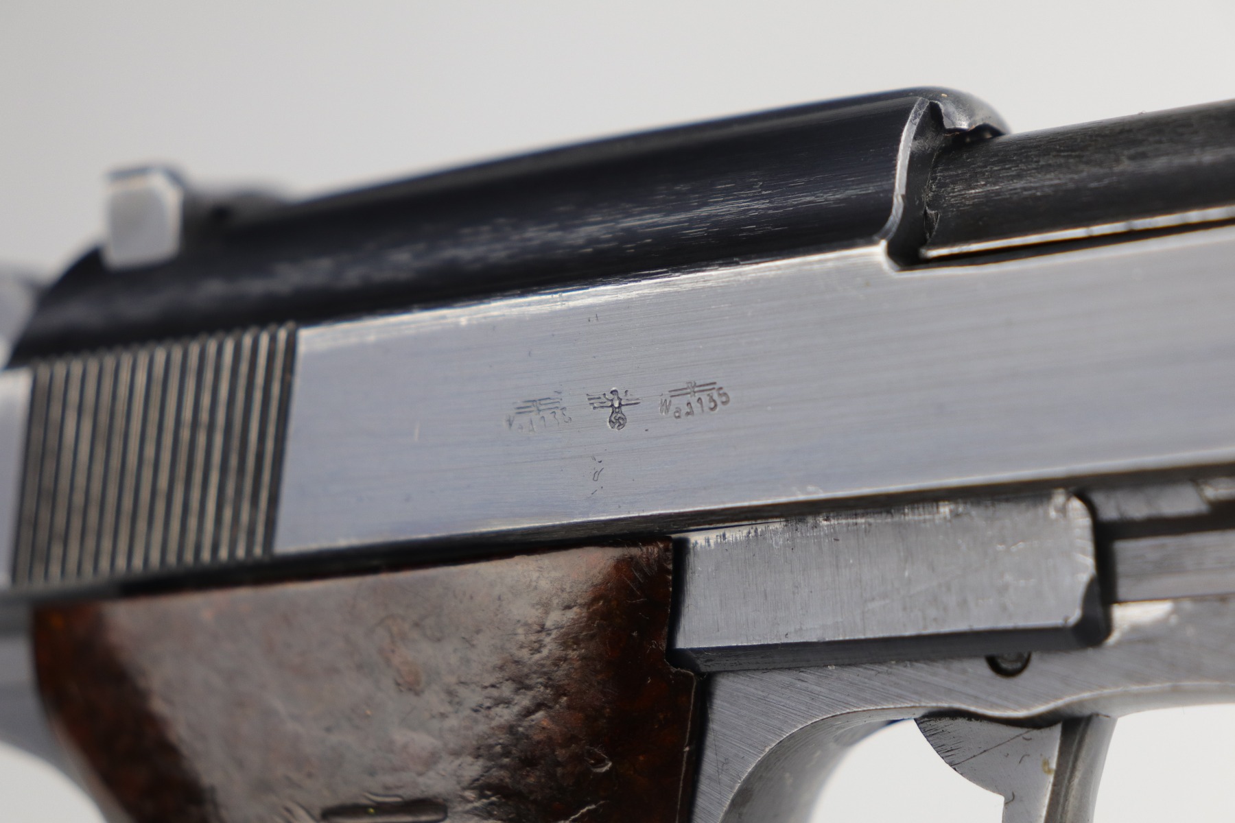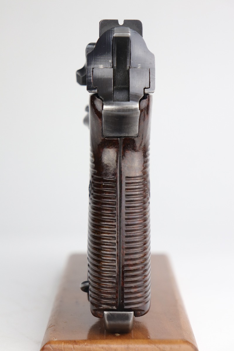 9/3/20 – This is a very nice example of an original WW2 Mauser P.38 rig issued to the Nazi military in 1944. The rig comes with an excellent holster and two period-correct magazines. The gun is all matching. The de-cocker is fully functional. It has retained about 93-94% of its original finish. There is very minor muzzle and high edge wear throughout, thinning on the front strap, and minor wear on the barrel in the ejection port. Excellent grips. Minty bore. The holster is excellent and dated 1944.