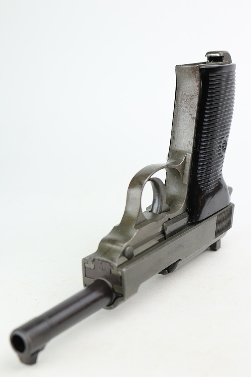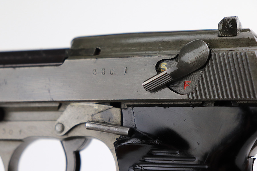 6/13/24 – This is a rare Nazi Mauser P.38 with ‘svw 45’ slide code, indicating it was made at the French Mauser factory but issued and accepted into the German military. There were only ~7,800 of this variation produced with dual-tone finish. It is all matching and has the proper “Waffen 135” military acceptance proofs throughout. The phosphate is difficult to rate, but it looks like there is very little finish loss – just spotty oxidation and discoloration throughout. The barrel has been refinished with noticeable pitting under the bluing throughout. Comes with proper black plastic Mauser grips – there are light scratches throughout, and they have been cut down. Comes with a period-correct jvd magazine. Excellent, shiny bore. De-cocker is functional.