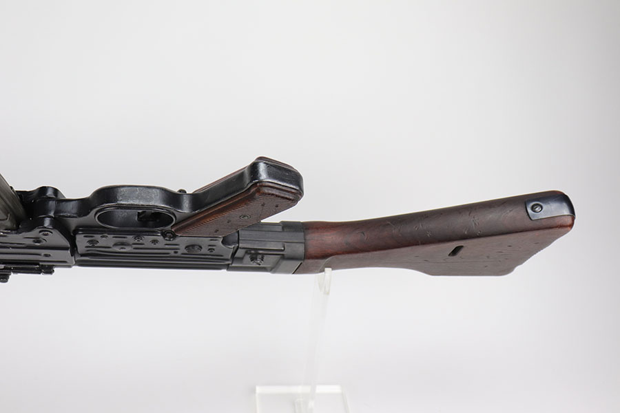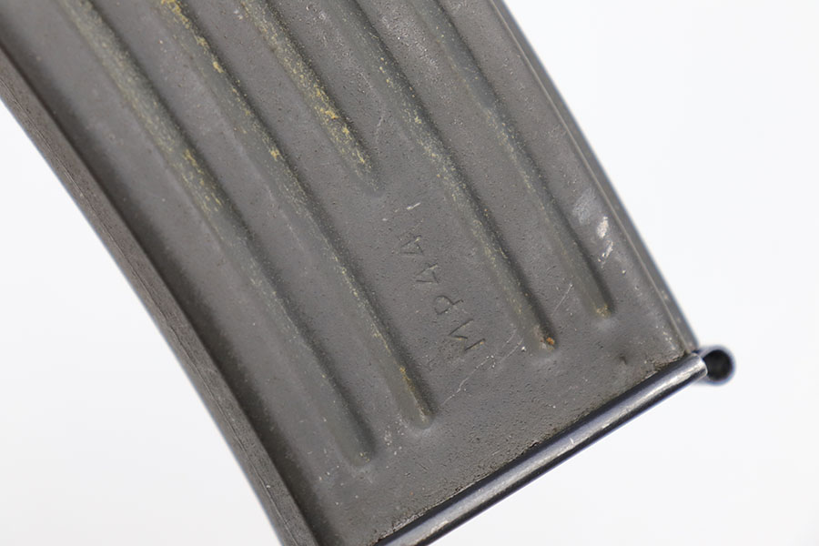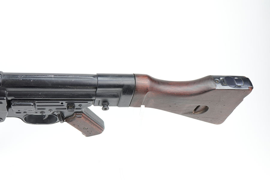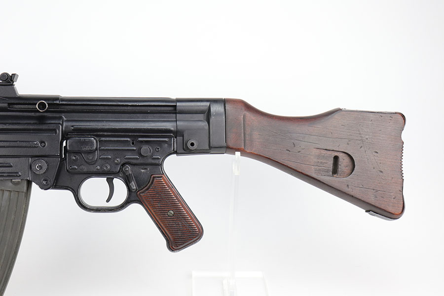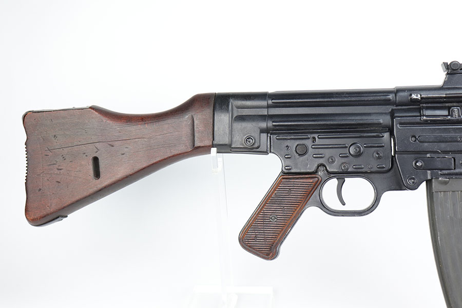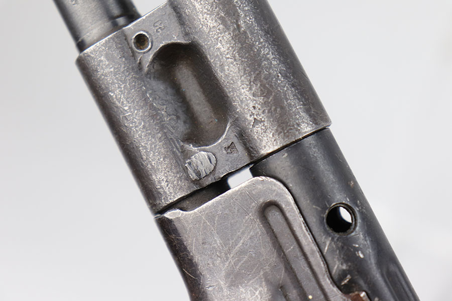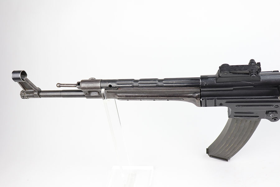 9/2/20 – This is a decommissioned Nazi MP 44 Sturmgewehr from World War II. We are not experts on these but this one has WaA21 proof on left side of receiver and otherwise no proofs I can find, including serial number or model marking. The receiver has definitely been painted/refinished and does have some pitting under the finish in several areas. Haven’t opened the receiver to exactly see how this is decommissioned but appears receiver is cut, and bolt does not move. Barrel is not plugged though. Magazine is marked MP 44 on the side and CHN on the bottom. Wood parts have some handling wear but no cracks or chips. Note that the magazine is loose in the gun.