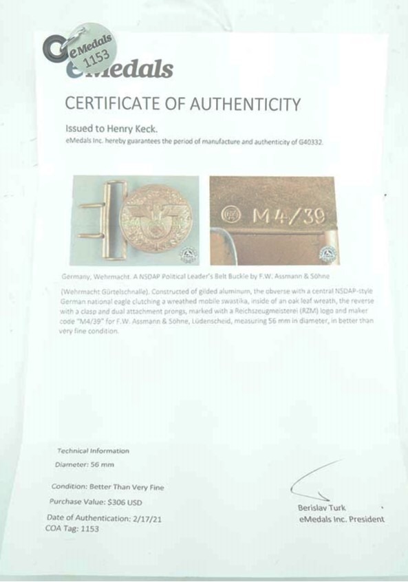 11/11/24 – This is an original WW2, aluminum, Party Leader belt buckle made by F.W. Assman & Sohne. The buckle is made from lightweight aluminum material and is in great condition. The gold wash finish is original and there is some minor wear on the eagle body. The interior is RZM and “M4/39” stamped. This belt buckle additionally comes with a letter of authenticity from eMedals that came from the prior owner.