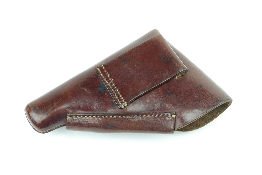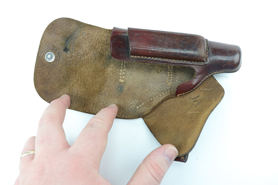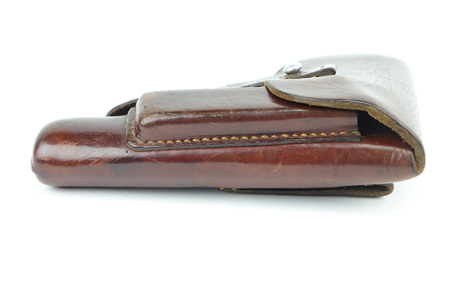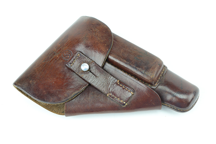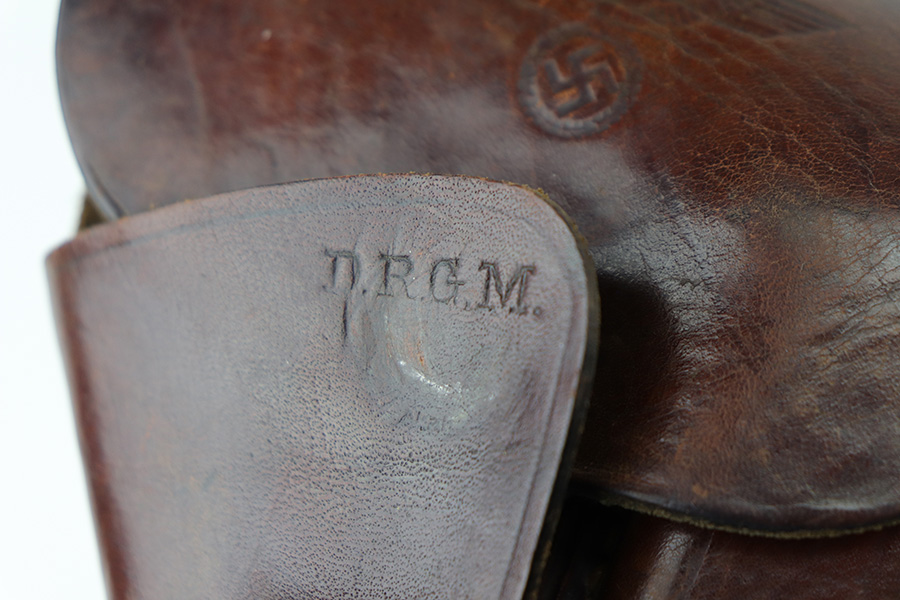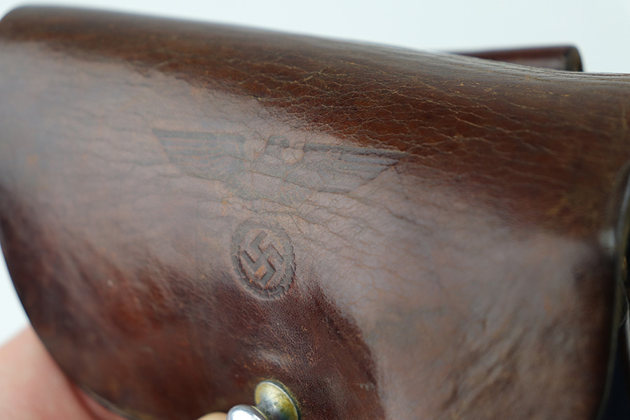 10/08/21 – This is an excellent example of a Party Leader Holster that would pair with the Party Leader Walther PPK honor weapon. This excellent brown leather holster was made by Akah and features the classic Nazi Party Leader Eagle insignia prominently on the top flap. This insignia has faded slightly overtime but is still visible and obvious. The bottom half of the Akah makers mark on the inner flap is worn from the closure knob, but the “DRGM” marking is visible and sharp. Overall, the holster is in excellent condition. The leather is soft and malleable. The closure strap is intact and functional with a slightly amount of cracking around the whole. There is some wrinkling in the leather on the round edge of the top flap (very typical). Finally, there are just some light surface scuffs here and there. Excellent example and would go great with any Party Leader or RZM marked Walther PPK.