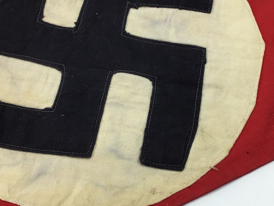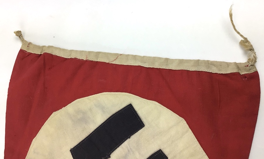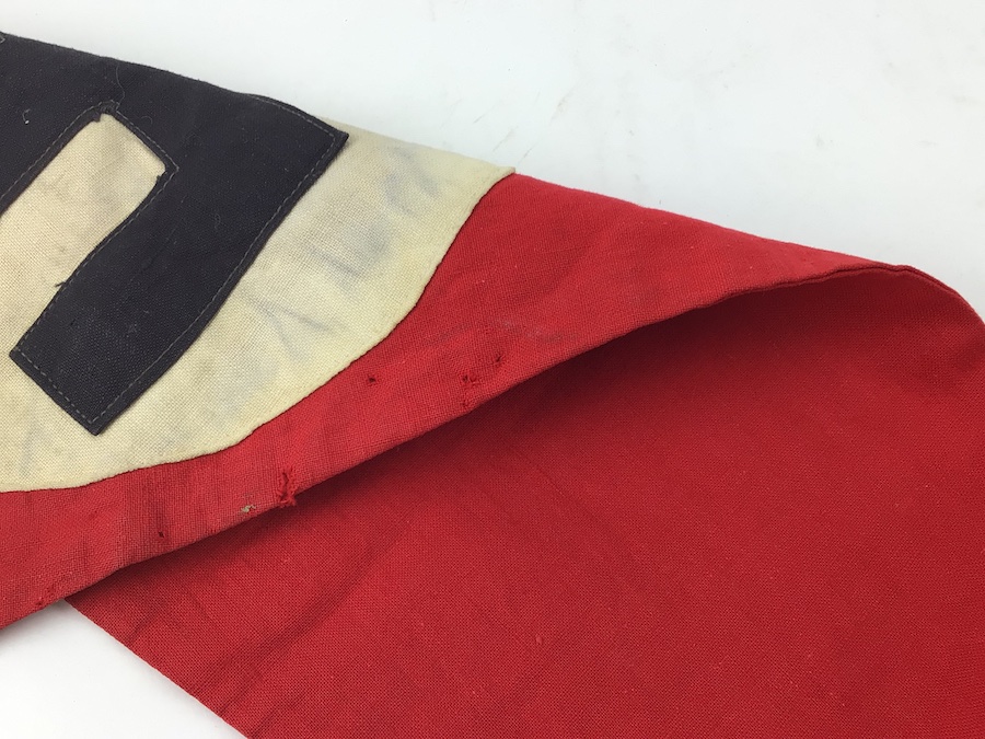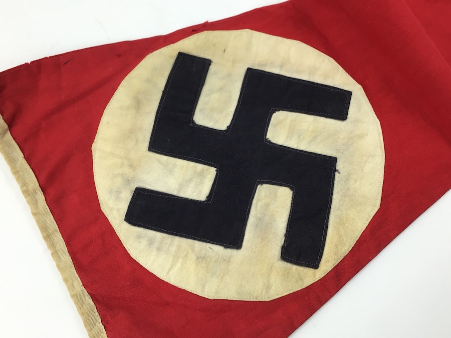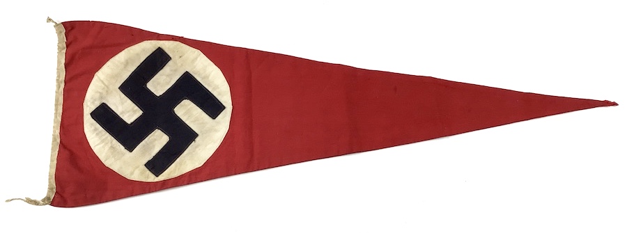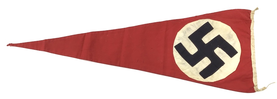 6/4/21 – This is an original WW2 production Nazi pennant flag. The flag is double sided and in very good, original condition with the original string. The string is slightly frayed. The flag measures 27 inches long x 9-1/2 inches and has minor staining along with some age wear. Guaranteed original.