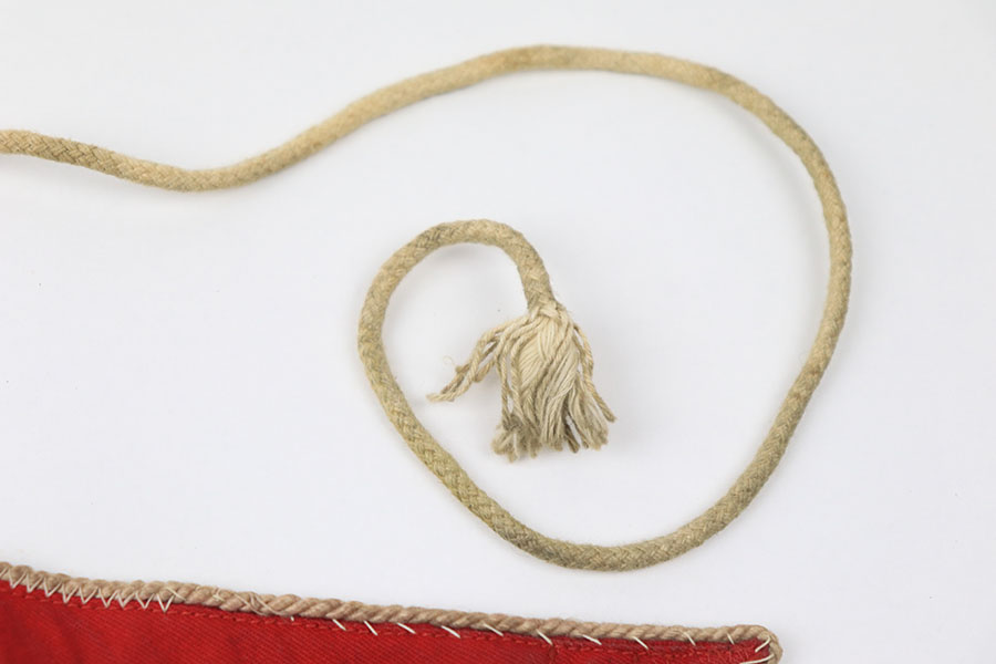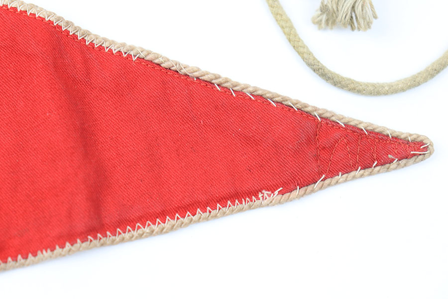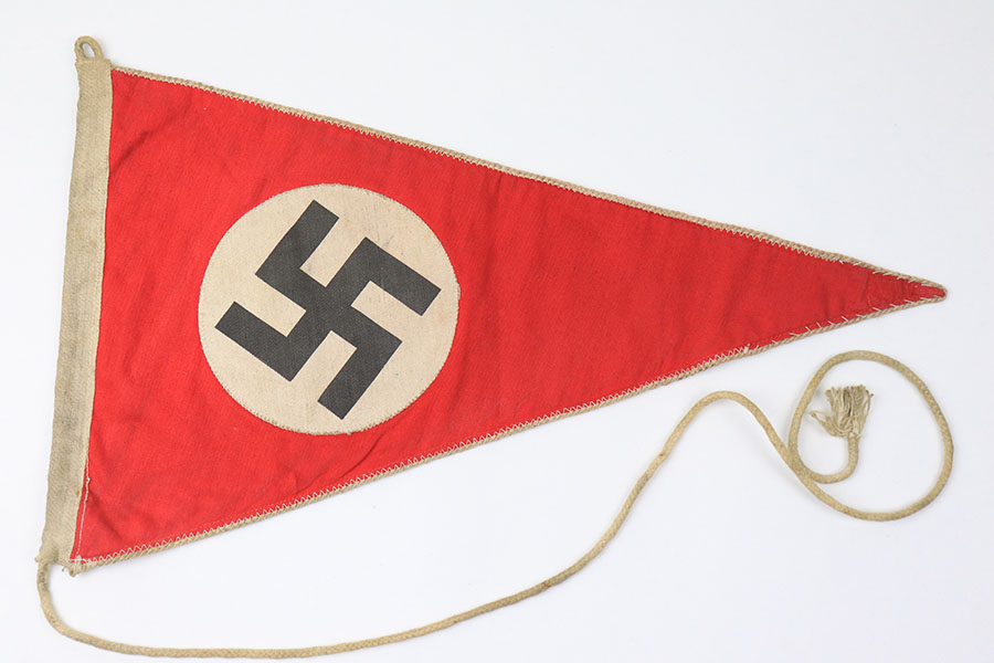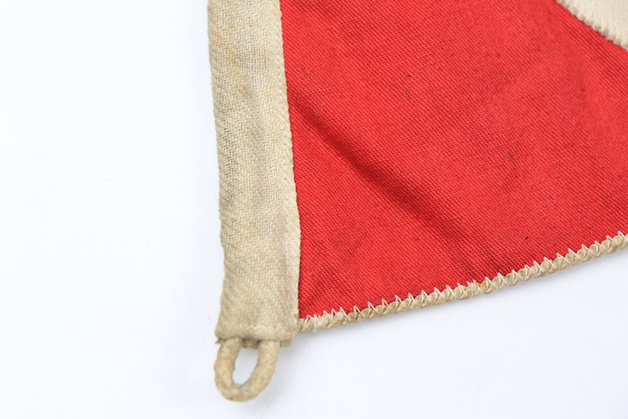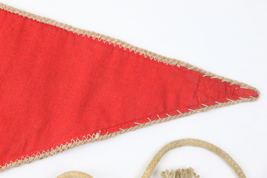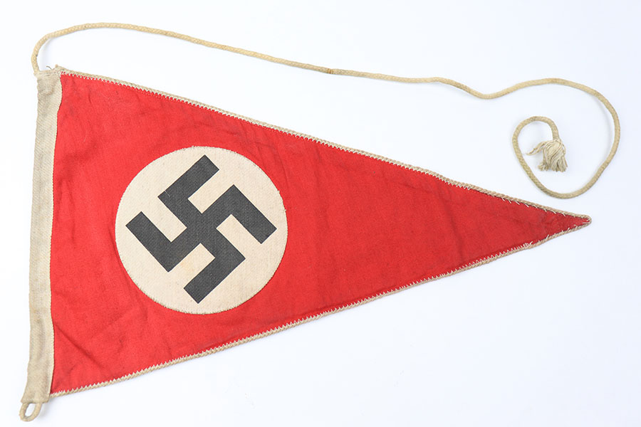 8/18/21 – This is an original WW2 Nazi Pennant Flag. The flag measures just under 14 inches long and approximately 8.25 inches wide. Double sided Nazi logo and excellent stitching. Original hanging string is still attached and in good condition. No major stains, rips, or tares.