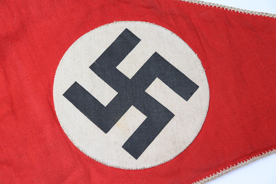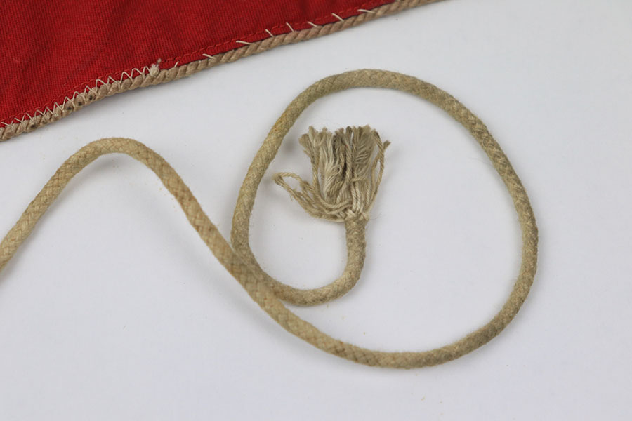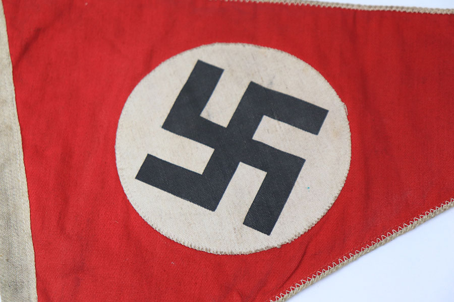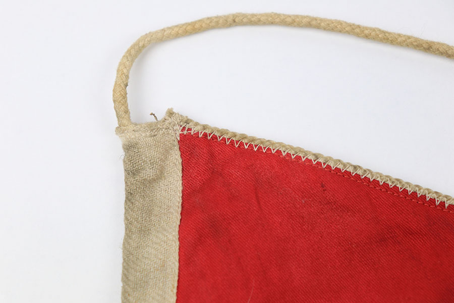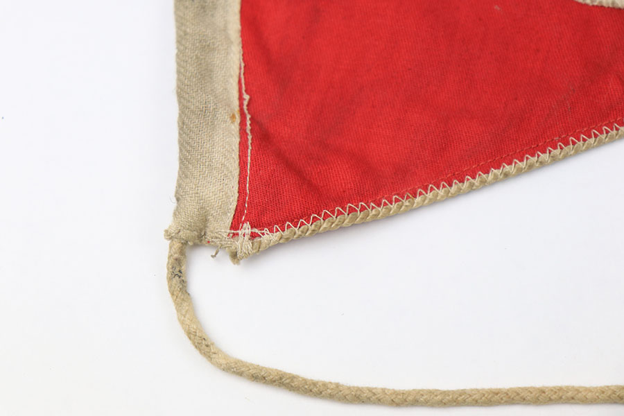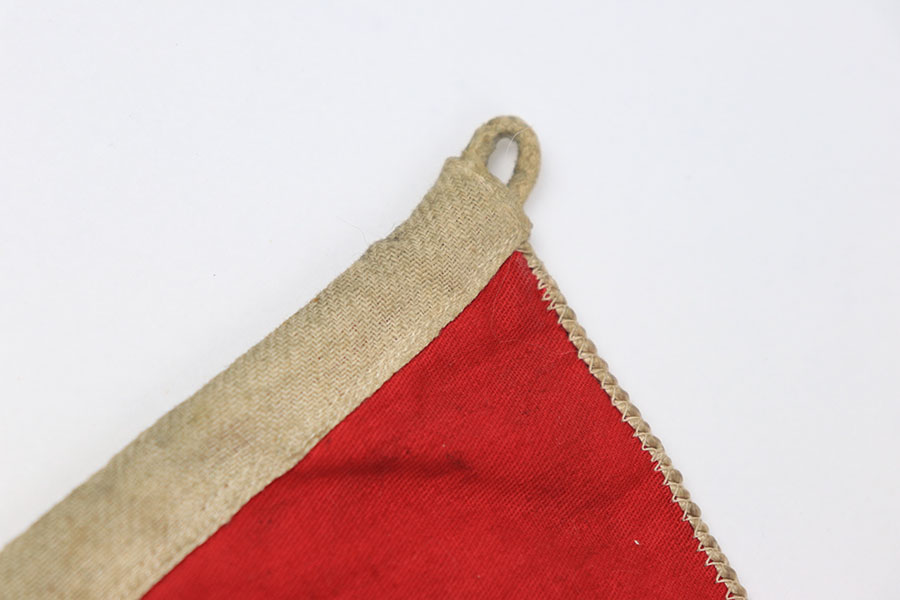 8/18/21 – This is an original WW2 Nazi Pennant Flag. The flag measures just under 14 inches long and approximately 8.25 inches wide. Double sided Nazi logo and excellent stitching. Original hanging string is still attached and in good condition. No major stains, rips, or tares.
