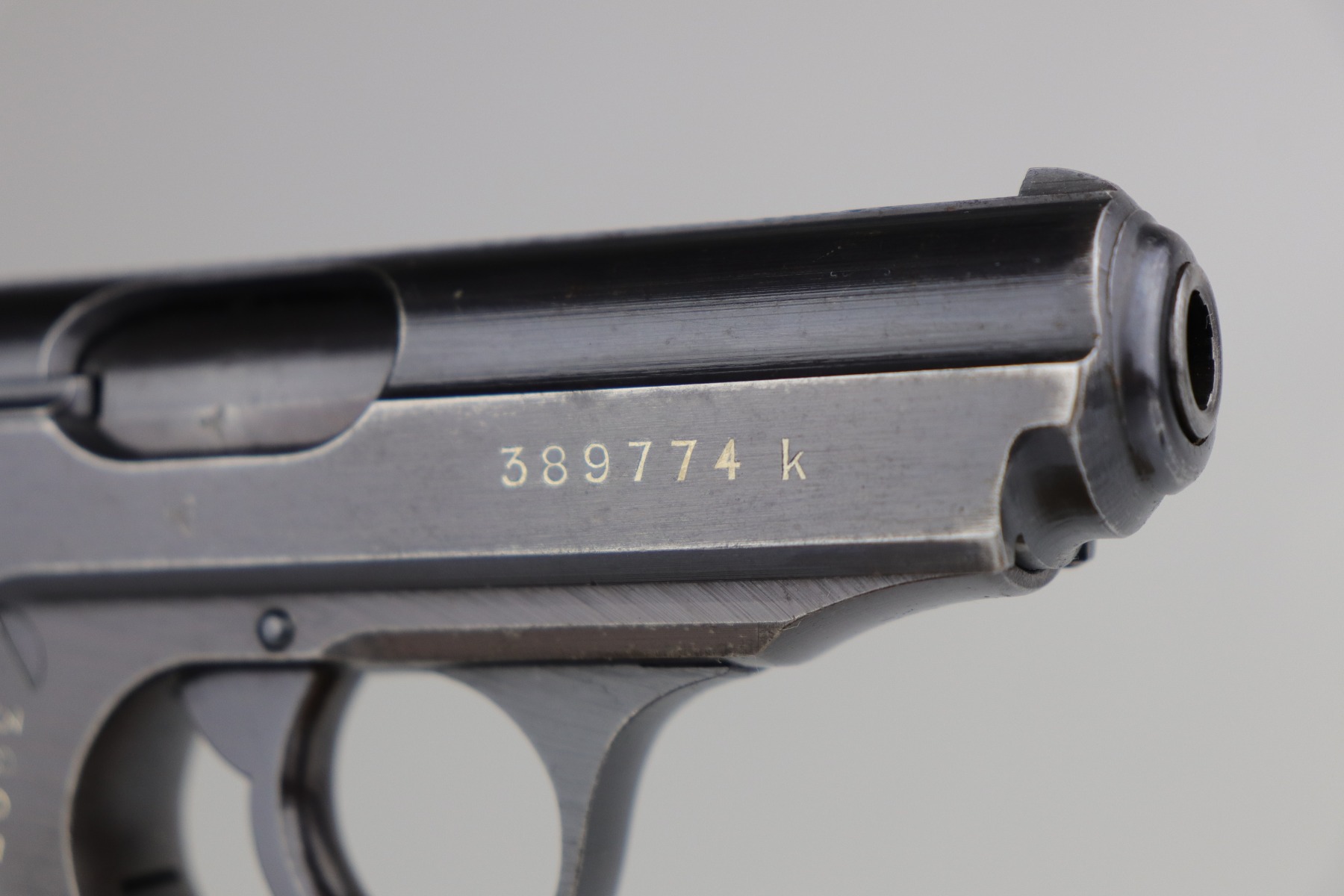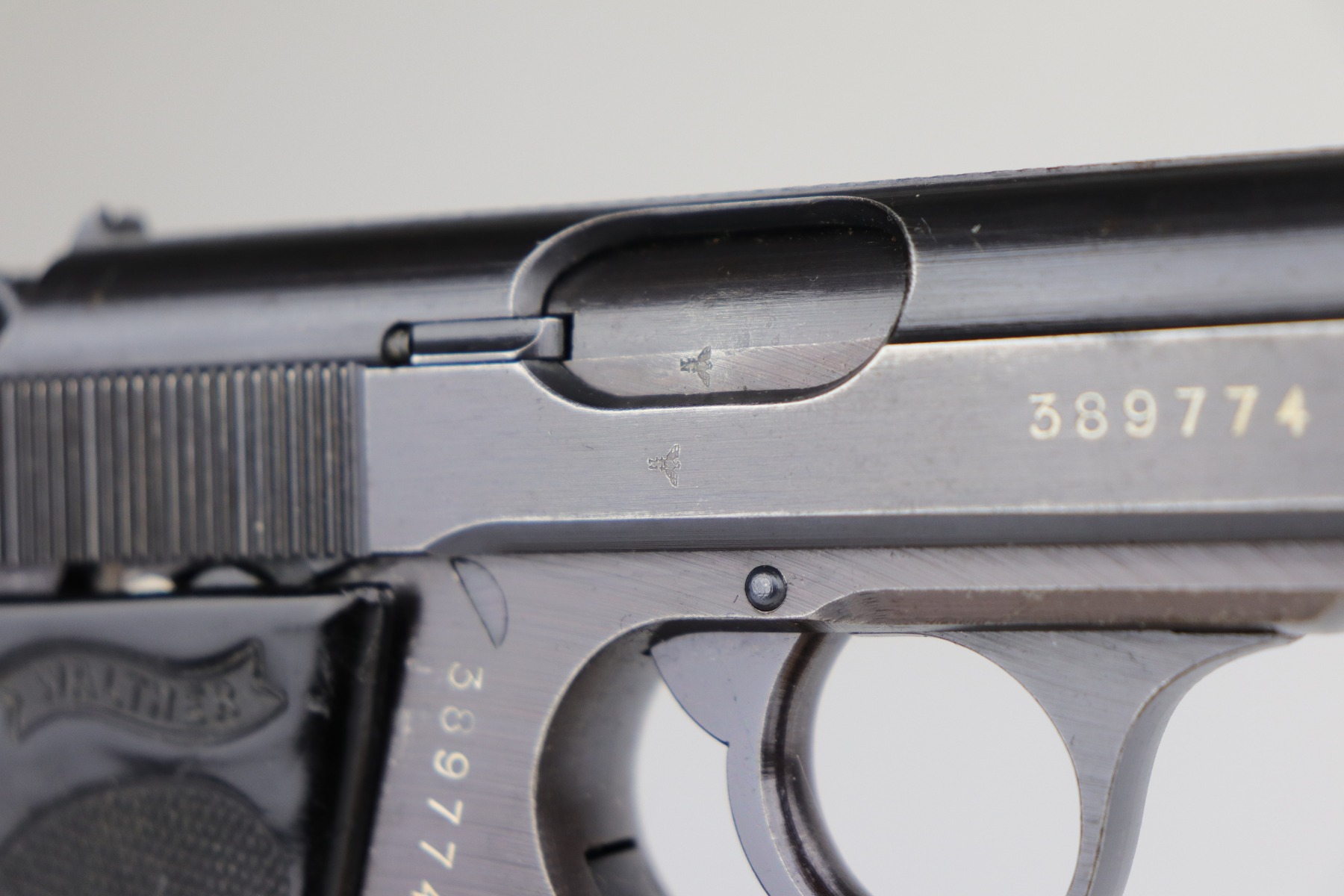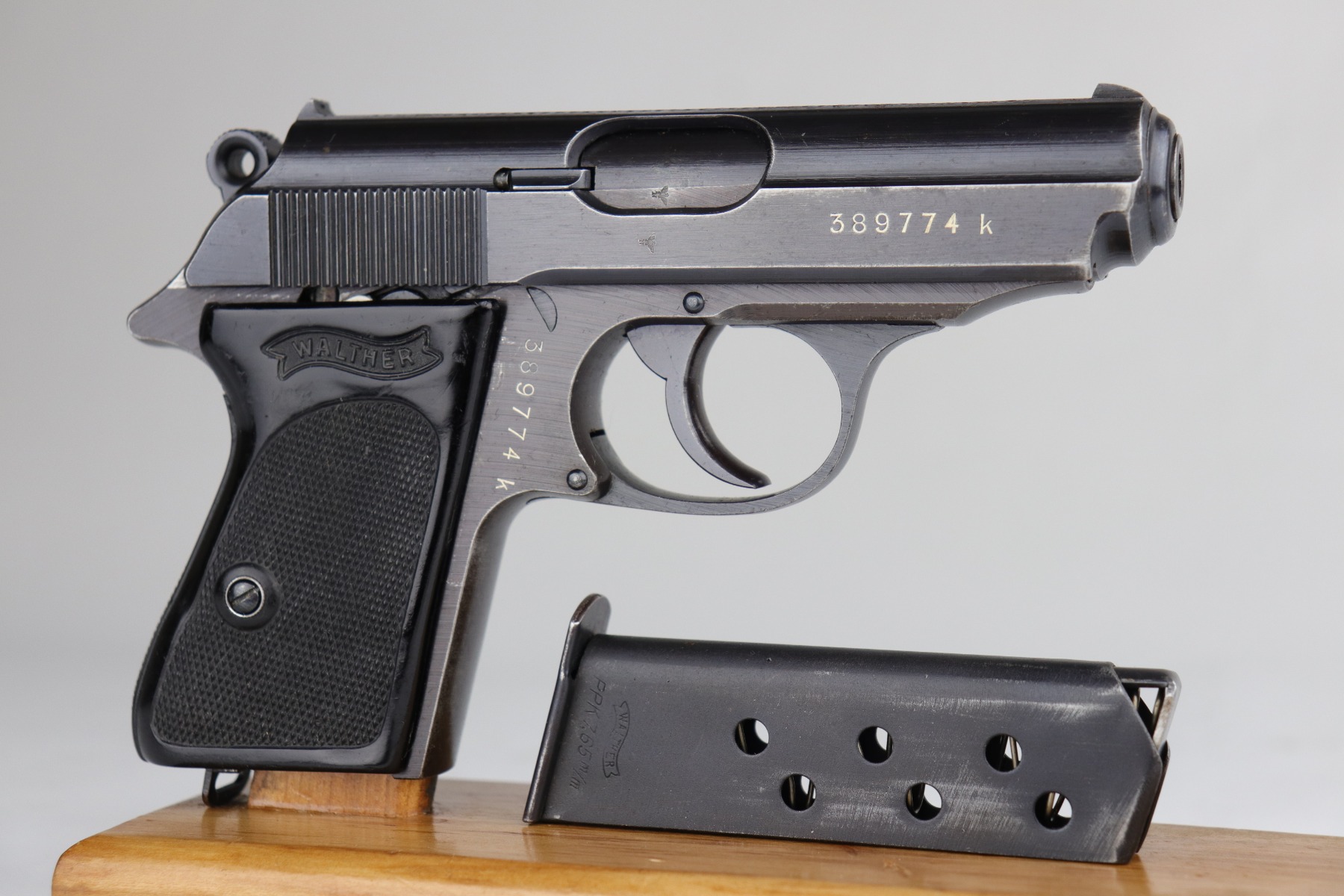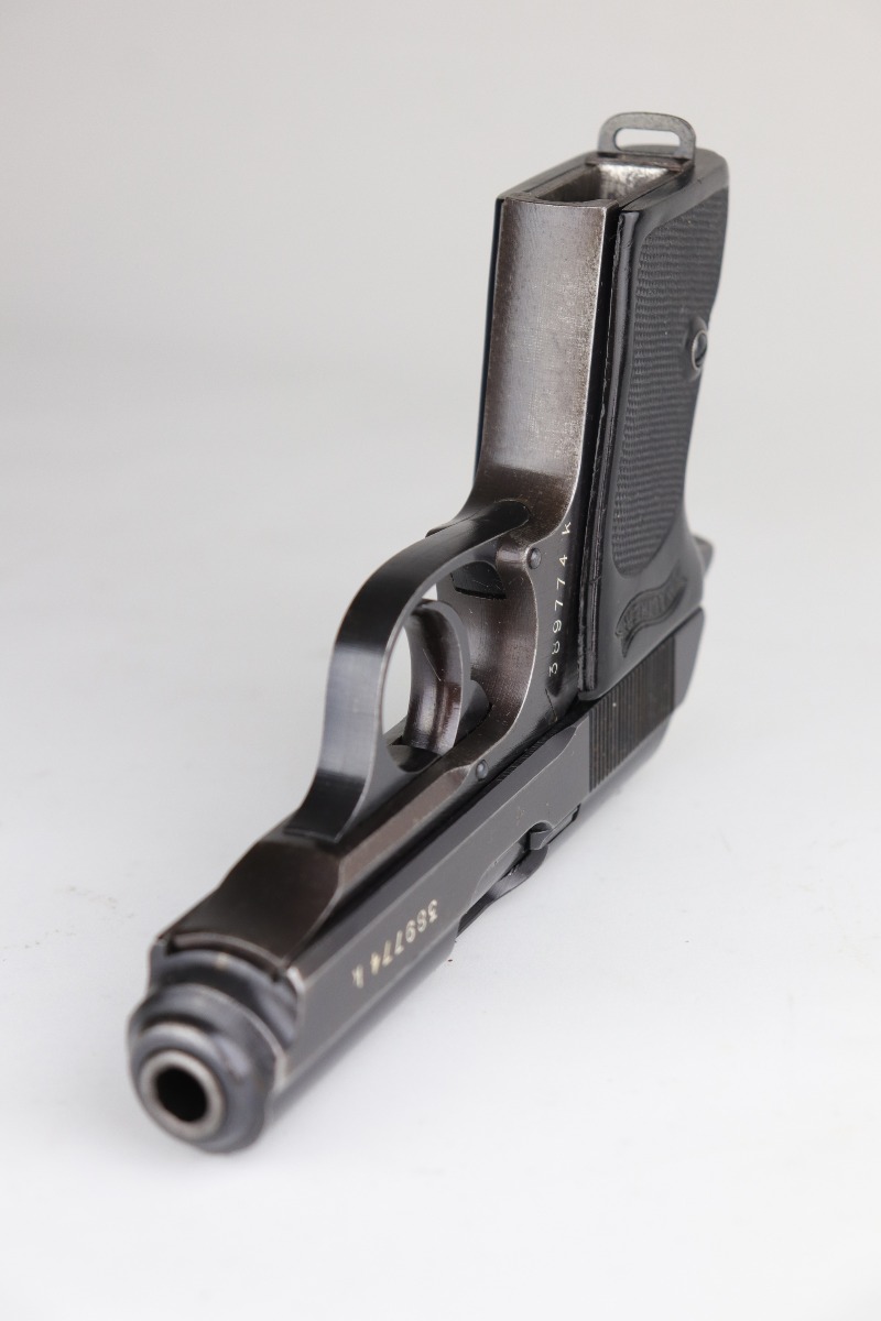 7/2/20 – This is a Nazi Police Walther PPK pistol. The frame is “E/C” marked, and the silde/barrel are “Eagle/N” proof marked. It was made in about 1943, so it has a military finish. All matching. It has retained between 95-97% of its original finish. There is minor muzzle wear and spotty wear and light patina on the front strap. Excellent black Walther grip with a small stress fracture on the spine (typical). The bore is shiny with very strong rifling. Comes with a proper wartime magazine.
