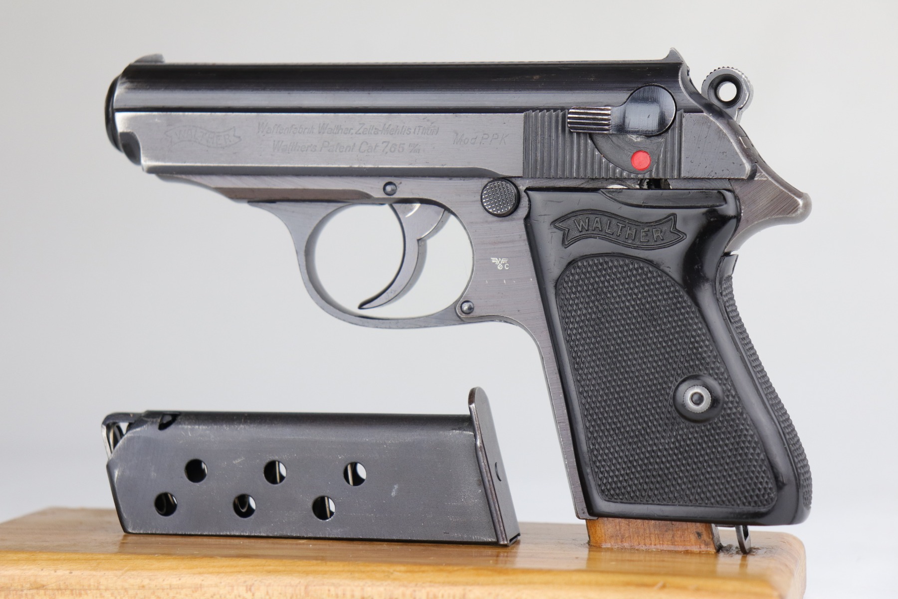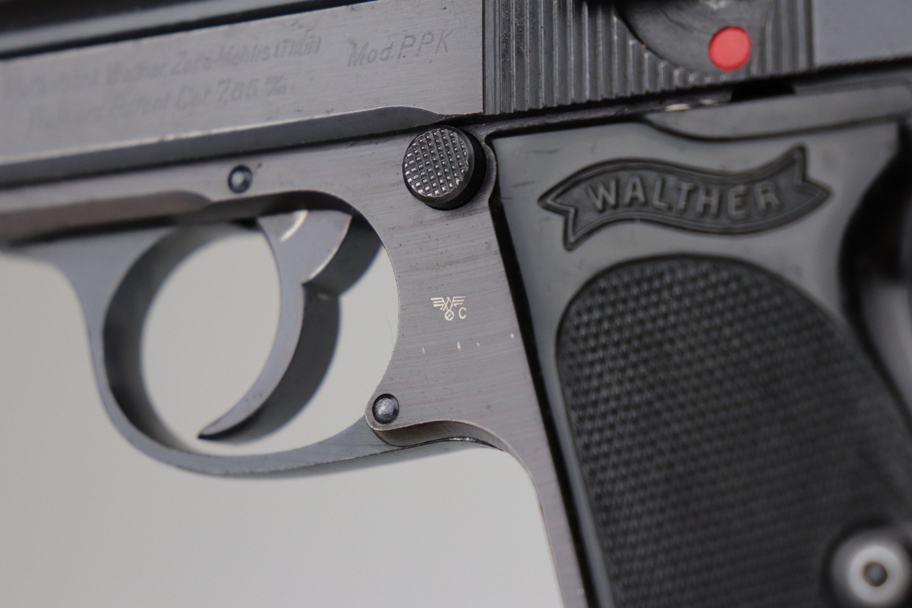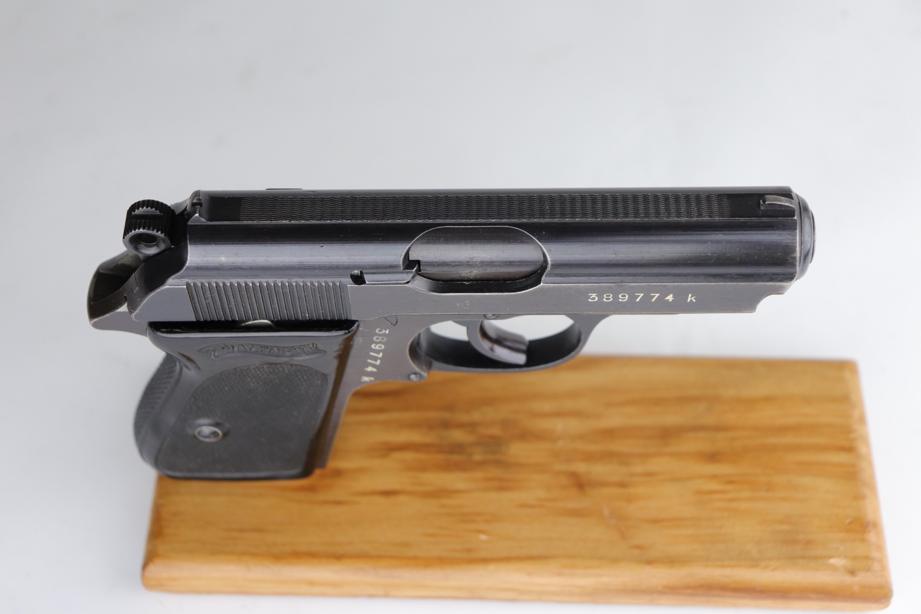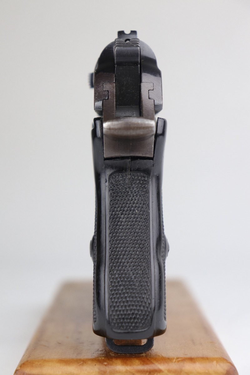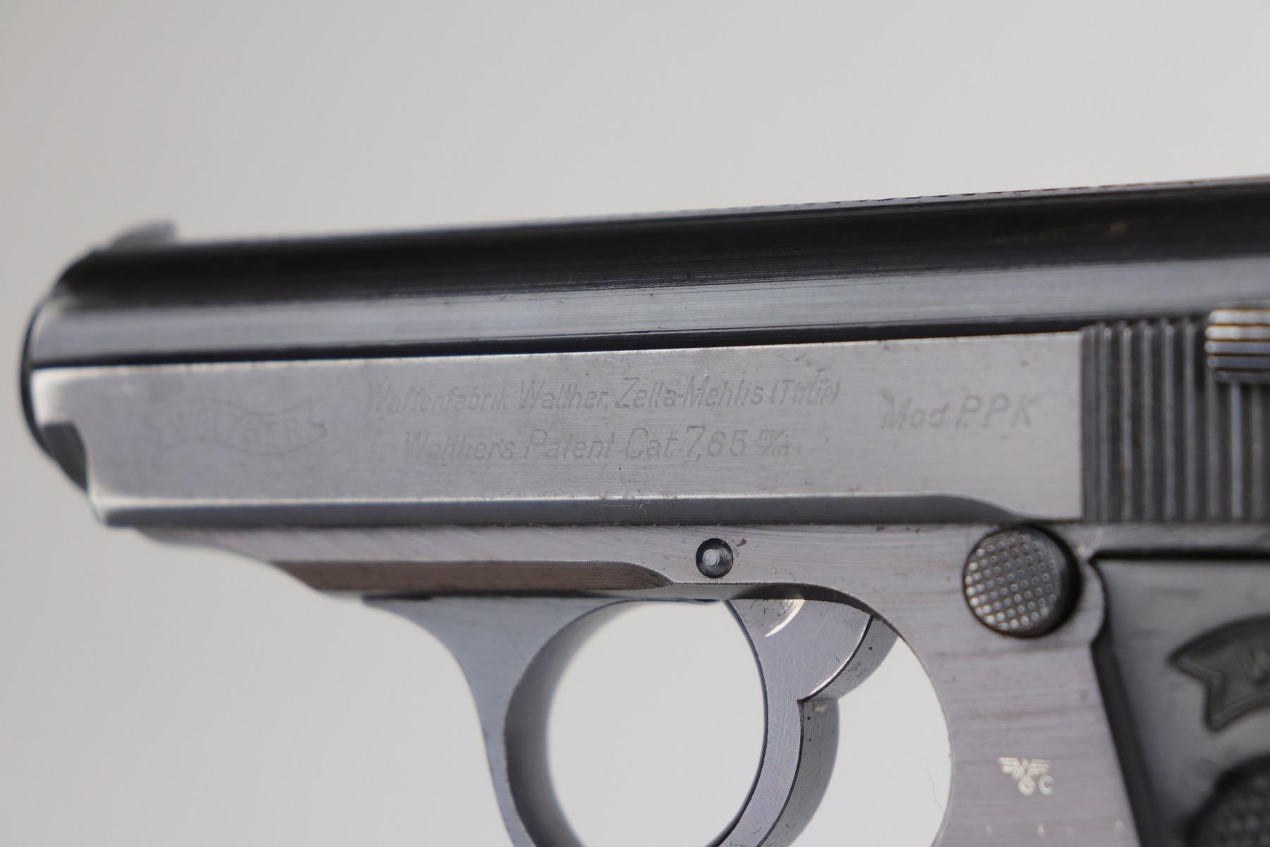 7/2/20 – This is a Nazi Police Walther PPK pistol. The frame is “E/C” marked, and the silde/barrel are “Eagle/N” proof marked. It was made in about 1943, so it has a military finish. All matching. It has retained between 95-97% of its original finish. There is minor muzzle wear and spotty wear and light patina on the front strap. Excellent black Walther grip with a small stress fracture on the spine (typical). The bore is shiny with very strong rifling. Comes with a proper wartime magazine.