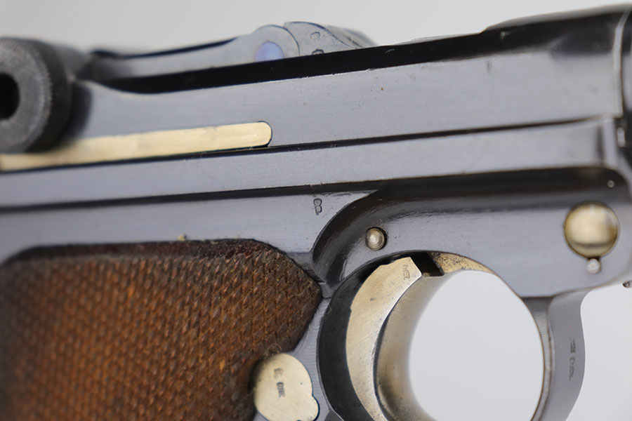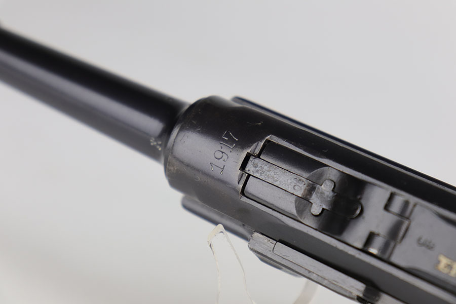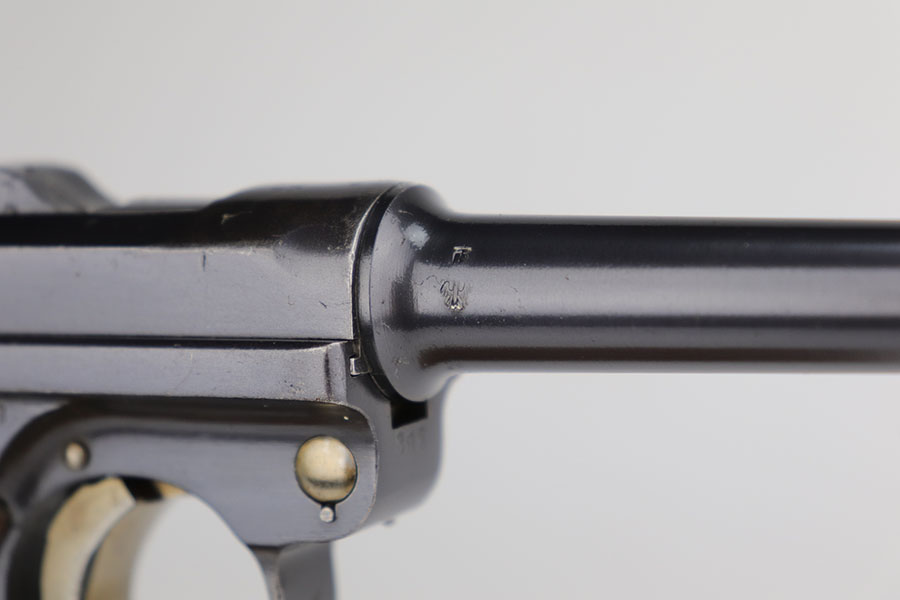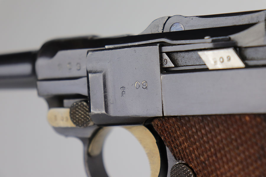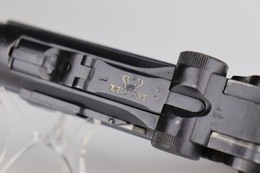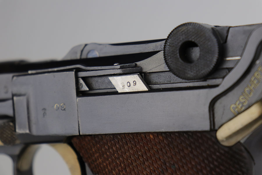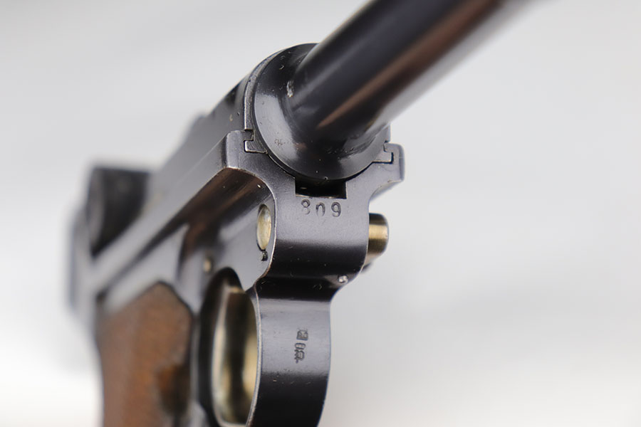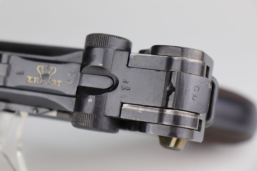 11/5/20 – This is an interesting Erfurt Luger rig from 1917 that later went to a Nazi police arsenal. The gun has all matching parts, including the grips and both magazines, but the grips and magazines were numbered at the Police arsenal during World War II. The grips have S/42 codes stamped inside, indicating replacement parts. The sear safety was also installed at this time, and the gun was likely arsenal refinished at this time, too. It has an excellent bore and is in great condition overall. Sharply checkered grips with no cracks or chips. An imperial marked tool is included. Rig is complete with holster, which is 1916 dated and faintly maker marked.