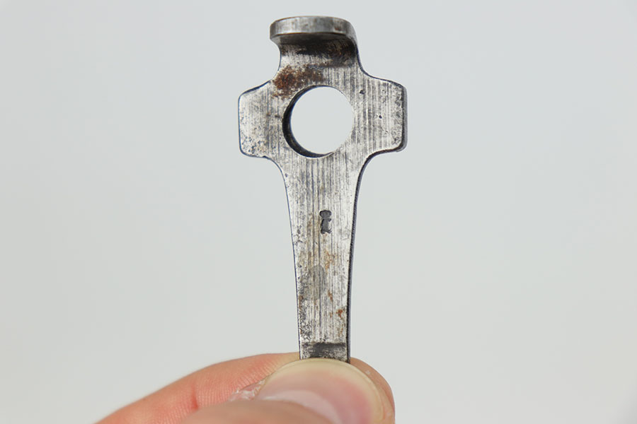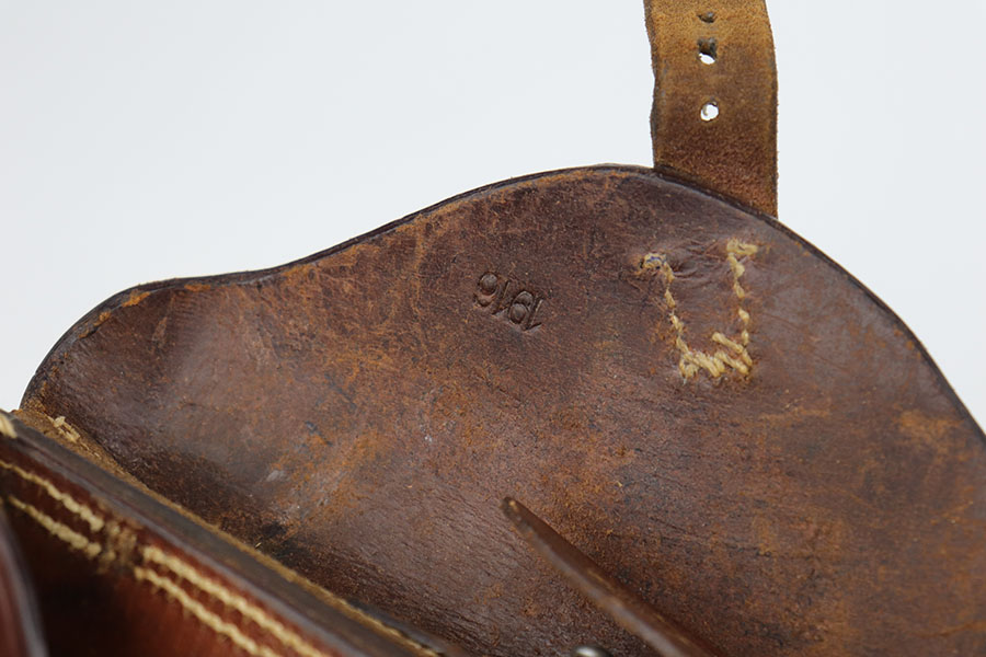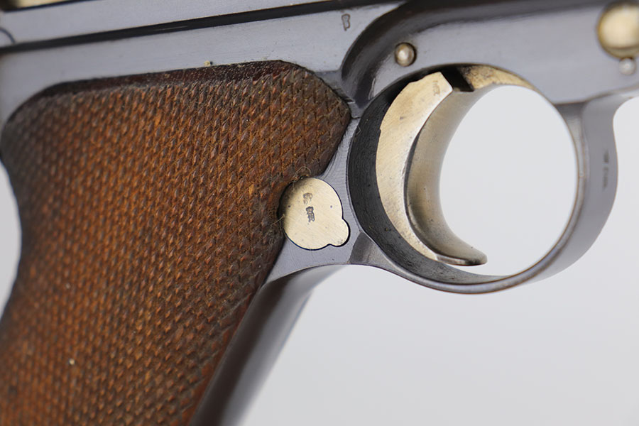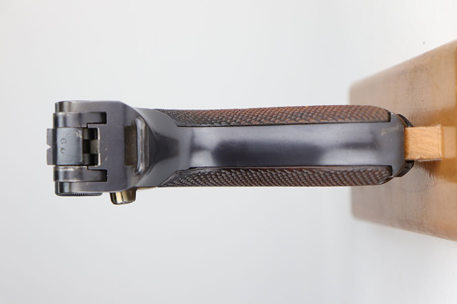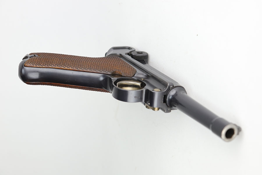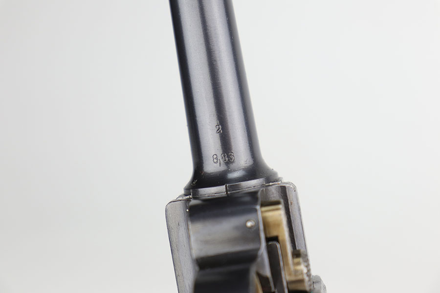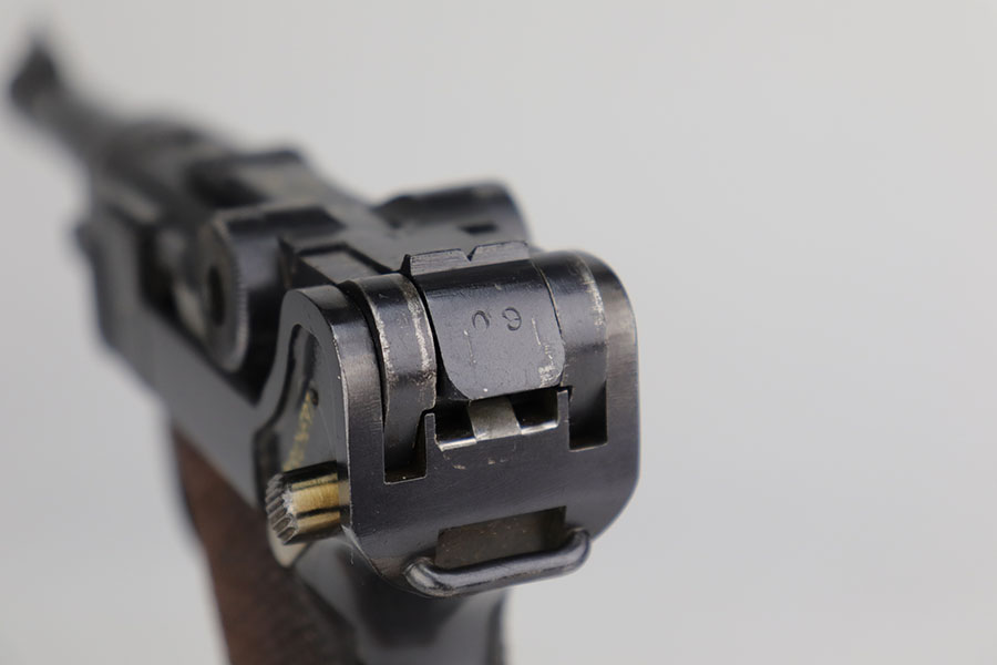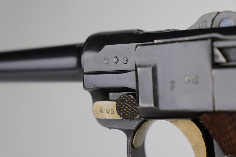 11/5/20 – This is an interesting Erfurt Luger rig from 1917 that later went to a Nazi police arsenal. The gun has all matching parts, including the grips and both magazines, but the grips and magazines were numbered at the Police arsenal during World War II. The grips have S/42 codes stamped inside, indicating replacement parts. The sear safety was also installed at this time, and the gun was likely arsenal refinished at this time, too. It has an excellent bore and is in great condition overall. Sharply checkered grips with no cracks or chips. An imperial marked tool is included. Rig is complete with holster, which is 1916 dated and faintly maker marked.