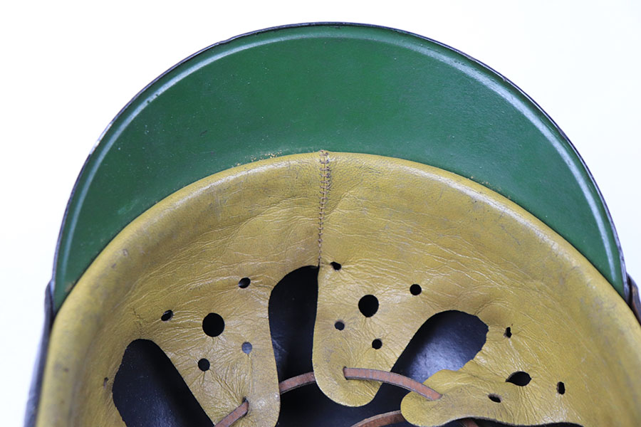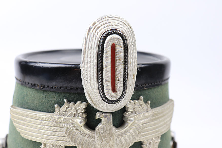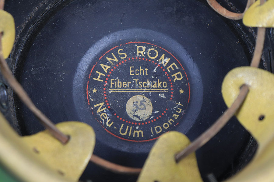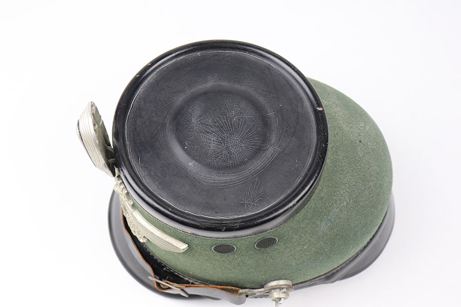 8/20/21 – This is a WW2 Nazi Police Officer’s Tschako. Great overall condition with the original leather interior liner and leather chin strap in tact. The exterior has some mild signs of aging and light surface cracking on the black lacquered leather areas. No moth holes in the wool. The police emblem has mild patina but is in great overall condition. Fairly clean interior and sized “55”.