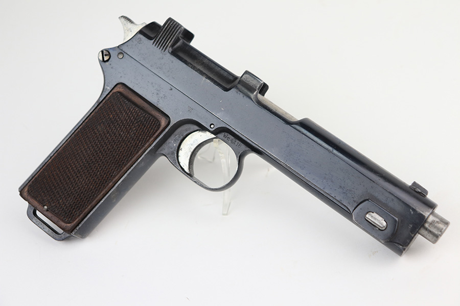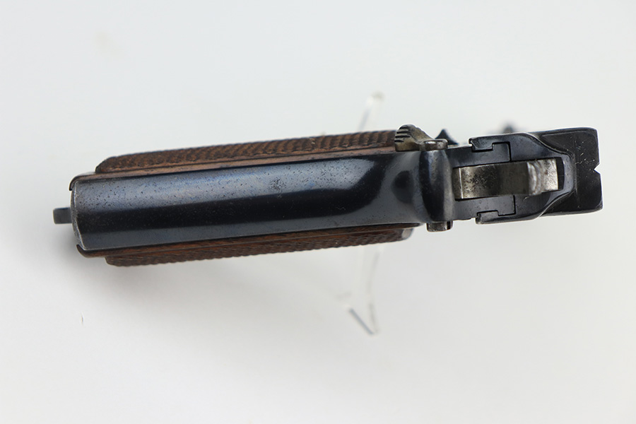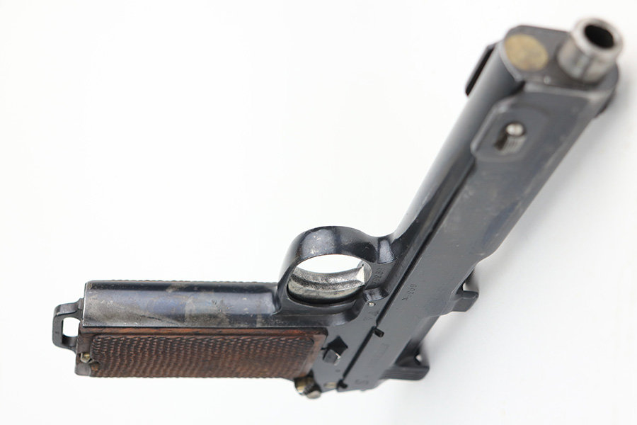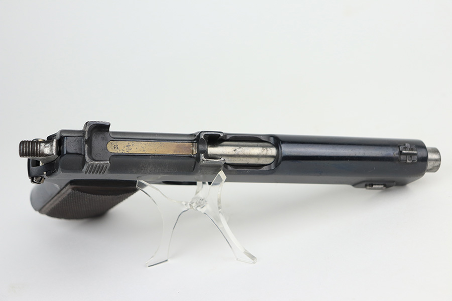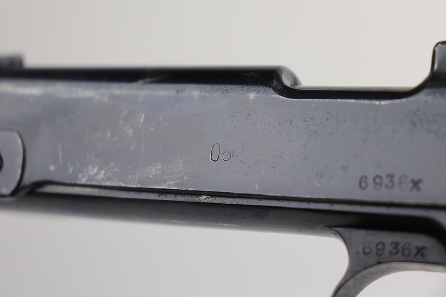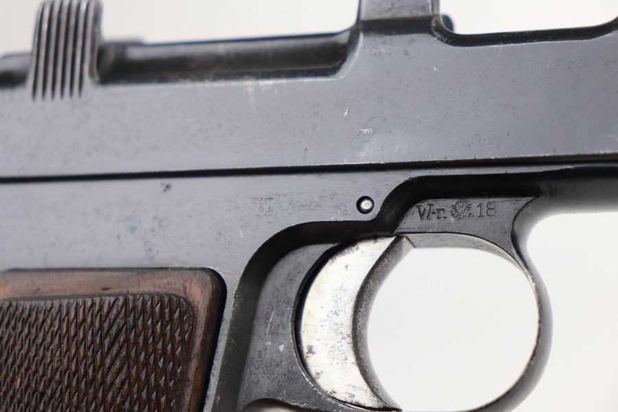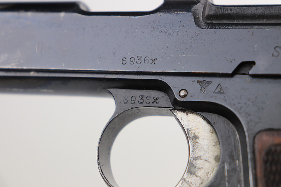 12/22/21 – This is an original and correct Steyr Hahn M1912 that was reworked by Mauser for use by the German police during WW2. The Steyr Hahn 1912 was manufactured in Imperial Austria, but after the 1938 German occupation of Austria some were converted to 9mm. They were stamped ’08’ to indicate this conversion, E/N proofed, and accepted with the German Police Eagle/L. The finish on this one rates at maybe 85%, with the most notable area of wear on the front strap. There are also areas of pinpricking on the slide and frame, and areas of surface oxidation. Good bore with strong rifling. Excellent grips with no chips or cracks.