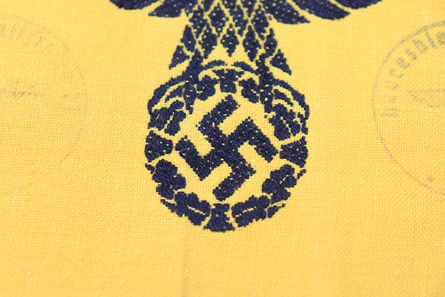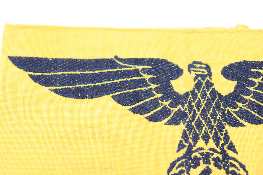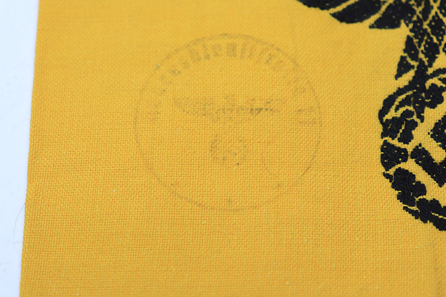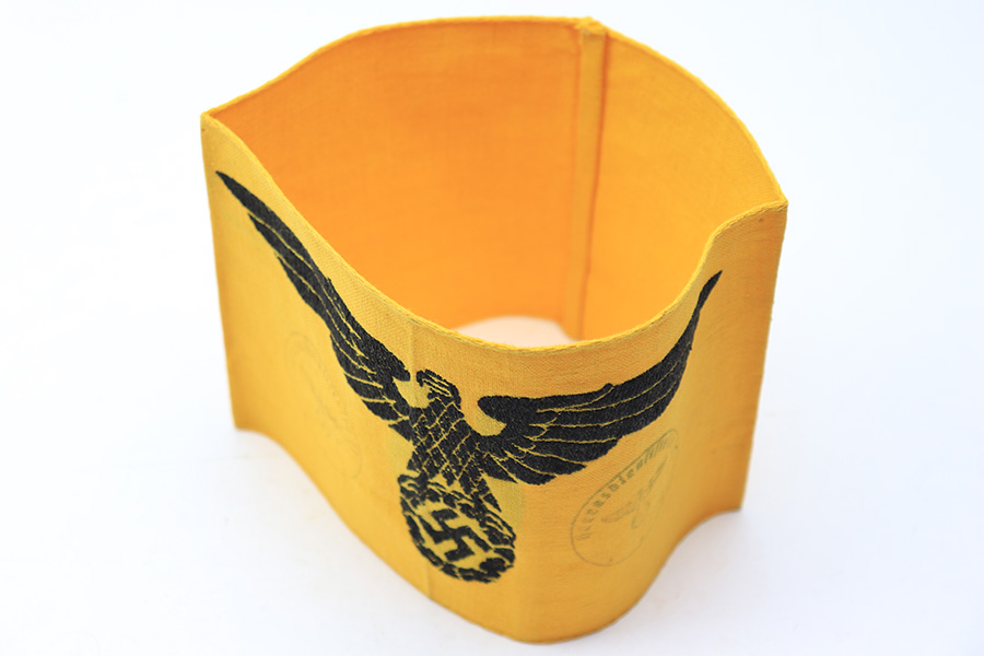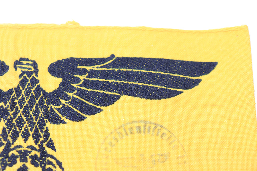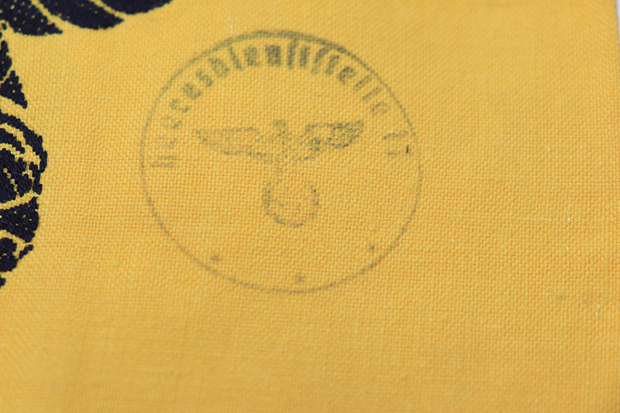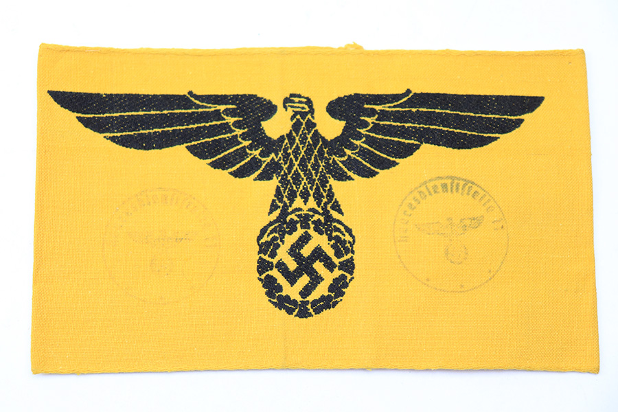 3/14/22 – This is an original WW2 Nazi Political armband. The armband is in great overall condition. The Nazi eagle logo is on the front, with two faint ink stamps on either side. The ink stamps are faded but still visible. Great overall condition with minimal wear and excellent stitching throughout.