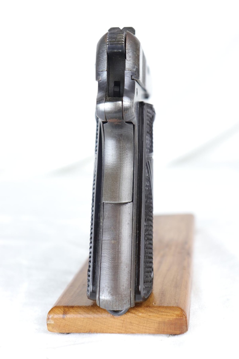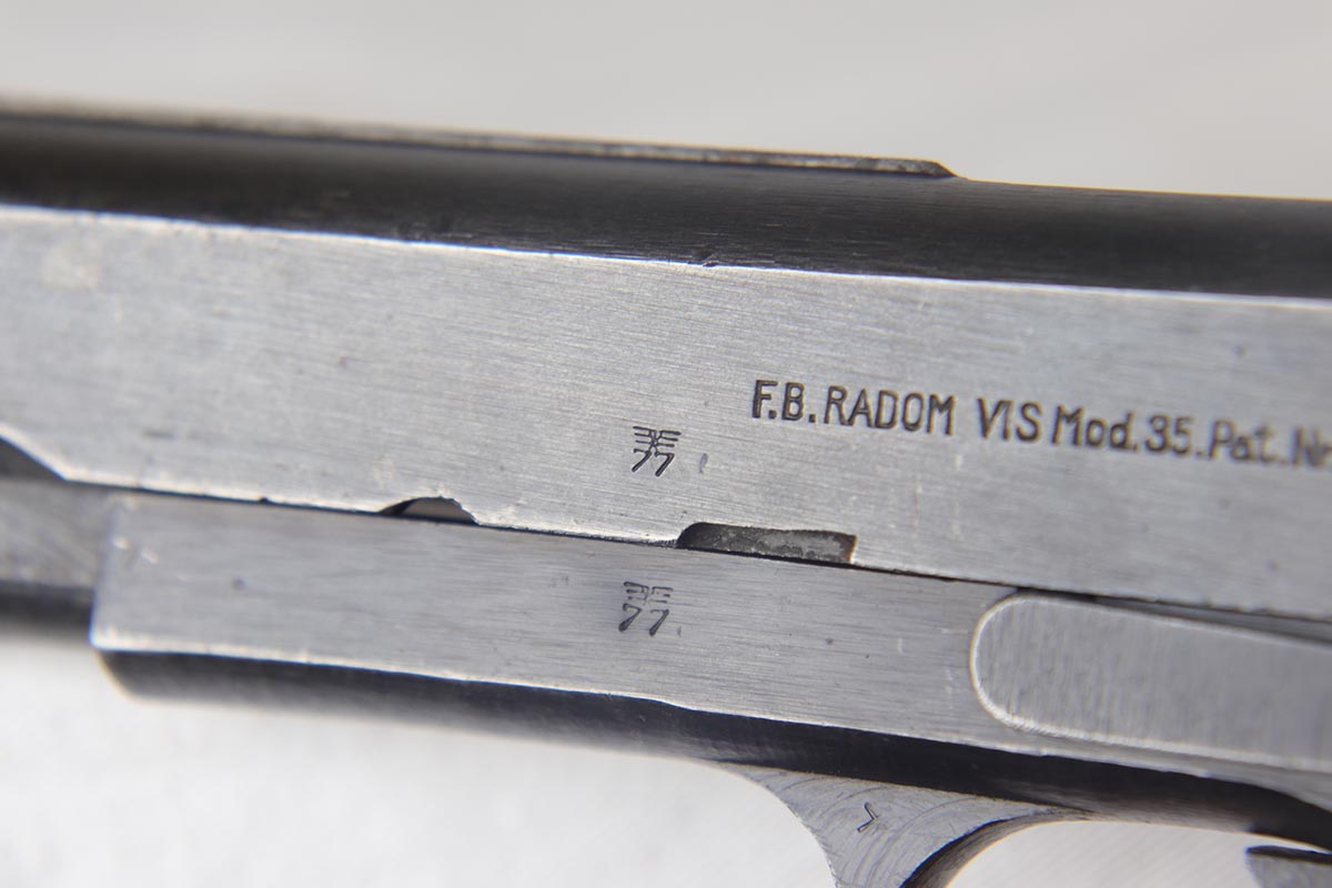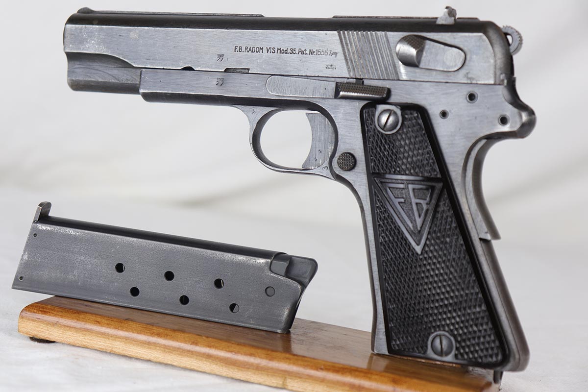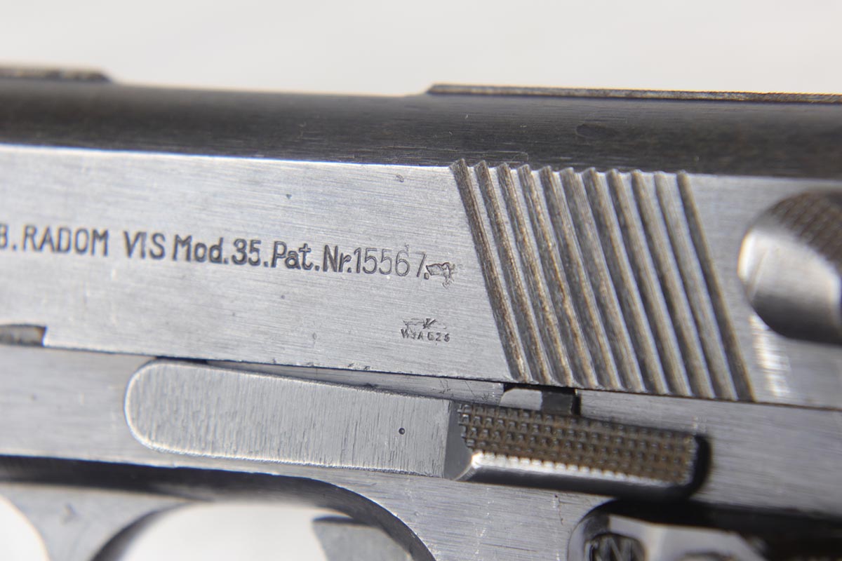 7/18/18 – This is a matching and original Radom model 35 that was made in Poland and issued to the German Army. It is a two-lever variation with 85+% original military blue. There are no major areas of wear, just general thinning or dulling of the finish. Excellent black plastic grips and a waffen marked magazine. Terrific bore.