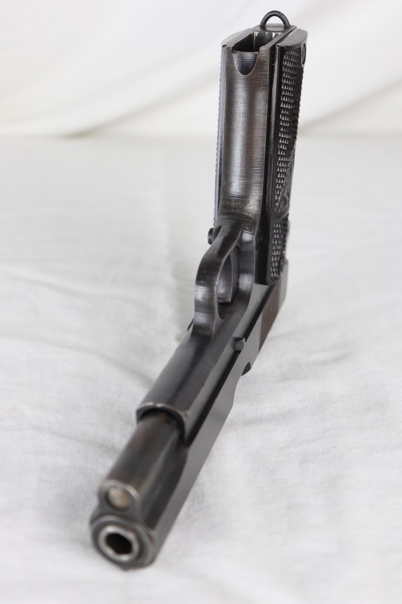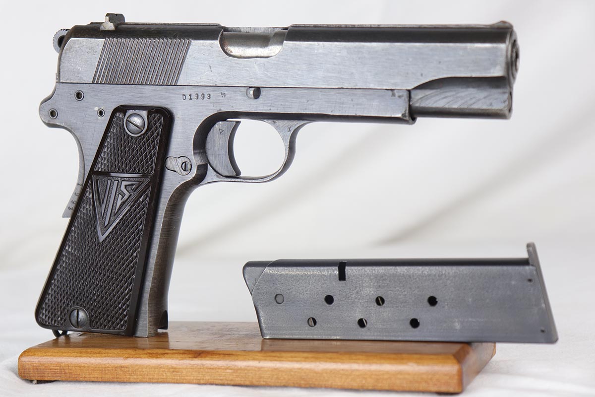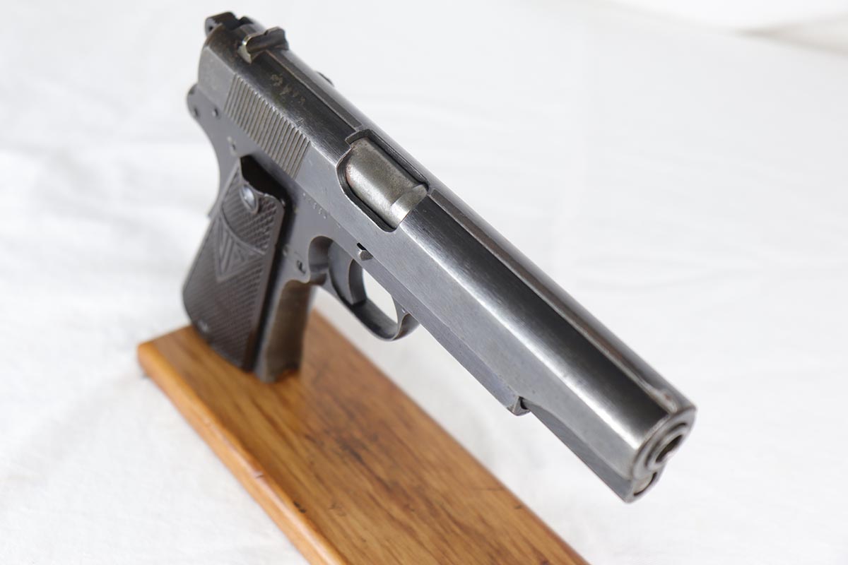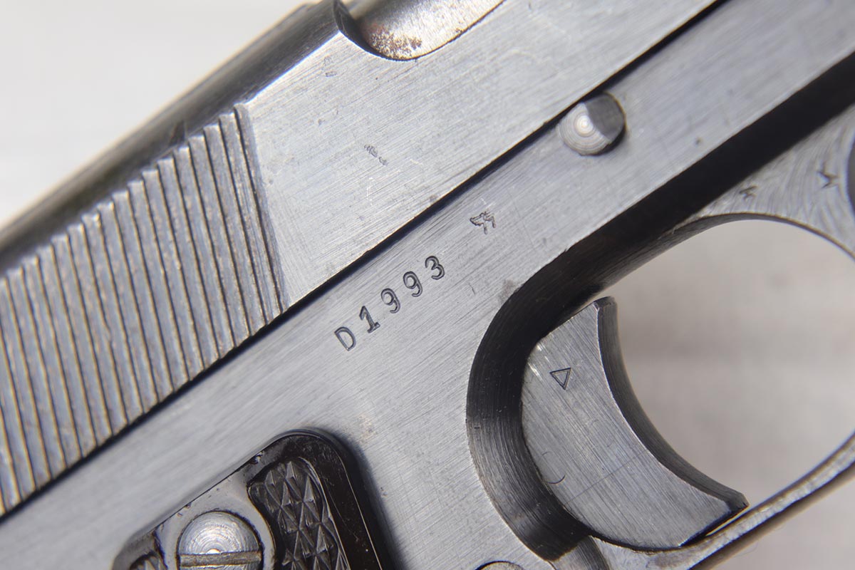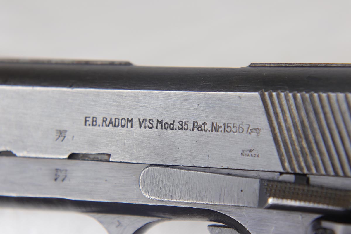 7/18/18 – This is a matching and original Radom model 35 that was made in Poland and issued to the German Army. It is a two-lever variation with 85+% original military blue. There are no major areas of wear, just general thinning or dulling of the finish. Excellent black plastic grips and a waffen marked magazine. Terrific bore.