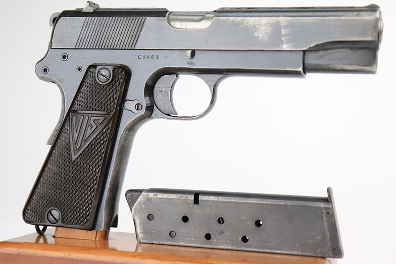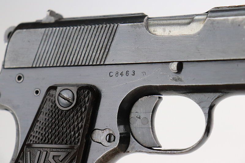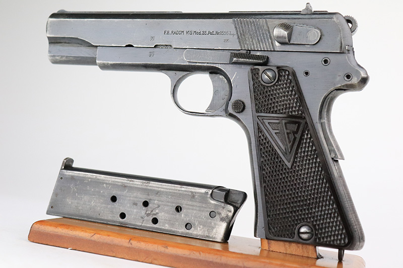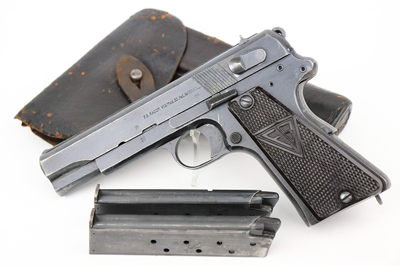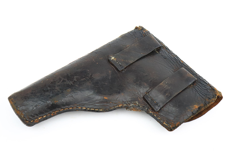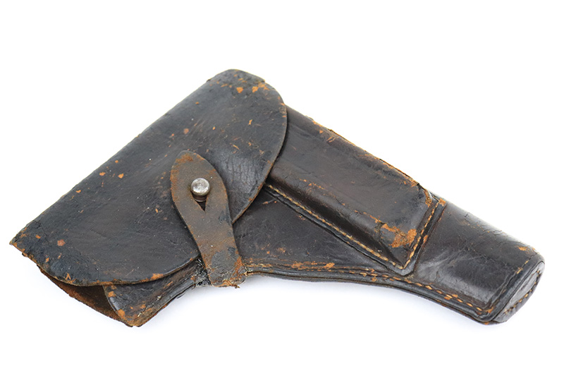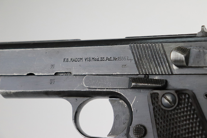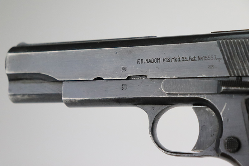 9/22/22 – This is an all matching and original Nazi Radom Model 35 rig with holster and spare magazine. The original finish rates at maybe 75% with most of the wear on the straps, and a patch of bluing loss on the right side of the slide. The bore has strong rifling but a little freckling in the grooves. Excellent grips with no cracks or chips. The rig includes a total of two original magazines with waffenamts on each. Comes with an original holster but it is pretty worn with notable flaking.