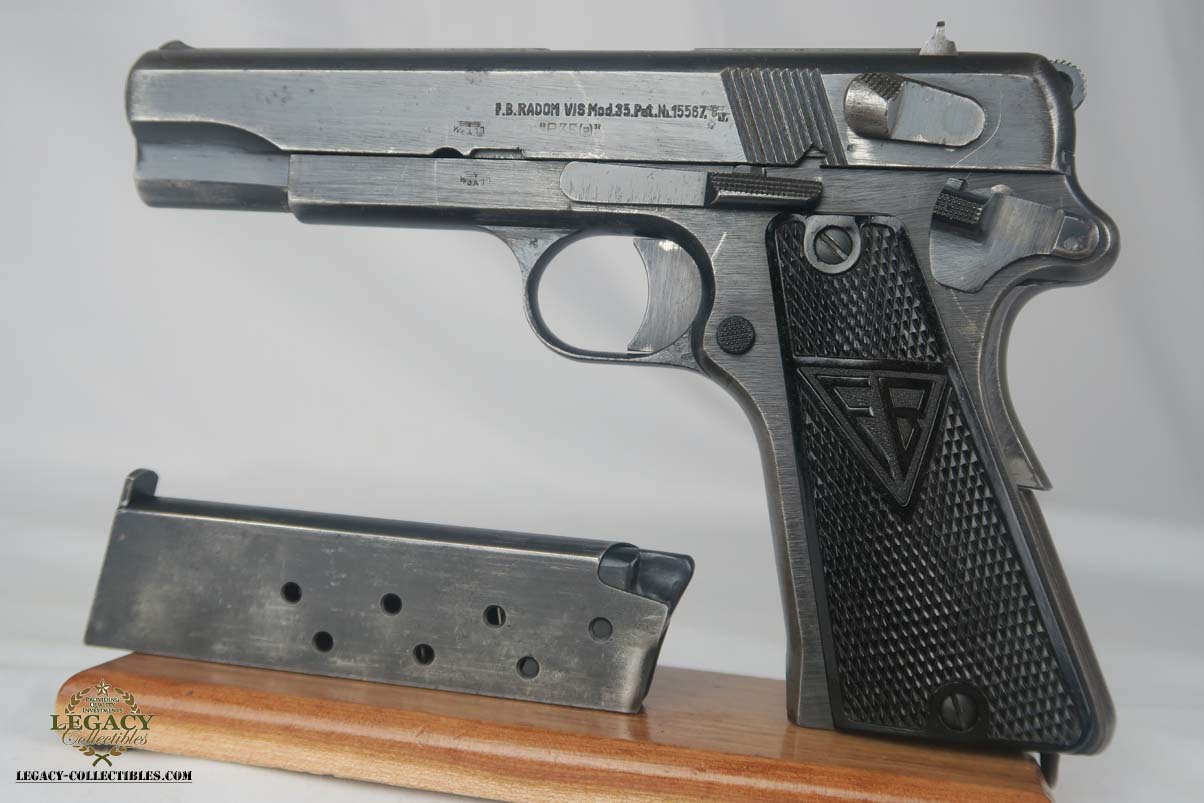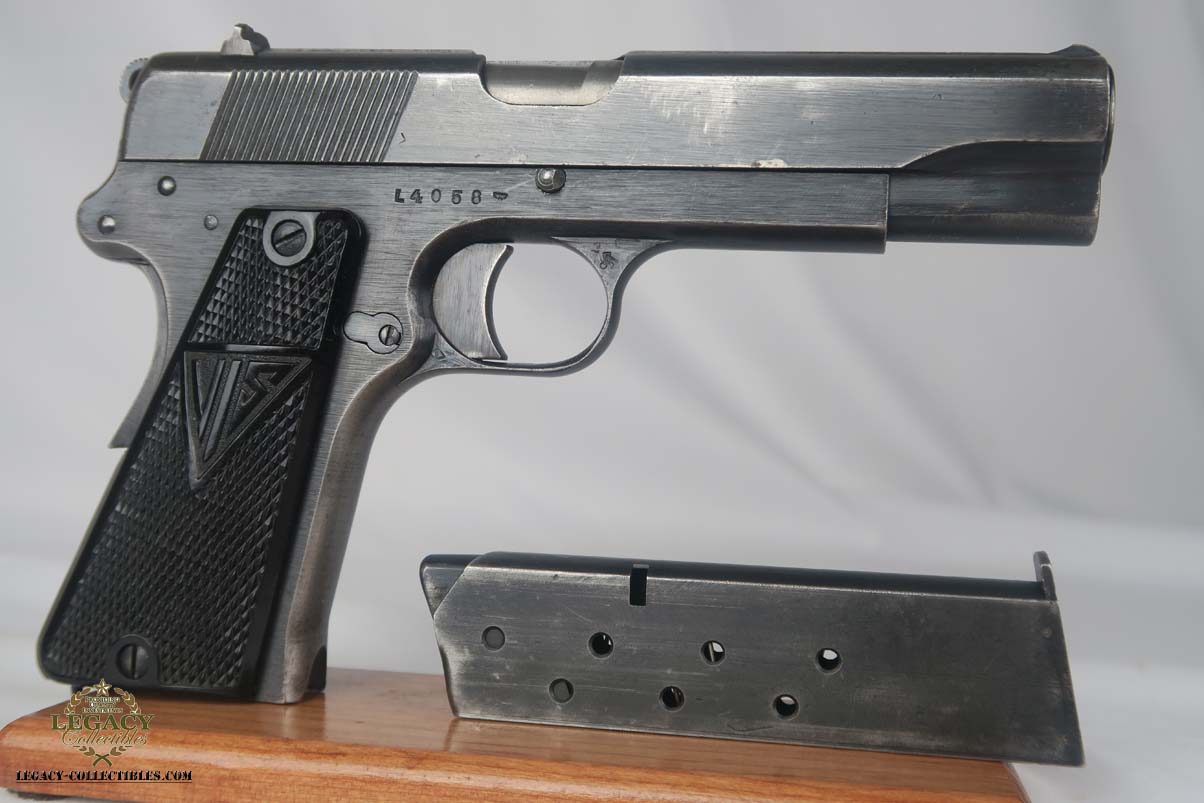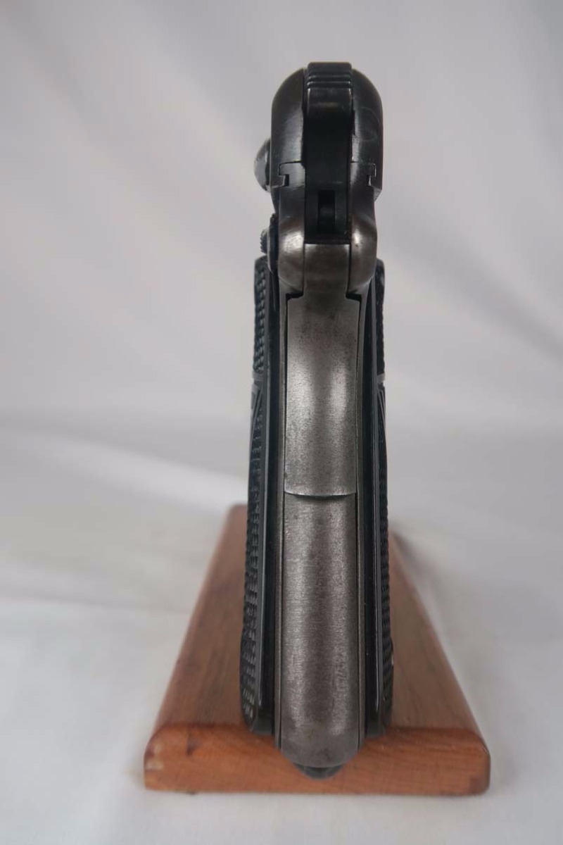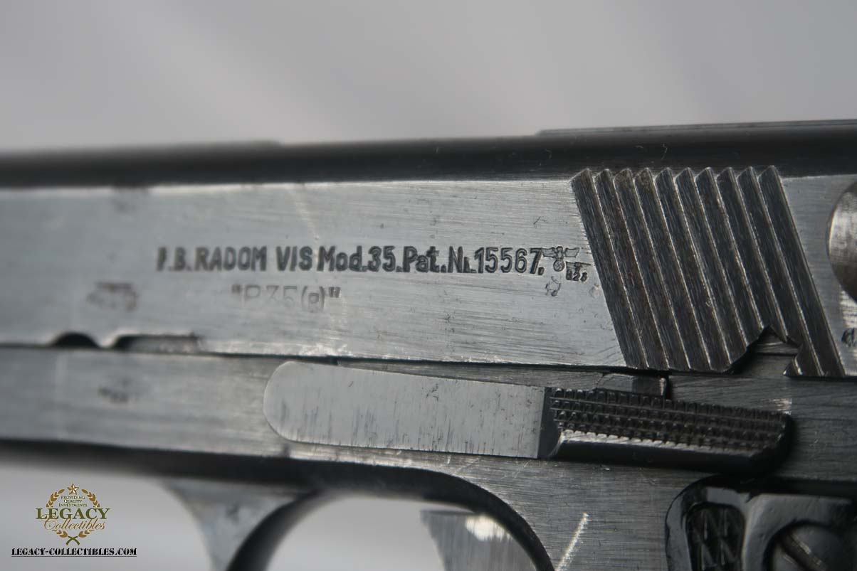 3/31/17 – This is a wartime Nazi Radom in the L block. Production dates to around 1943. The finish is about 92%, with a nice slide but worn straps. Three lever variation with fixed sights. Correct grips and magazine (unmarked). Bore has good rifling but is a little frosted, 7/10.