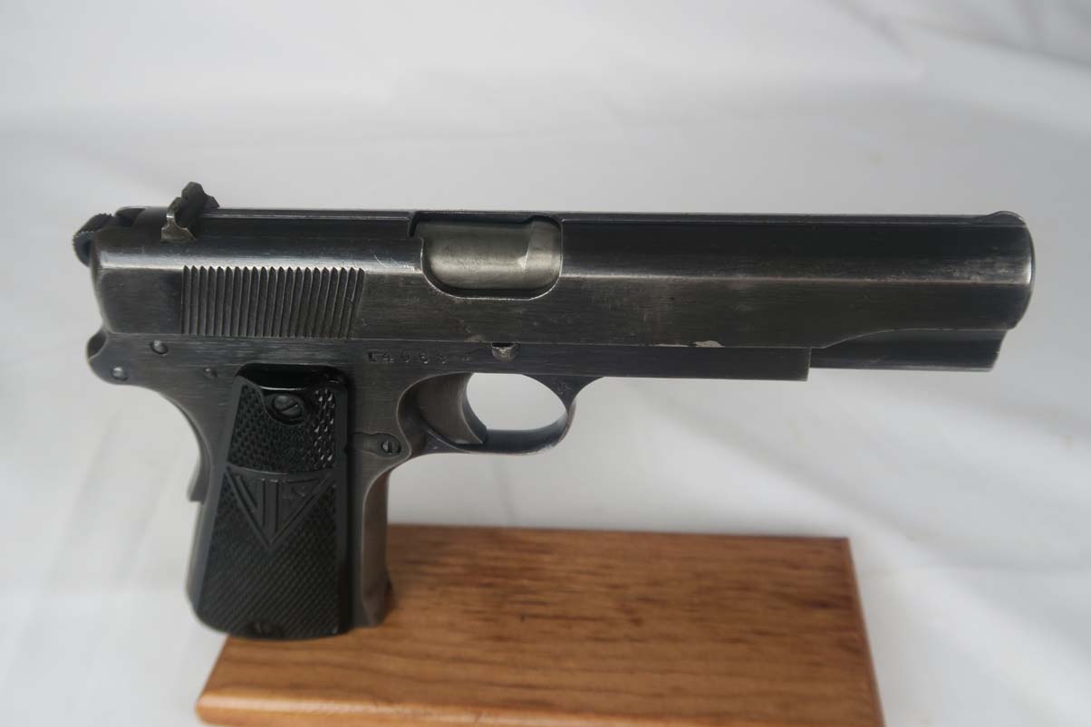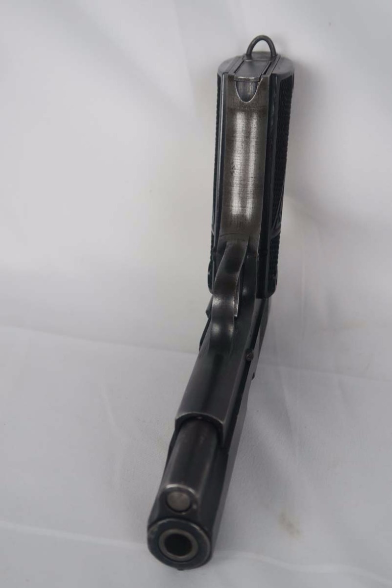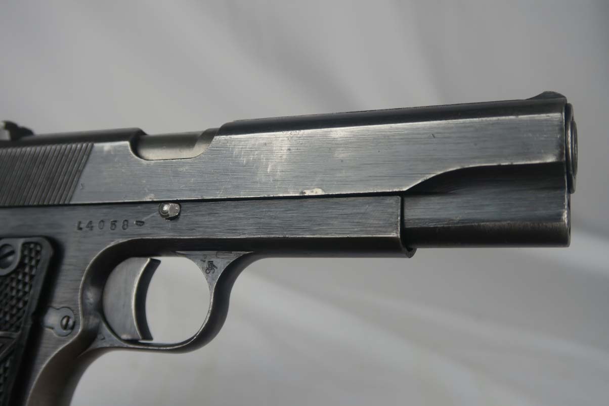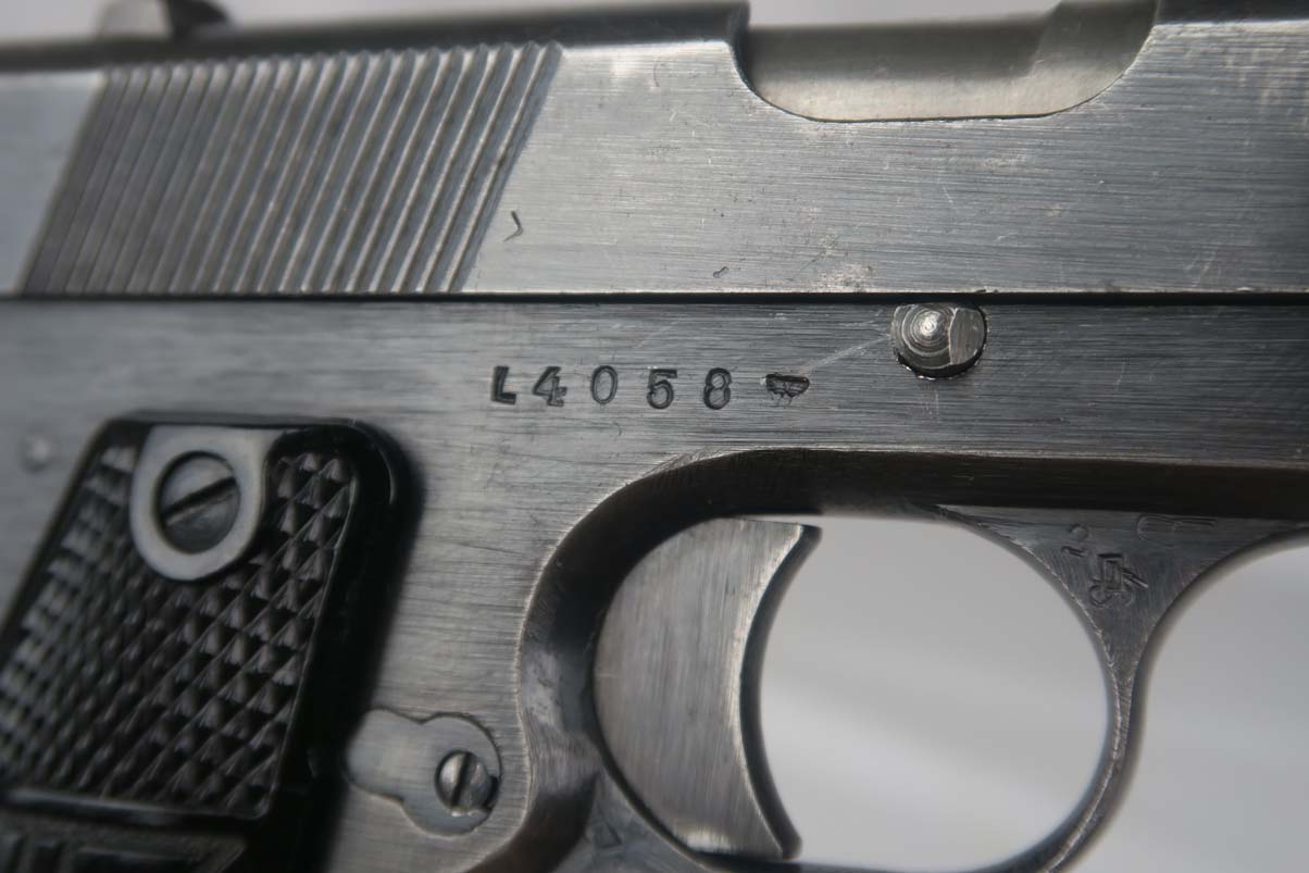 3/31/17 – This is a wartime Nazi Radom in the L block. Production dates to around 1943. The finish is about 92%, with a nice slide but worn straps. Three lever variation with fixed sights. Correct grips and magazine (unmarked). Bore has good rifling but is a little frosted, 7/10.