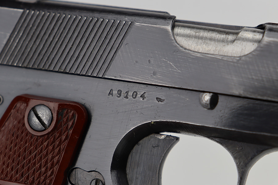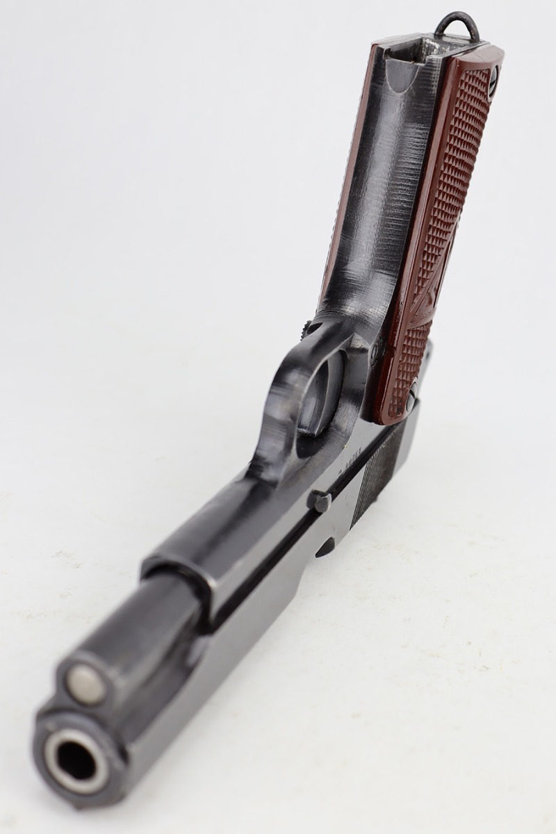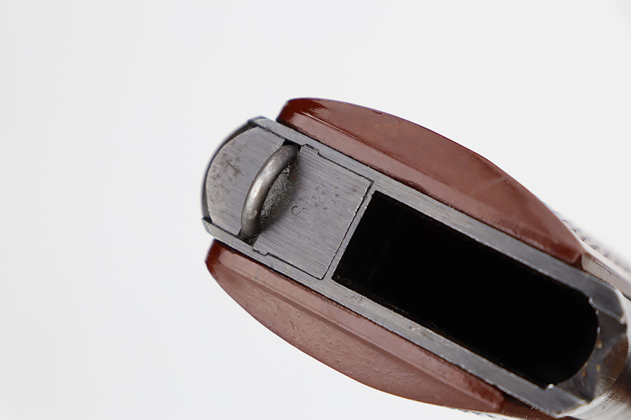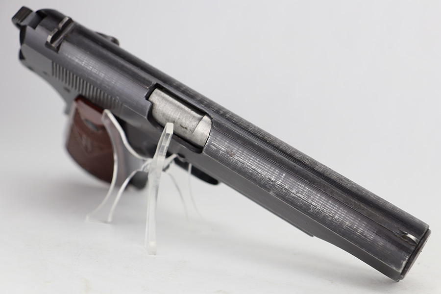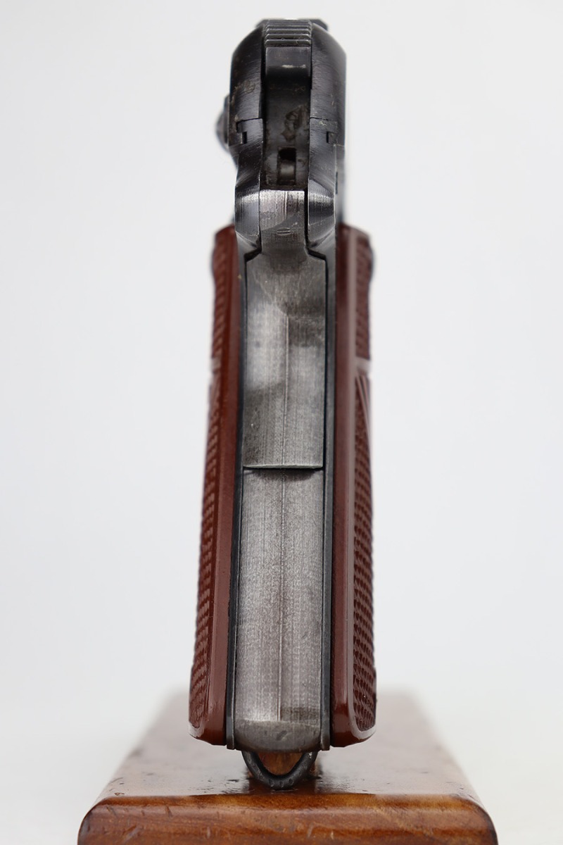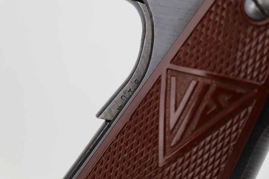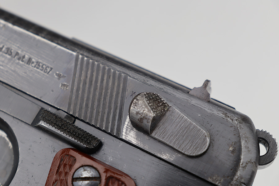 6/12/23 – This is a nice example of a Radom VIS 35 issued to the Nazi military during WW2. All matching with the proper “Eagle 77” and “Eagle 623” Nazi military acceptance proofs. It has retained roughly 70% of its original wartime finish. The majority of the finish loss is on the back strap and left side of the slide and frame. There are also some small pits on the left side of the slide and frame. Fitted with a very nice set of period-correct red bakelite grips – a few tiny dings on the left side. Comes with one un-marked period-correct magazine. Excellent bore with strong rifling.