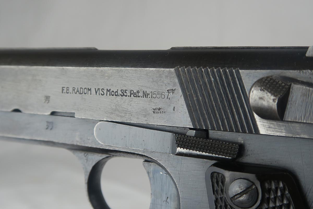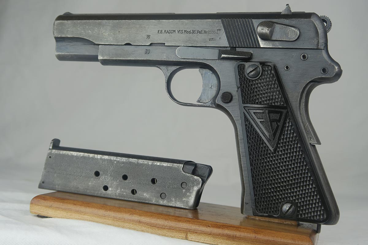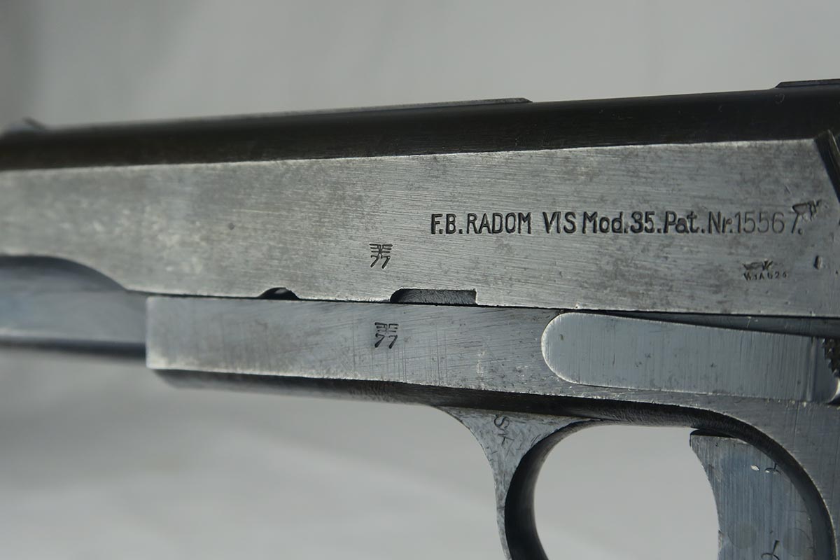 8/10/17 – This is a WW2-era Nazi Radom vis 35. It is all original and matching. Finish rates in the low 90’s with some wear on the slide and thin straps. Later two-lever variation. Eagle/77 on frame and slide. Waffen marked mag and nice grips. Minty bore.
