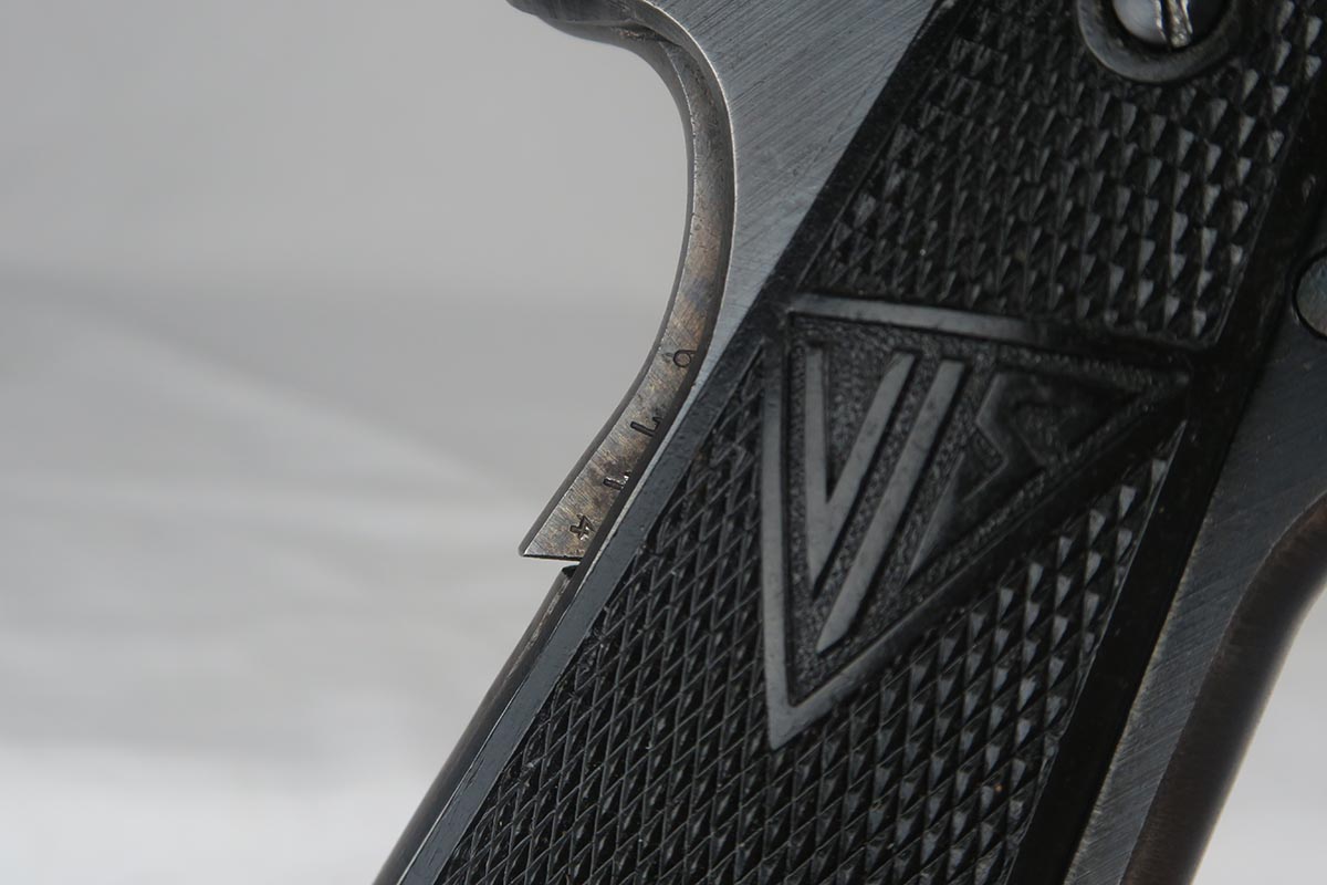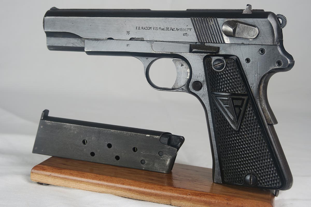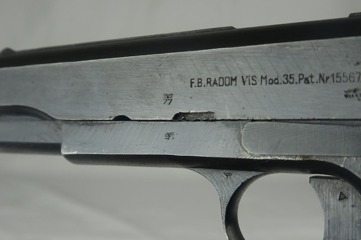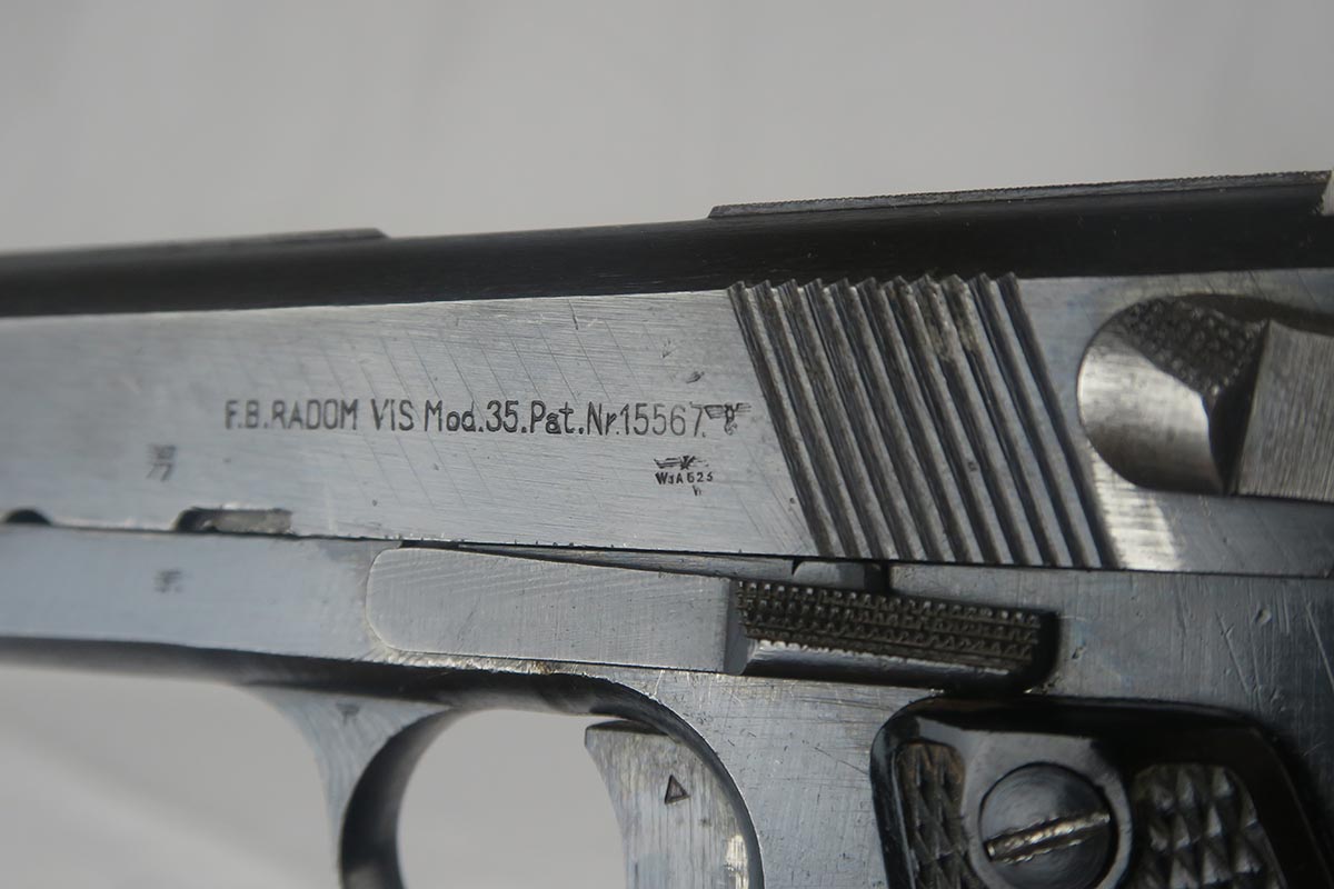 8/11/17 – This is a nice Nazi Radom vis 35 from the WW2 era.  All original and matching with about 95% bluing remaining.  Some browning on the straps, and most of the finish loss is found on the right side of the slide.  Two-lever, mid-war variation.  Nice black grips and period correct magazine.  Eagle/77 on frame and slide.  Bore has strong rifling but some frosting.