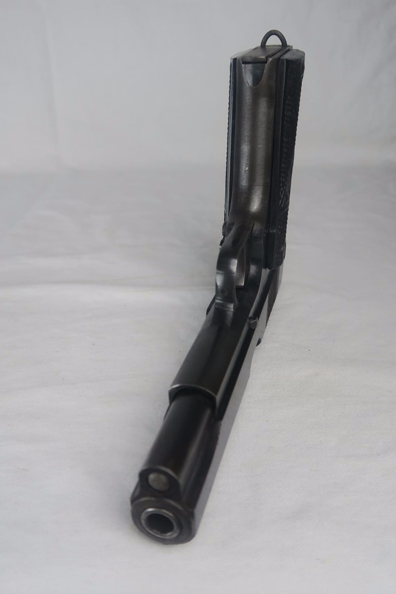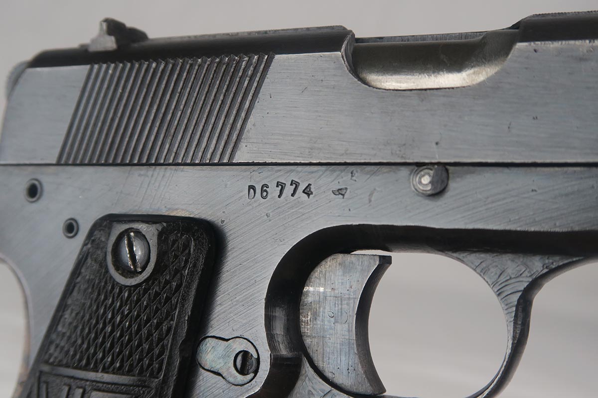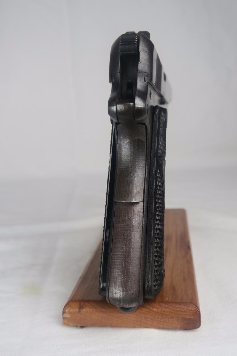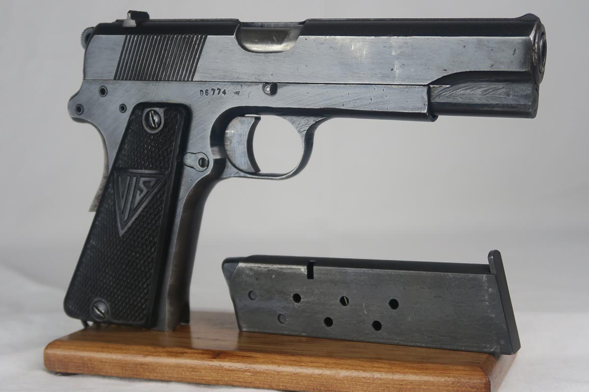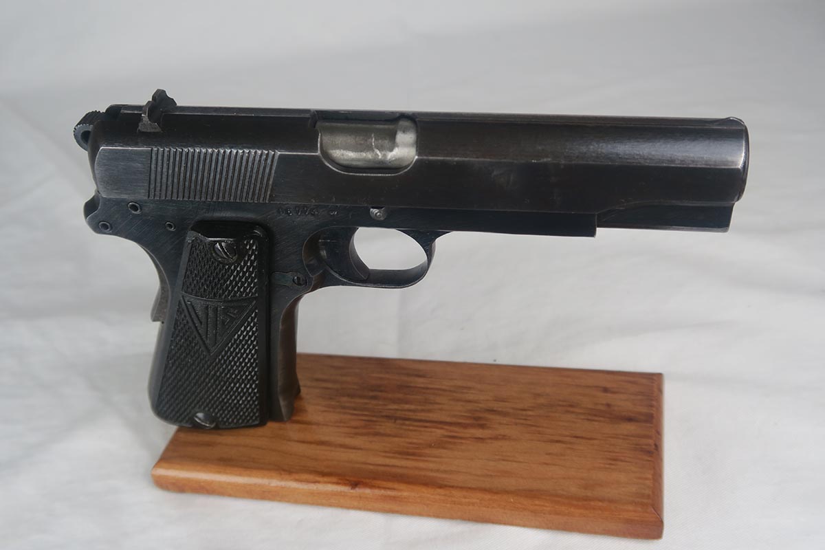 8/11/17 – This is a nice Nazi Radom vis 35 from the WW2 era.  All original and matching with about 95% bluing remaining.  Some browning on the straps, and most of the finish loss is found on the right side of the slide.  Two-lever, mid-war variation.  Nice black grips and period correct magazine.  Eagle/77 on frame and slide.  Bore has strong rifling but some frosting.