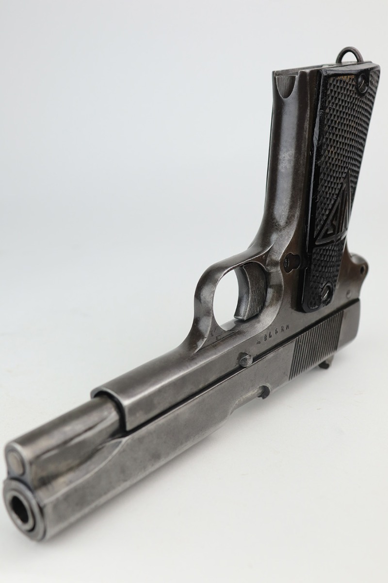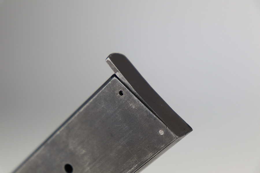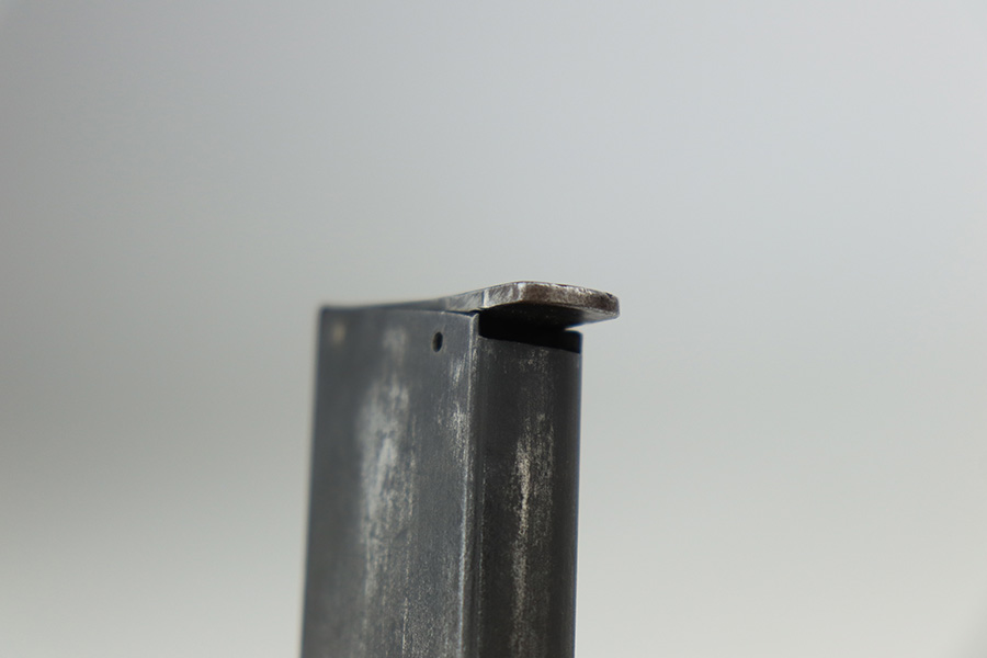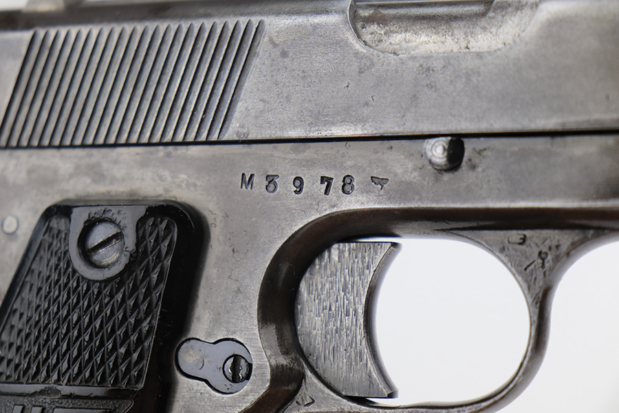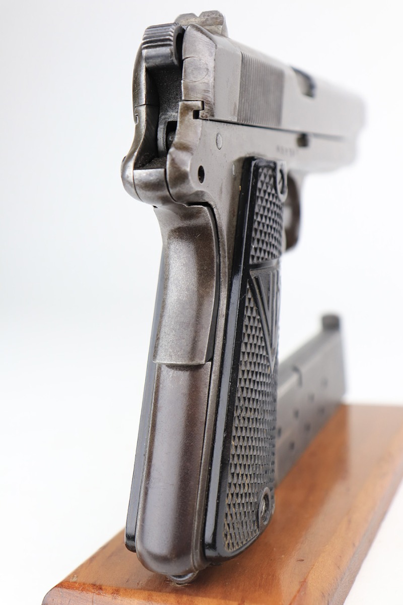 4/5/22 – This is a Polish Radom VIS 35 issued to the Nazi military during WW2. It is all matching and has the proper “Eagle 623” and “Waffen 77” military acceptance proofs. It is of the earlier 3-lever variation and has lost virtually all of its finish. There is spotty oxidation throughout and some small areas of tiny pin-pricking. Comes with nice period-correct grips – some small dings and tiny chips here and there. Also comes with a period-correct magazine that does not have a visible waffen proof. The bore has poor rifling with pitting throughout. It appears there may be a pin missing from the right side of the tang, but the gun is functional.