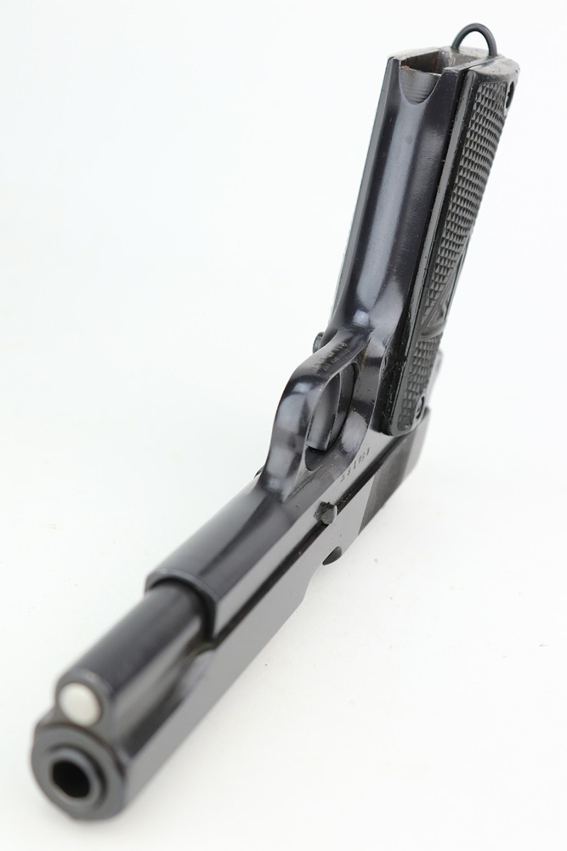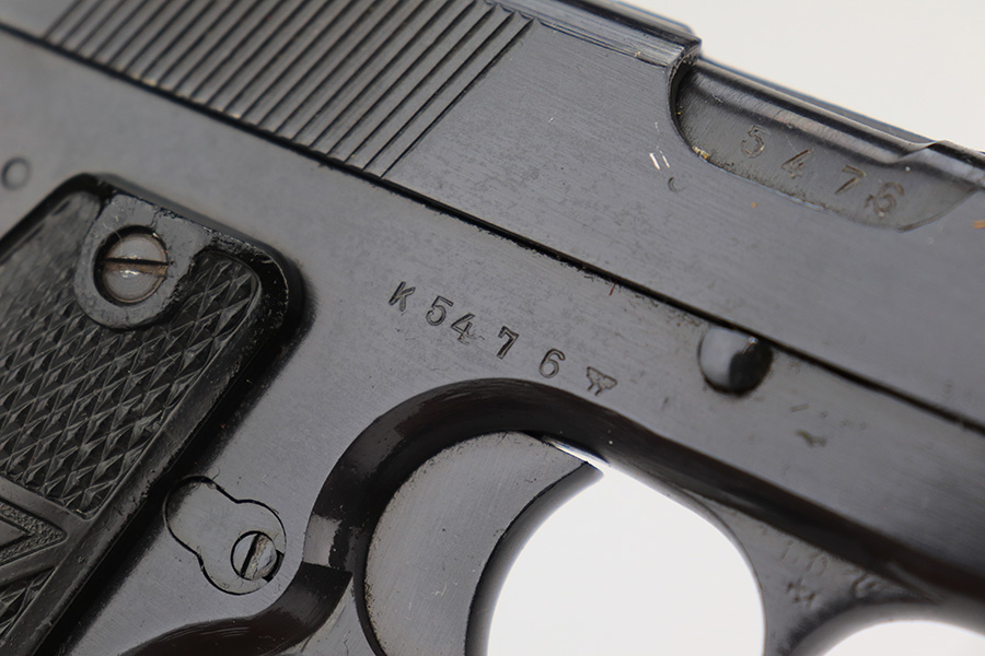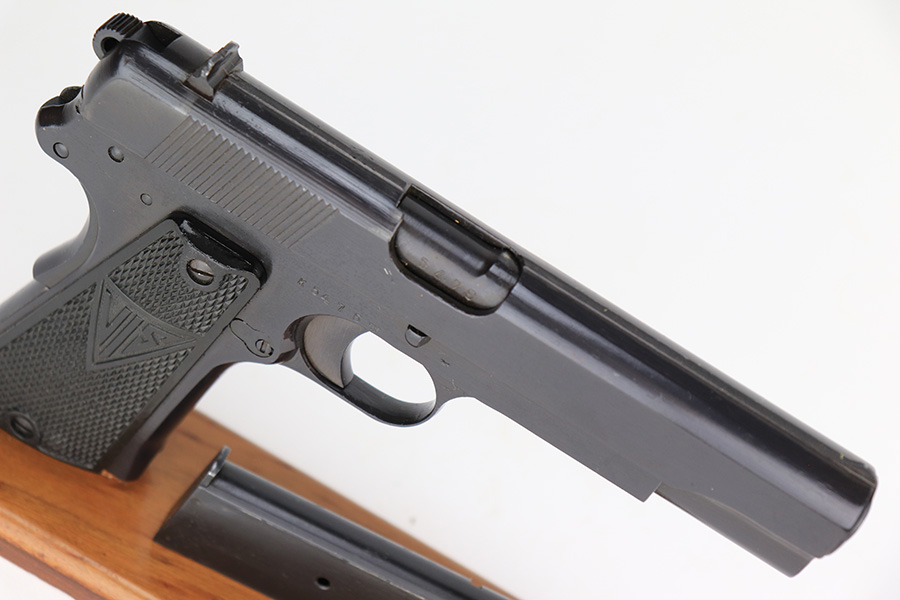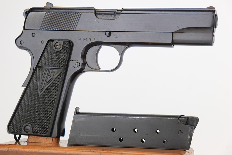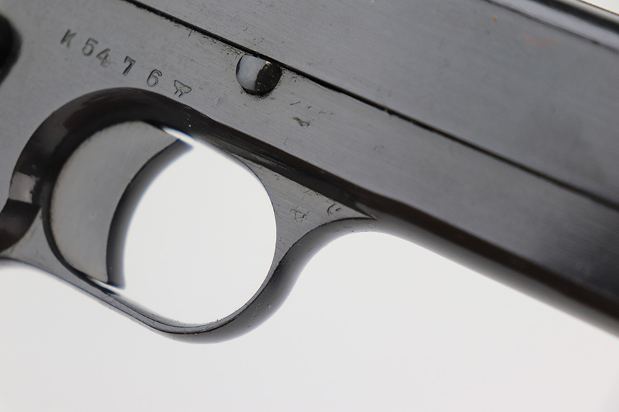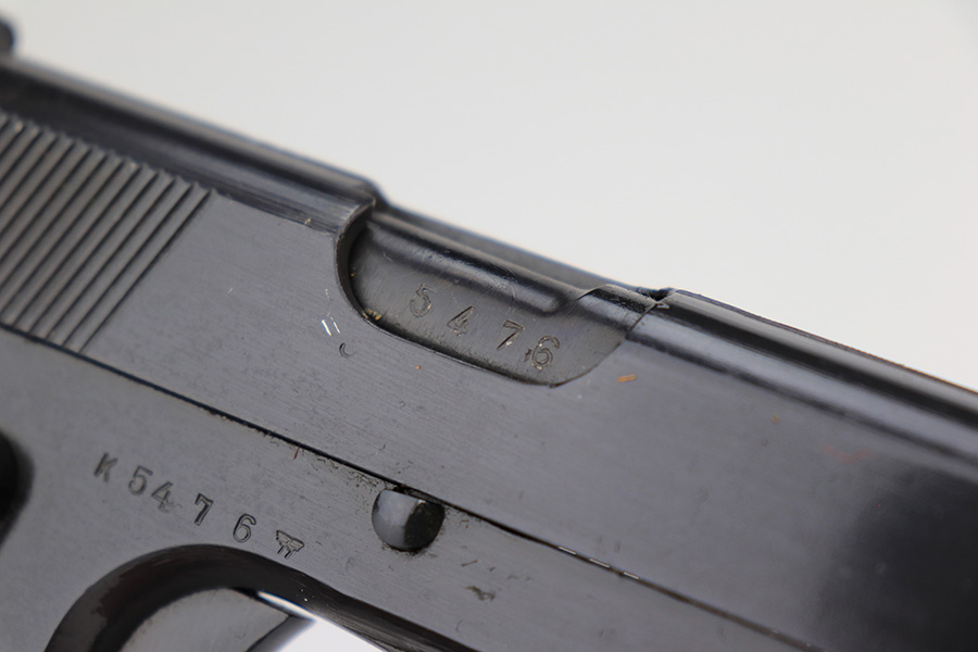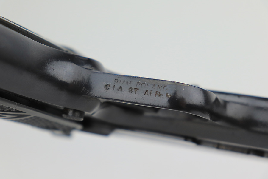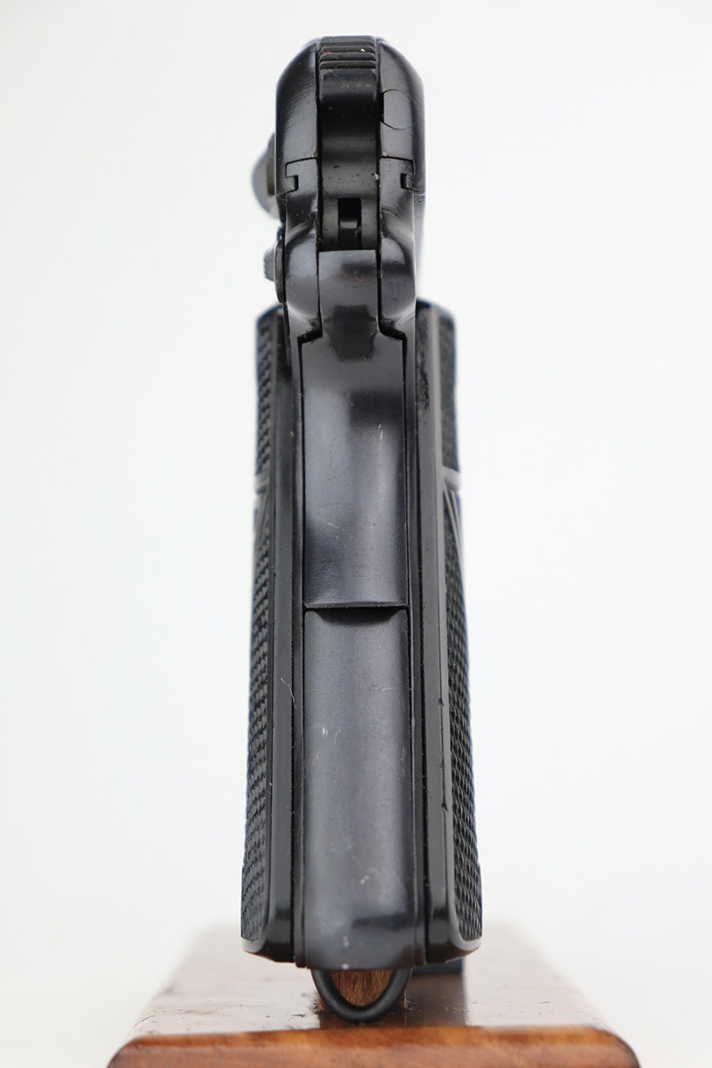 7/18/23 – This is a very nice example of a Radom VIS 35 issued to the Nazi military during WW2. This one is of the earlier 3-lever variation. All matching with the proper waffen military acceptance proofs. We believe this one is an East German rework, as evidenced by the added serial numbering in the ejection port and dark bluing – likely arsenal-refurbished and refinished. Almost no actual finish loss, just some areas of minor dulling in the finish here and there. Fitted with excellent period-correct black bakelite grips. Comes with one magazine – not waffen-proofed but is electro-pencil numbered to match the gun. The rifling in the bore is slightly worn with minor pitting throughout. Import mark on the underside of the trigger guard.
