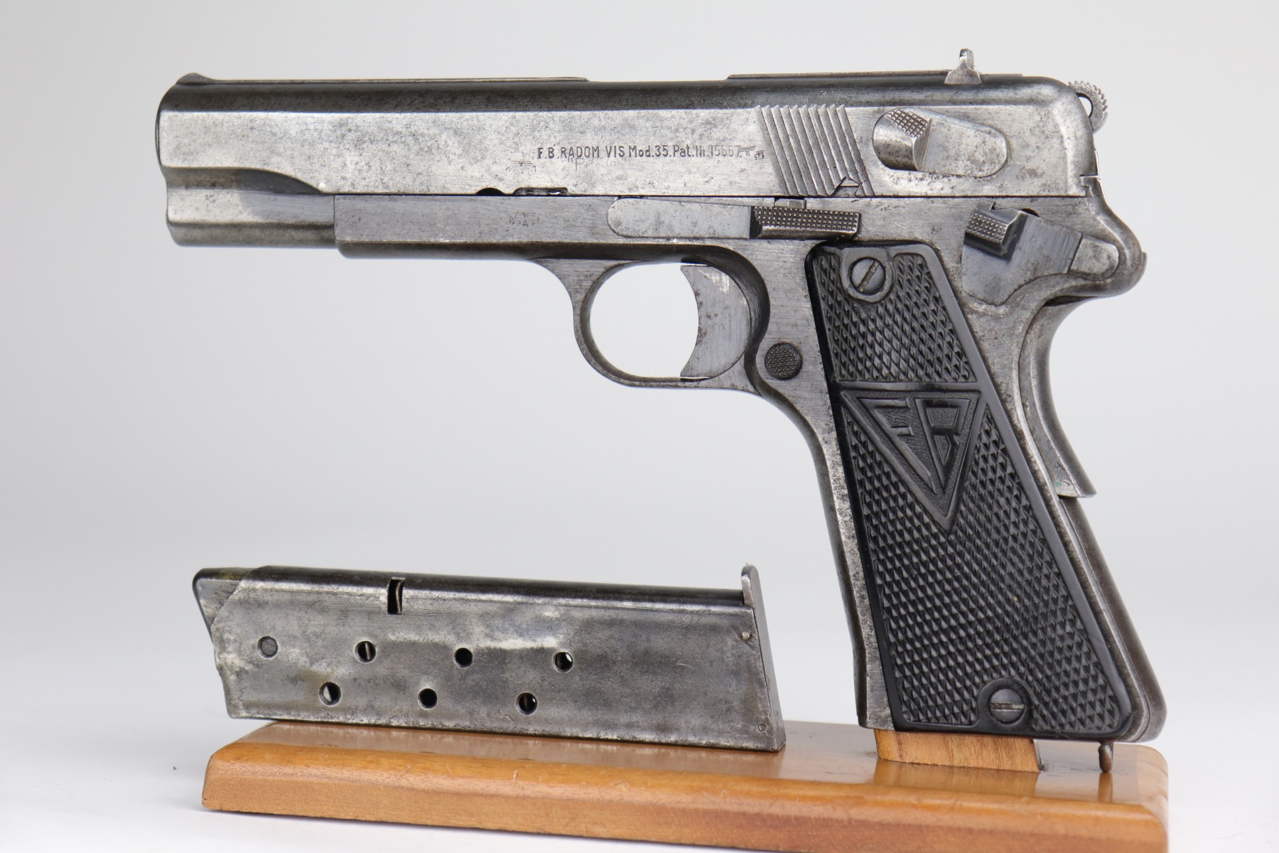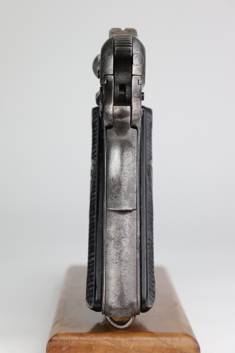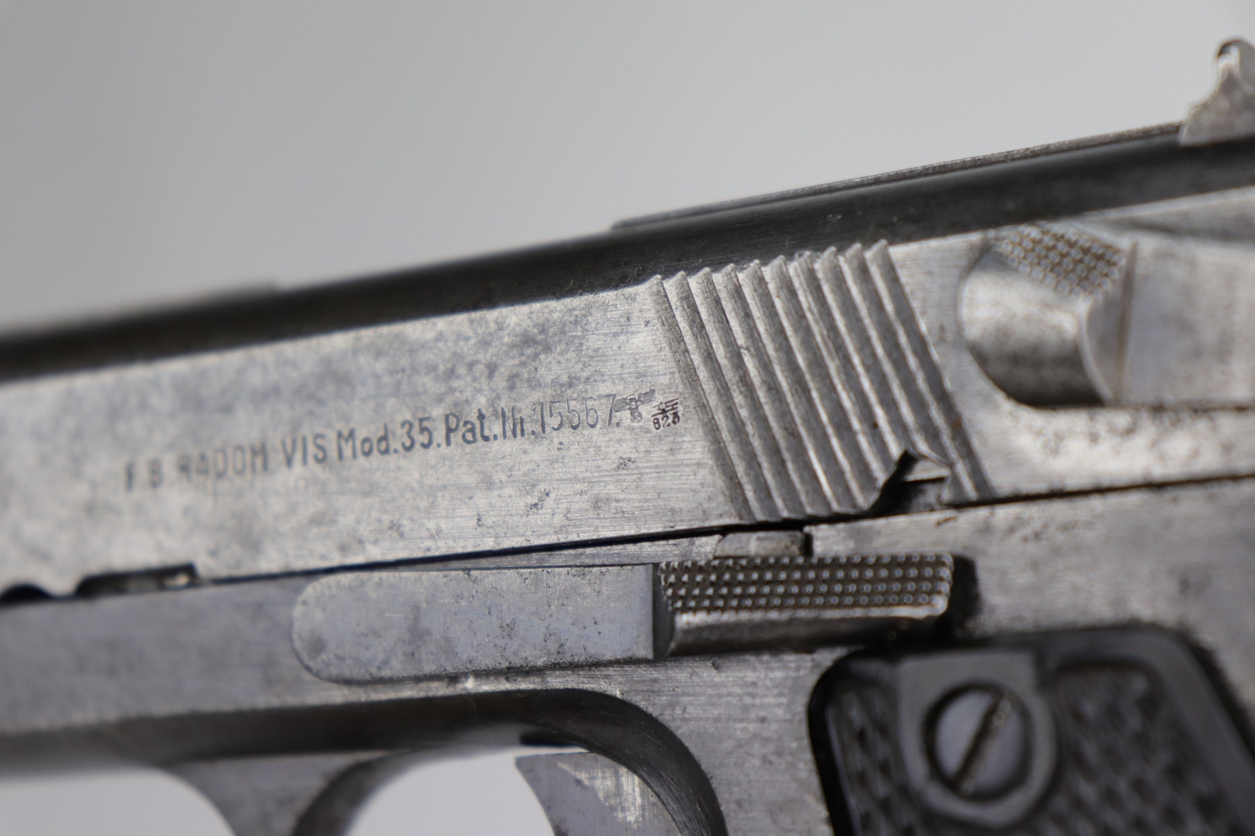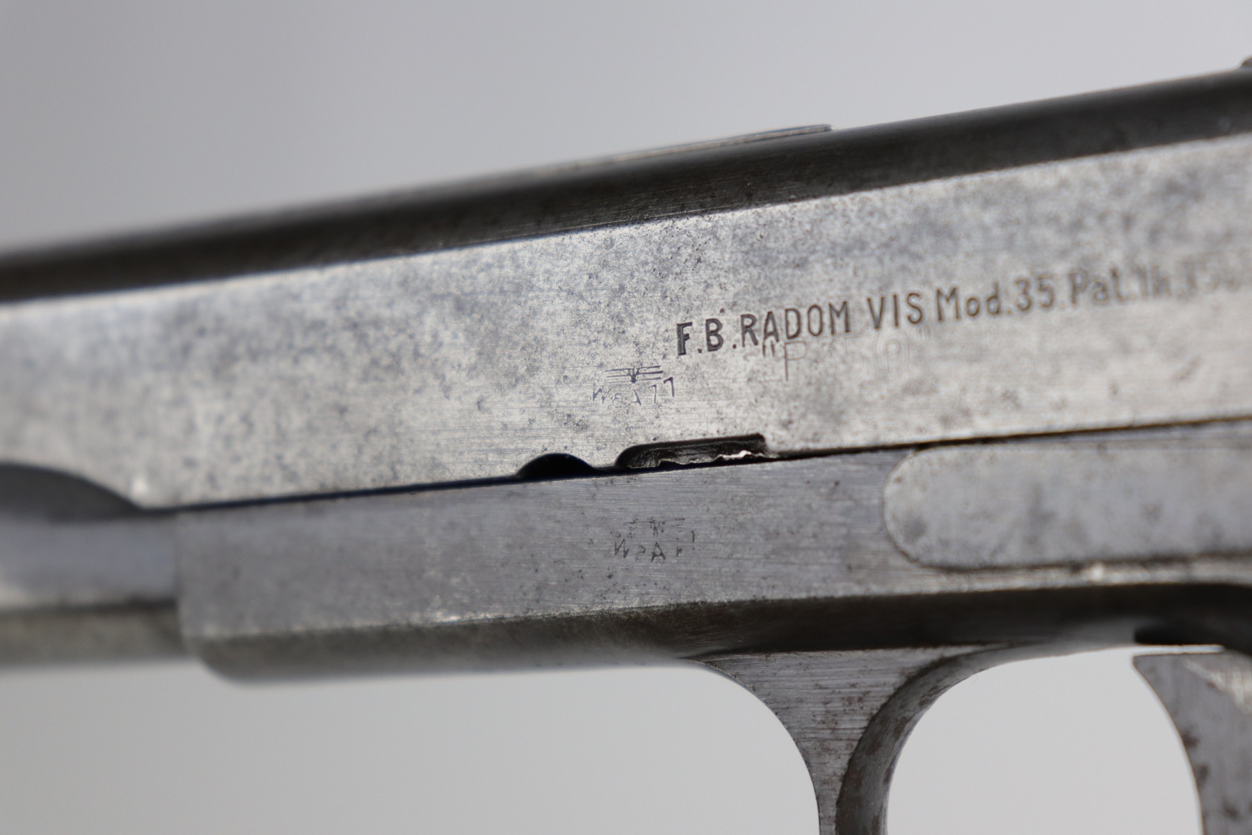 9/25/20 – This is a Radom VIS 35 pistol issued to the Nazi military around 1944. The gun is matching and has the proper “Waffen 77” and “Eagle 623” Nazi military acceptance proofs. It comes with very nice period-correct grips (just a few dings and one small chip in the right panel) and one period-correct magazine. The gun is fully functional. The pistol has only retained about 20% of its original finish, mostly visible on the left side. There is spotty oxidation and minor pitting on the entire gun. The bore has some rifling, but there is pitting throughout.