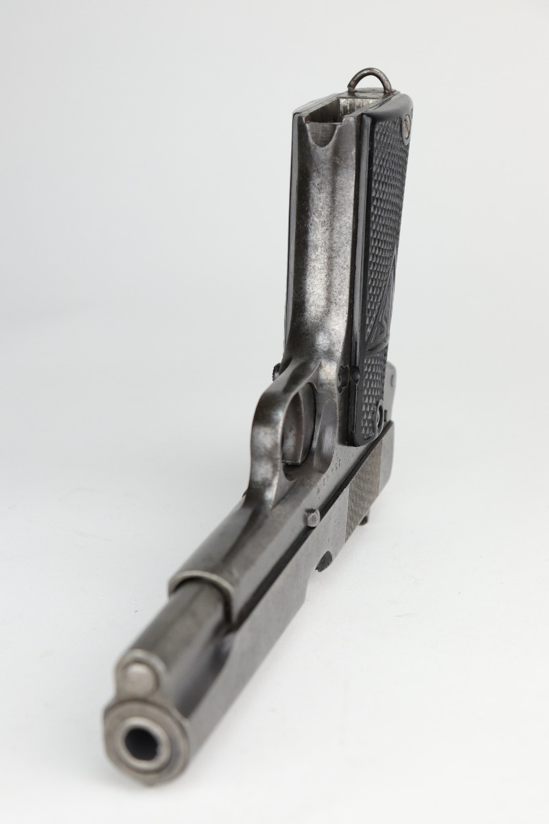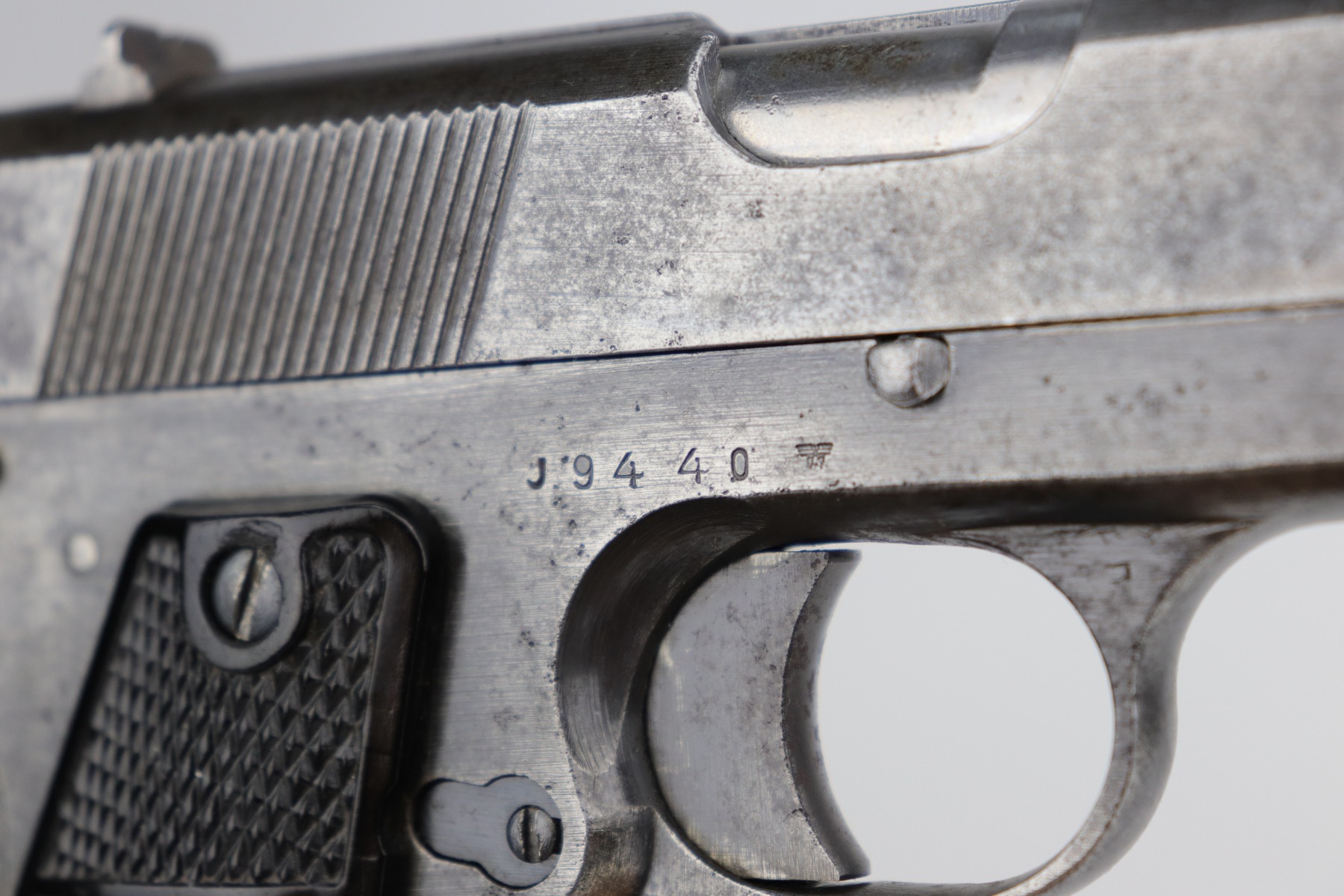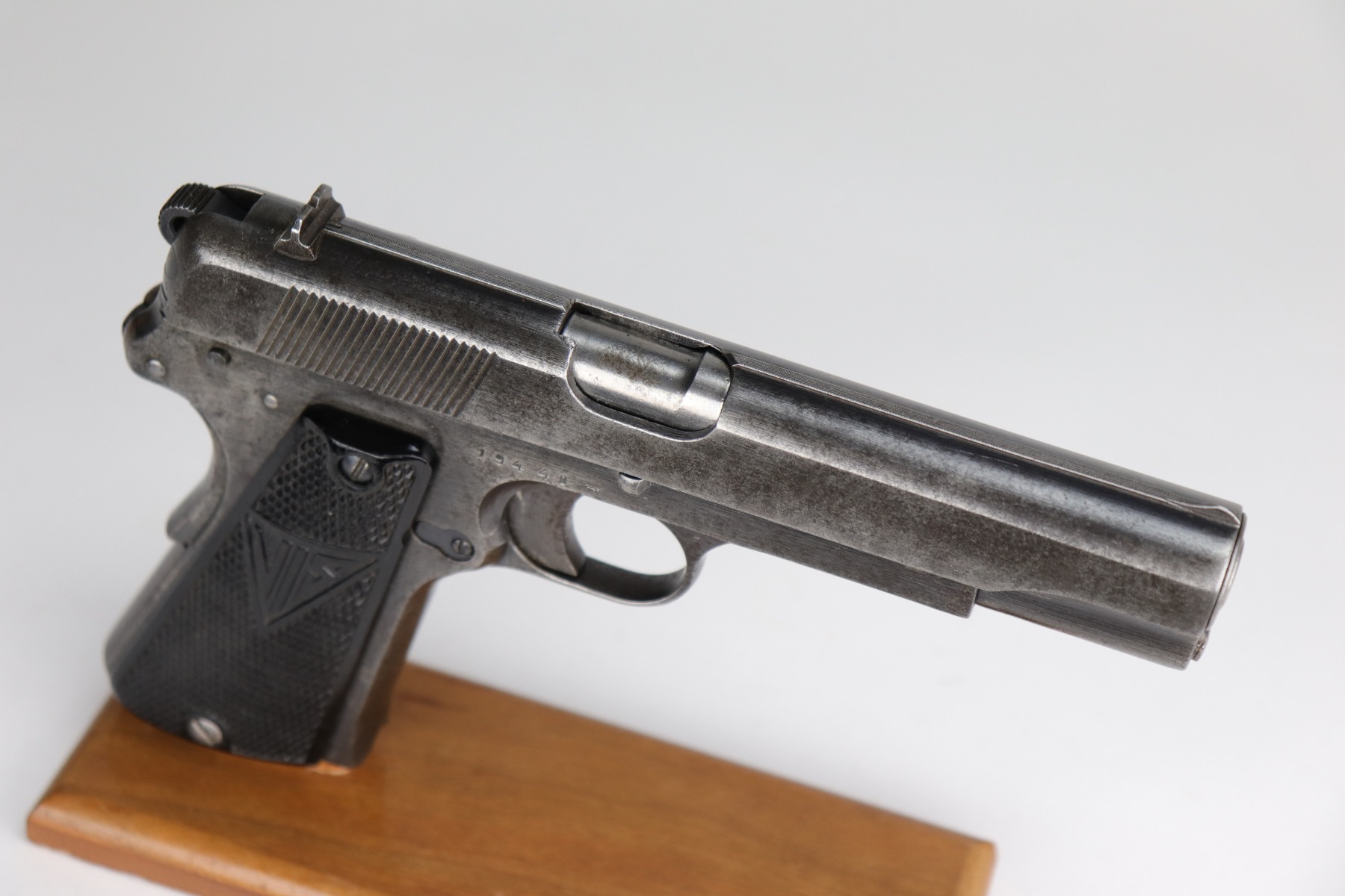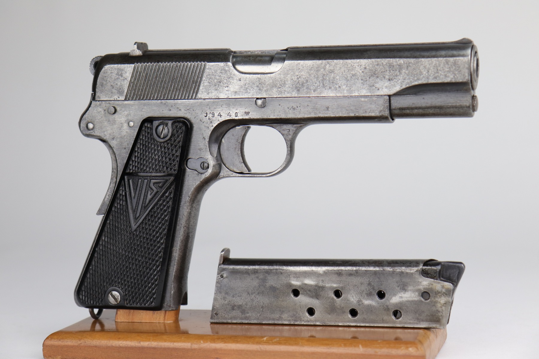 9/25/20 – This is a Radom VIS 35 pistol issued to the Nazi military around 1944. The gun is matching and has the proper “Waffen 77” and “Eagle 623” Nazi military acceptance proofs. It comes with very nice period-correct grips (just a few dings and one small chip in the right panel) and one period-correct magazine. The gun is fully functional. The pistol has only retained about 20% of its original finish, mostly visible on the left side. There is spotty oxidation and minor pitting on the entire gun. The bore has some rifling, but there is pitting throughout.