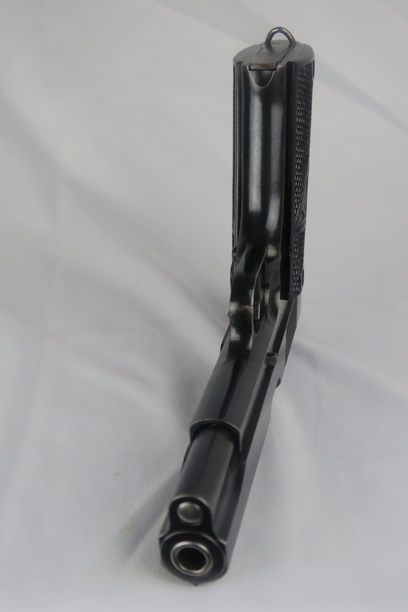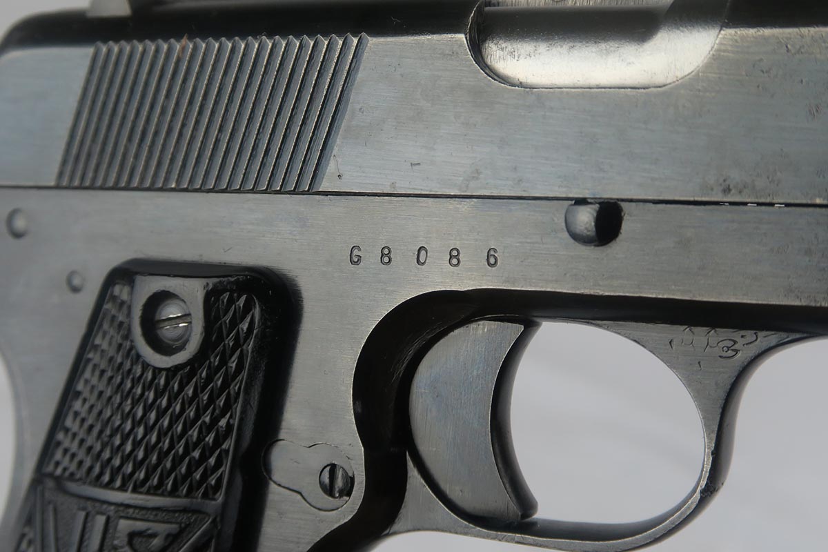 9/14/17 – This is a Nazi Radom vis 35 from WW2, with 96-97% high-polish blue remaining. It is semi-early with features including the three levers on frame and slide, as well as P.35 proof on the slide. It is all original and correct with most of the finish loss found on the bottom of the back strap. There is some surface freckling in multiple areas of the slide. The grips are in very good condition with no cracks or chips. Unmarked, period correct magazine. WaA77 on frame and slide. Excellent bore with no major issues.