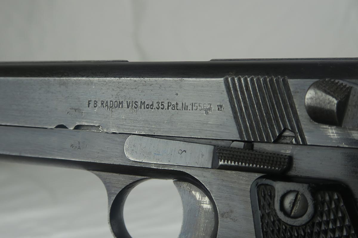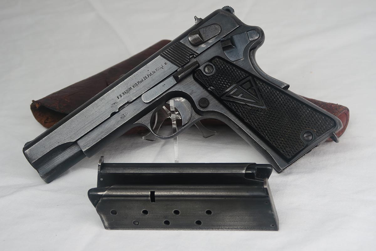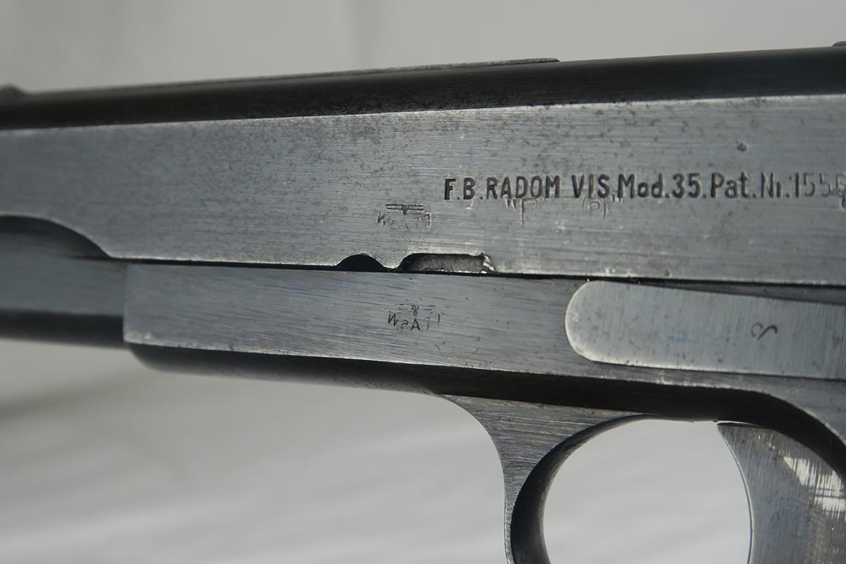 7/31/17 – This is a Nazi marked Radom vis 35 rig – all original and correct.  Comes with proper Radom holster with faint internal inkstamp and two total magazines.  One magazine is waffen marked.  The pistol is all matching with about 90-92% blue remaining.  Most of the finish loss is on the straps but there is some thinning on the slide, as well.  Minty bore.  Very good grips with no major flaws.