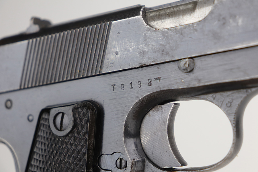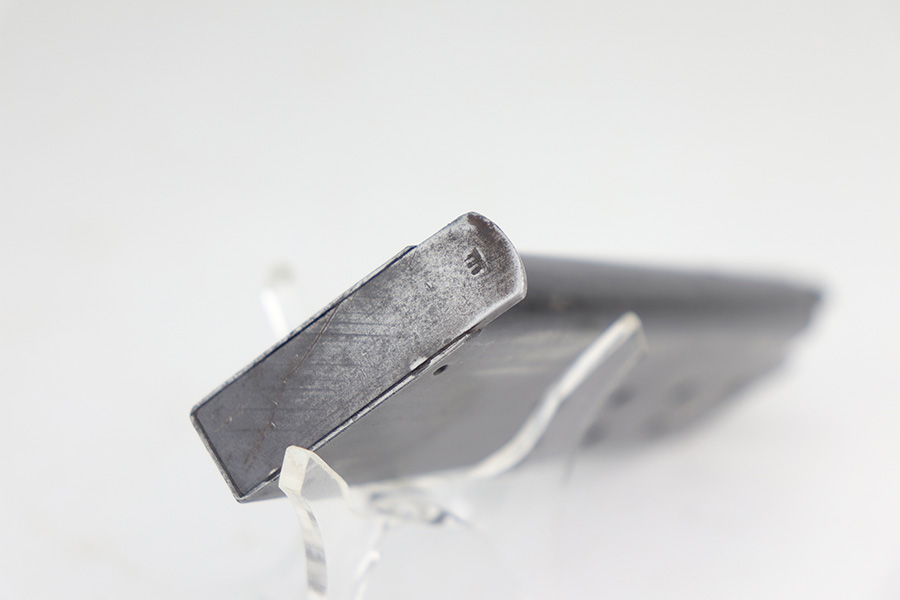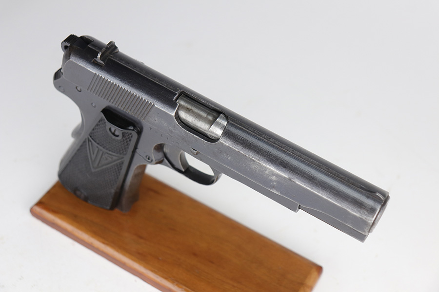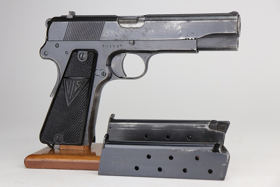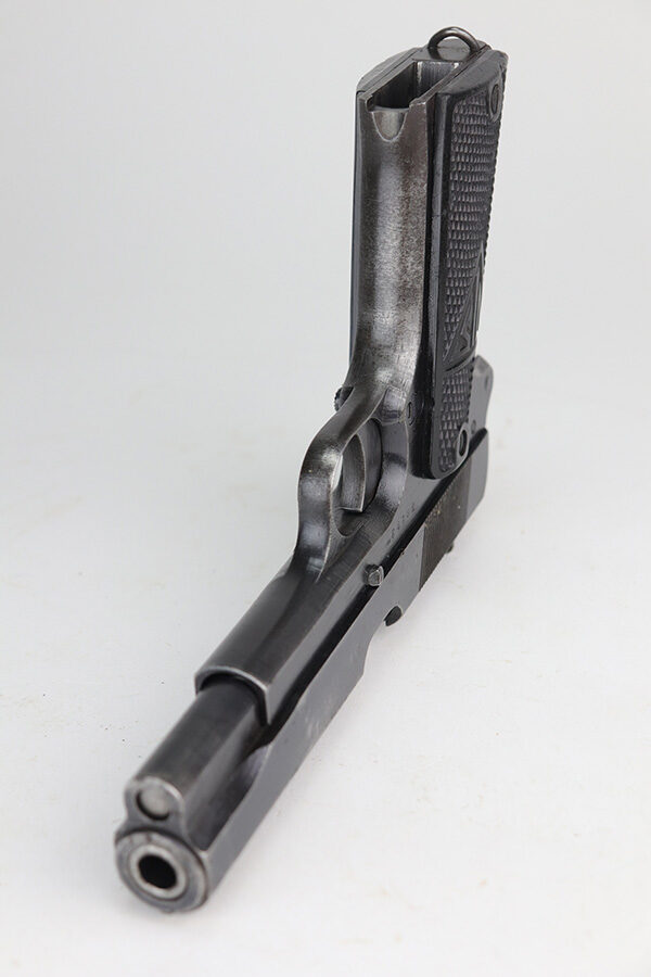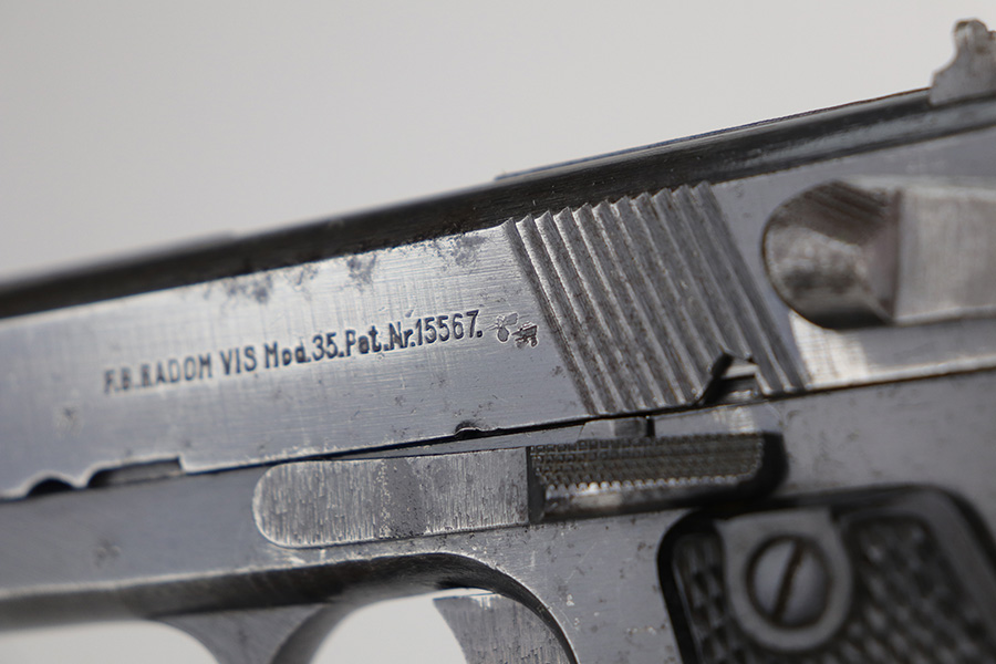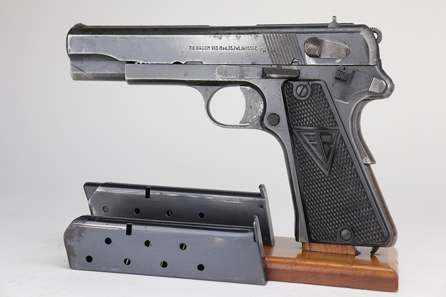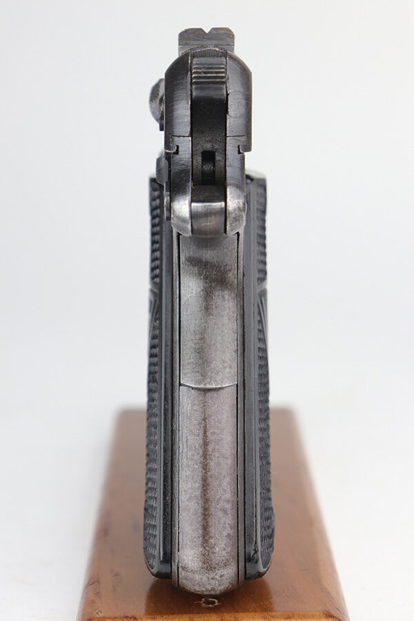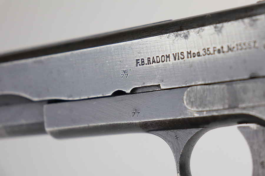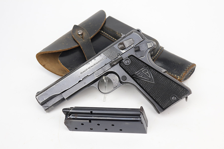 11/5/21 – This is a nice example of a Radom VIS Model 35 issued to the Nazi military during WW2. It is all matching and has the proper “Eagle 77” and “Eagle 623” Nazi military acceptance proofs. It comes as a rig with two period-correct magazines and an excellent black leather holster. The holster is waffen-proofed and has a legible ink stamp on the inside of the top flap. The gun has retained roughly 80-85% of its original military bluing. Most of the finish loss is on the grip straps, where there is also spotty oxidation. Generally, there is minor wear on the high edges and around the muzzle. Noticeable thinning on the top and left side of the slide. An area of spotty wear on the right side of the slide. There are areas of minor oxidation here and there on both sides of the slide. One small area of minor pitting on the left side of the slide. Comes with very nice period-correct black bakelite grips – tiny crack a the bottom of the right grip. The bore is mint.