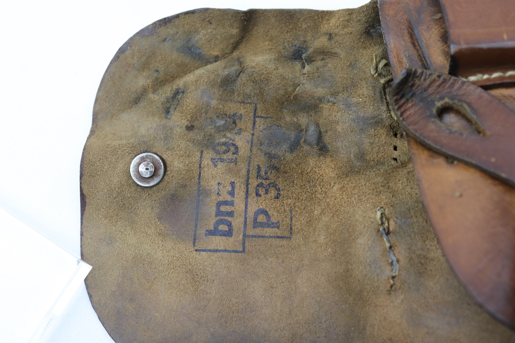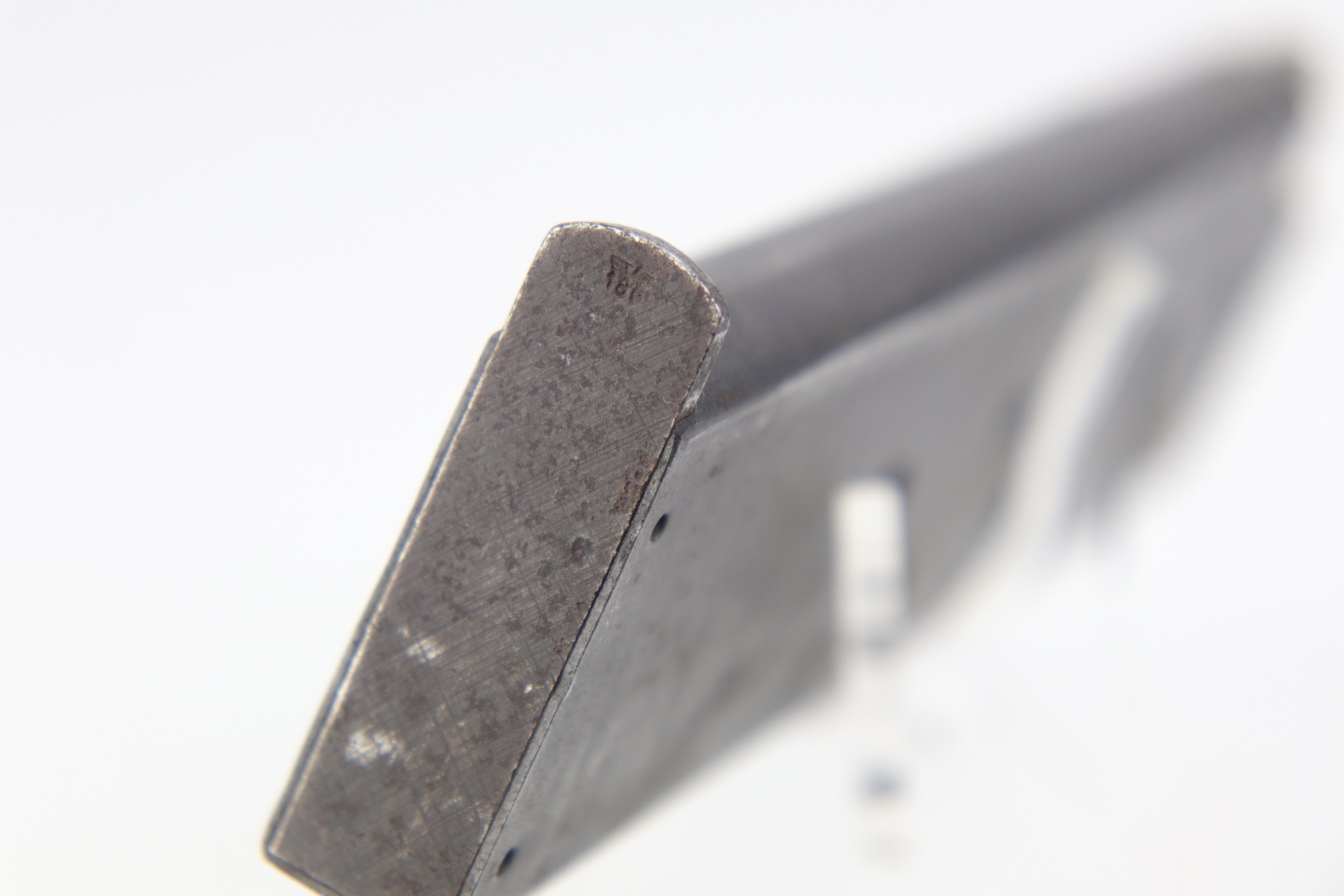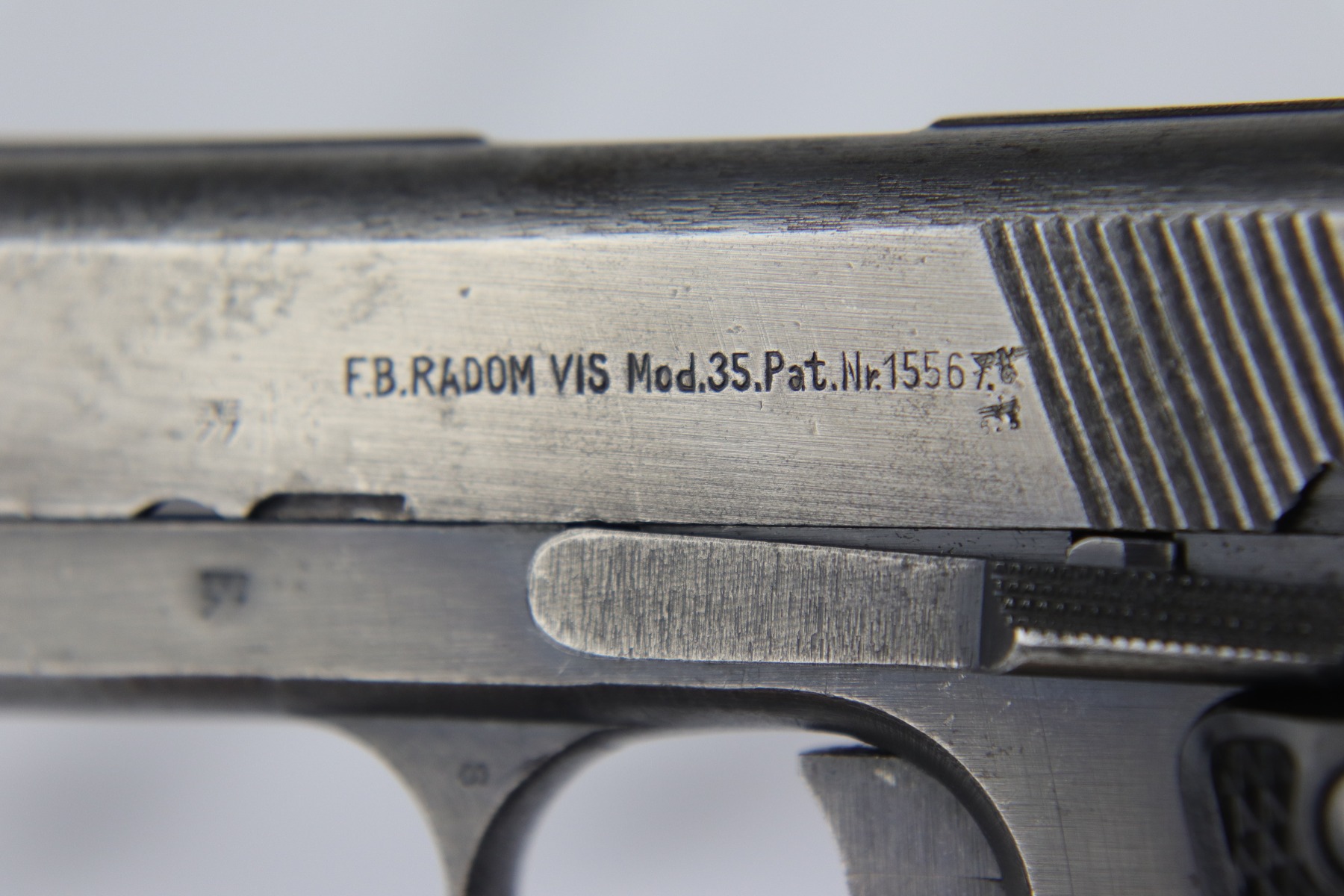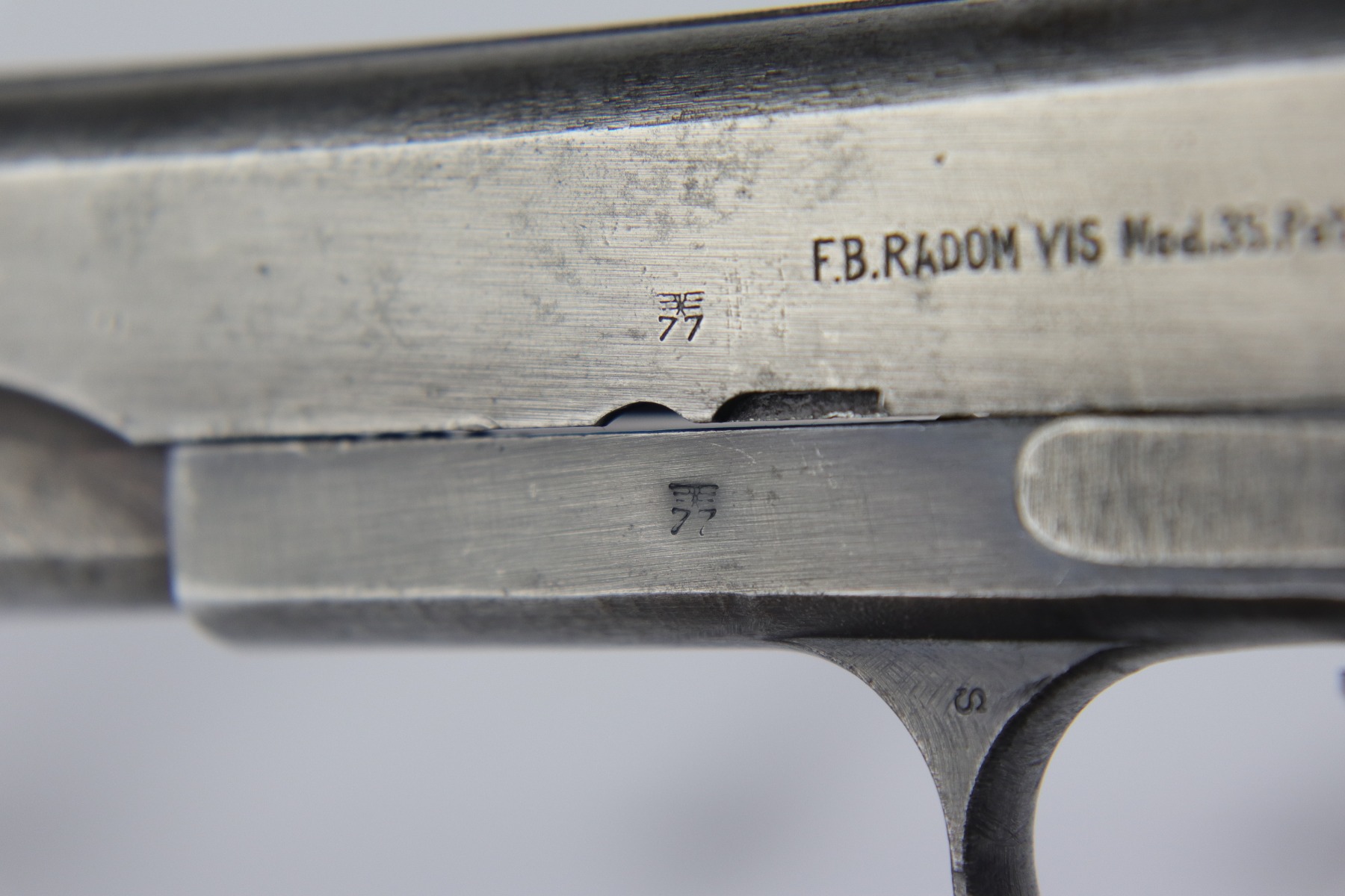 12/18/18 – This is an original Nazi Radom VIS 35 rig with holster and spare magazine. The gun is all matching but the finish is thoroughly thinned throughout. Excellent black grips. Bore is shiny with strong rifling. BOTH magazines are waffen marked and in good condition. The holster shows a fair amount of age and wear, with a couple small holes in the top/back. It has an internal ‘bnz’ ink stamp with 1944 date.