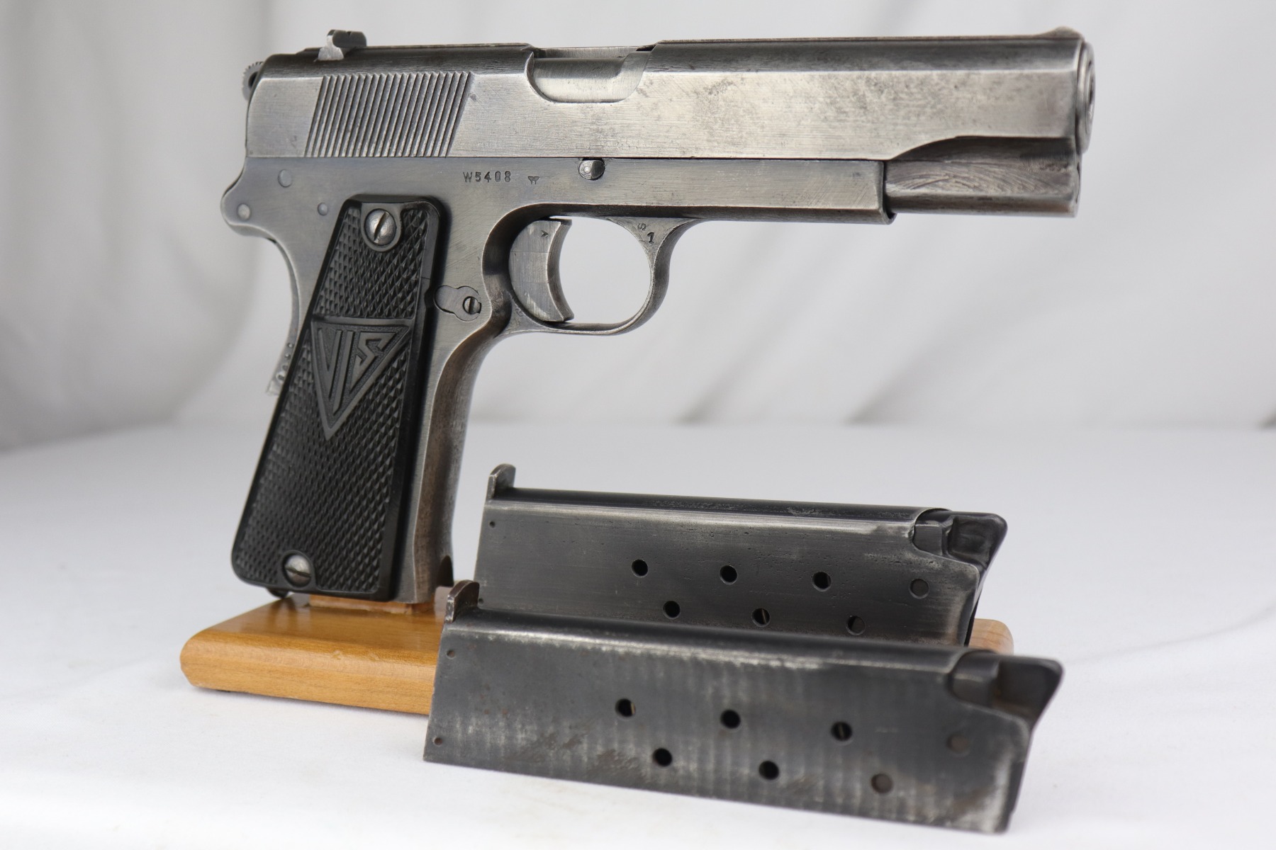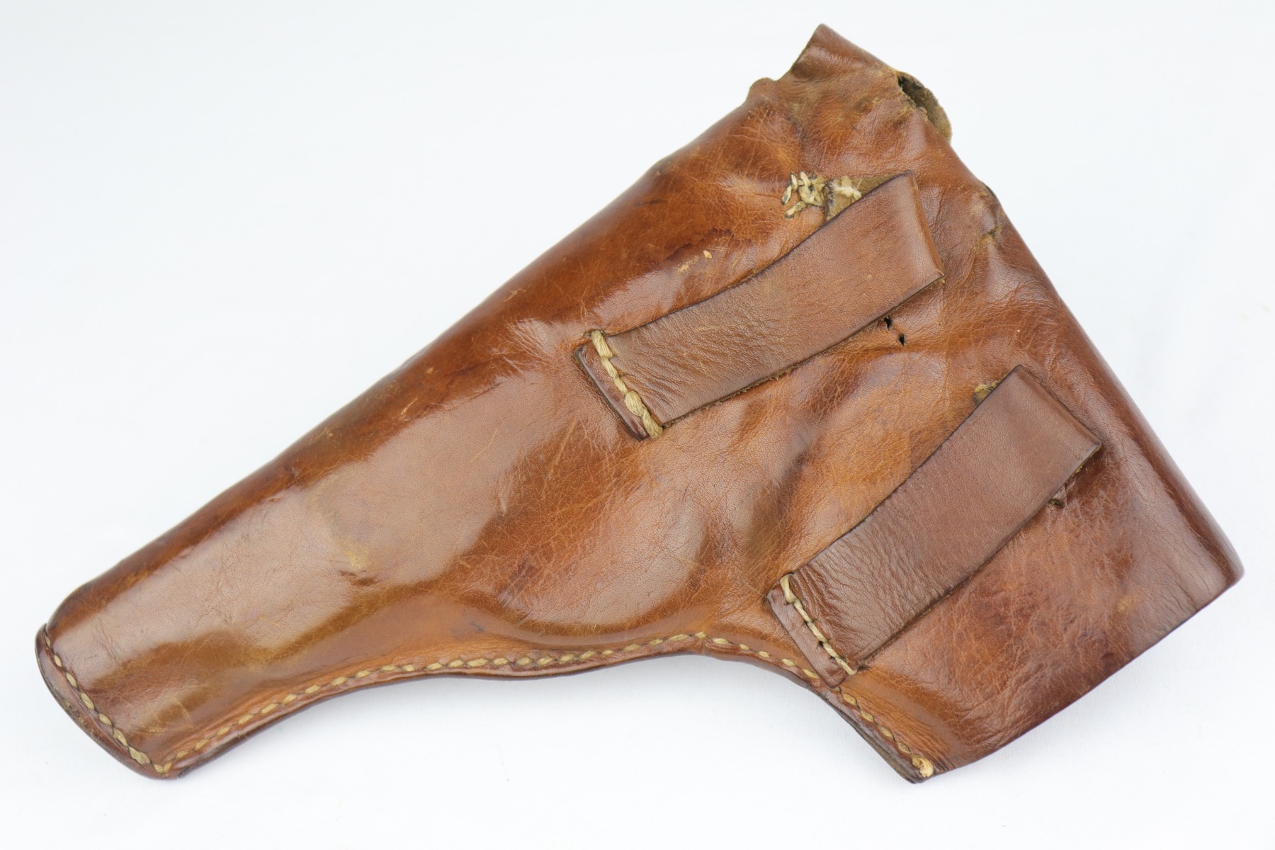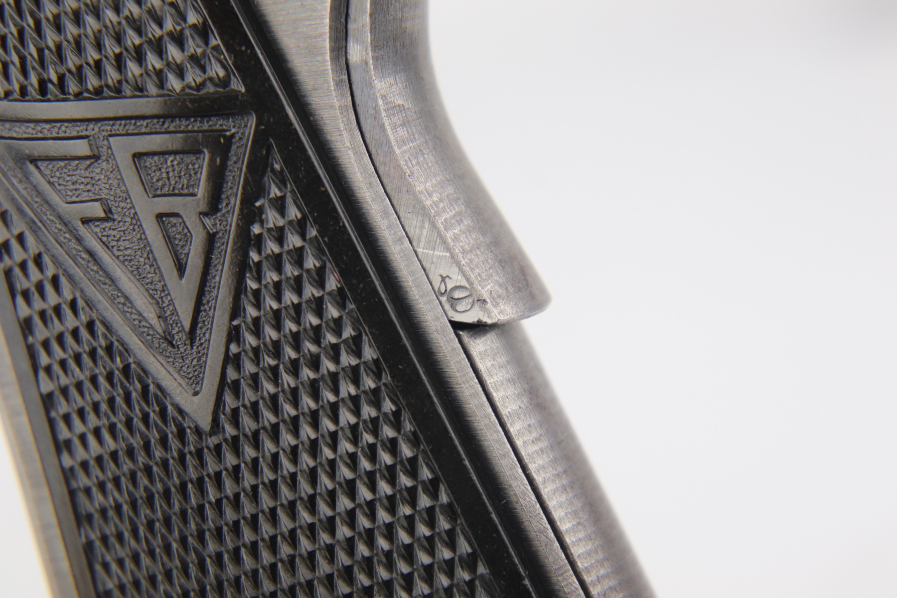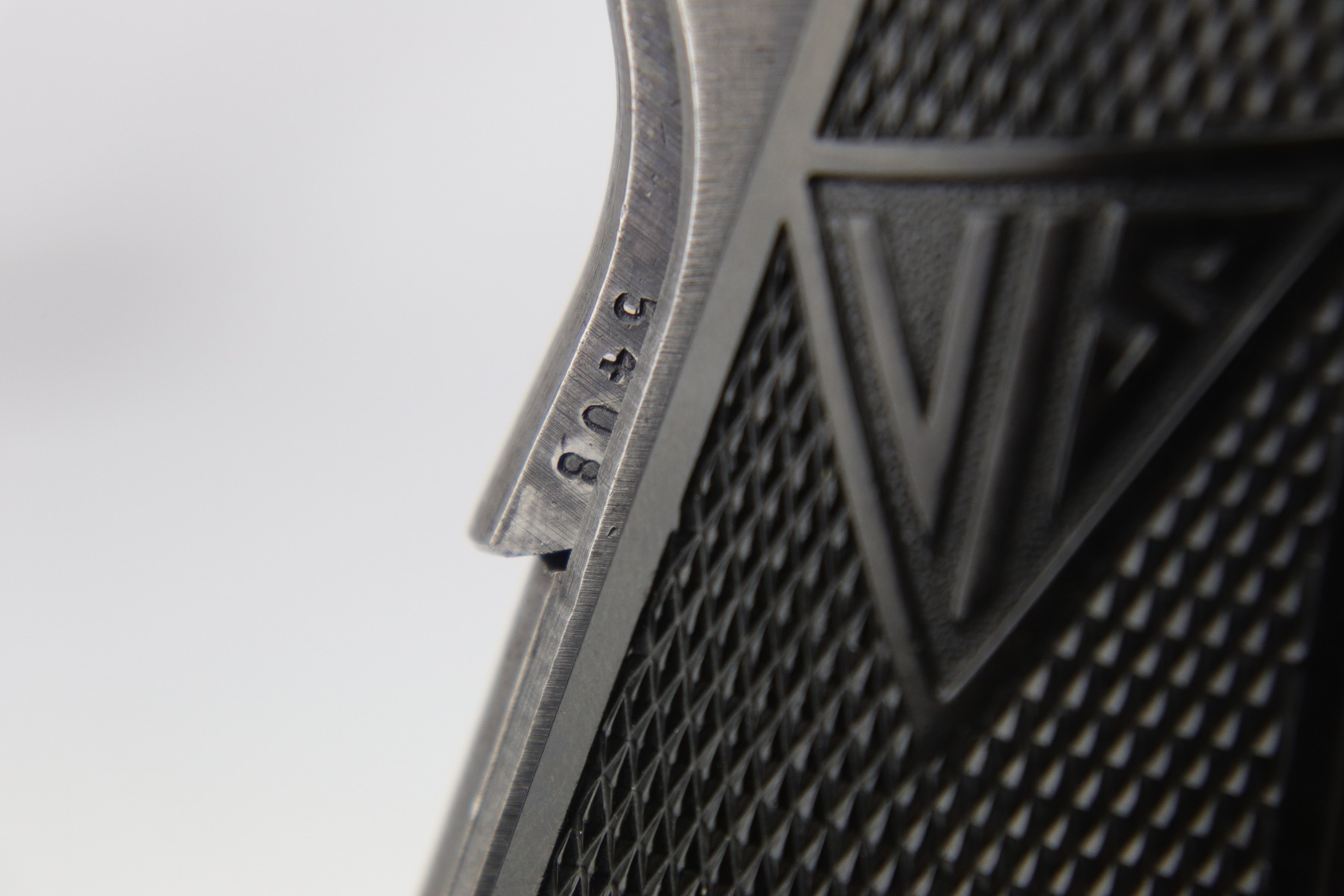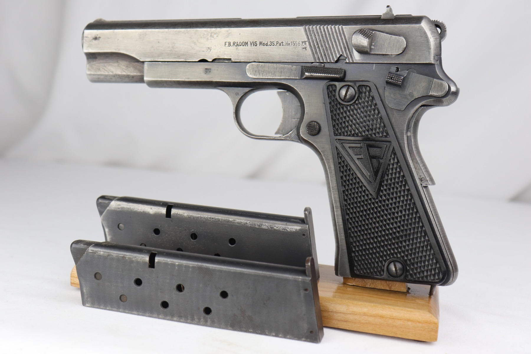 12/18/18 – This is an original Nazi Radom VIS 35 rig with holster and spare magazine. The gun is all matching but the finish is thoroughly thinned throughout. Excellent black grips. Bore is shiny with strong rifling. BOTH magazines are waffen marked and in good condition. The holster shows a fair amount of age and wear, with a couple small holes in the top/back. It has an internal ‘bnz’ ink stamp with 1944 date.