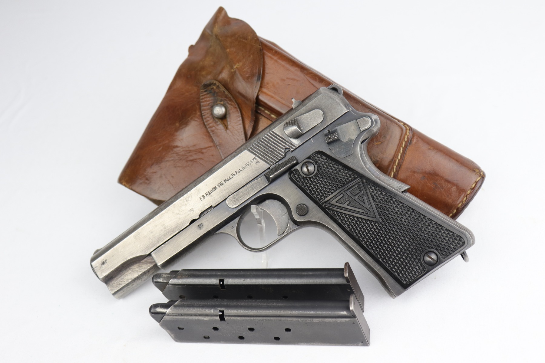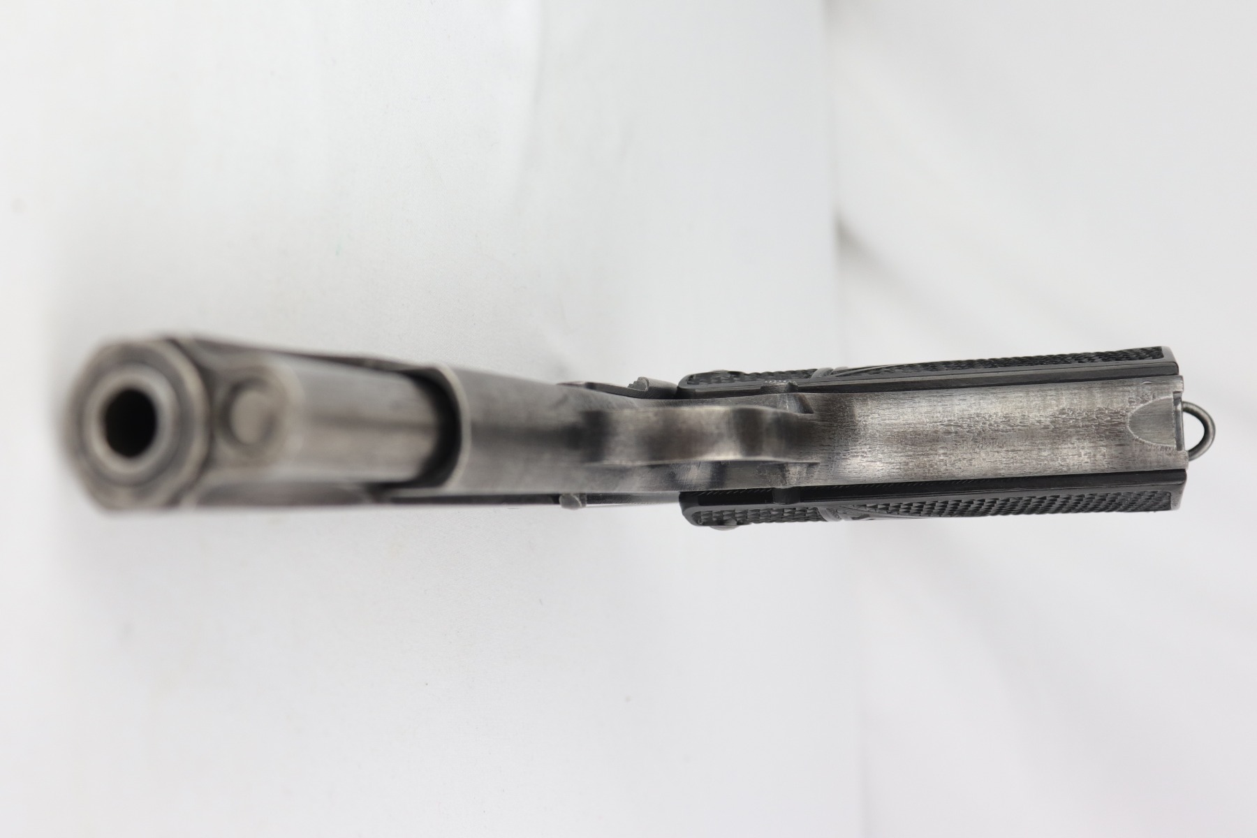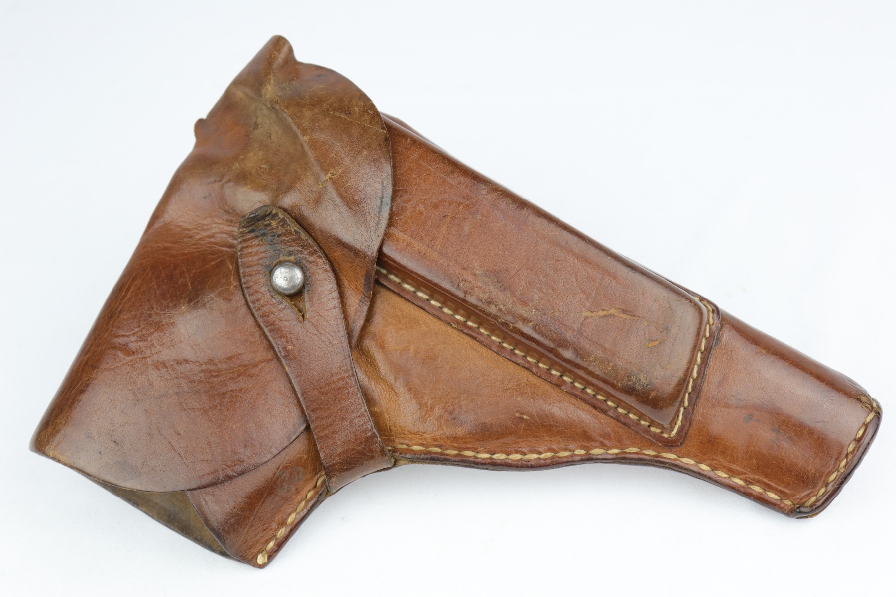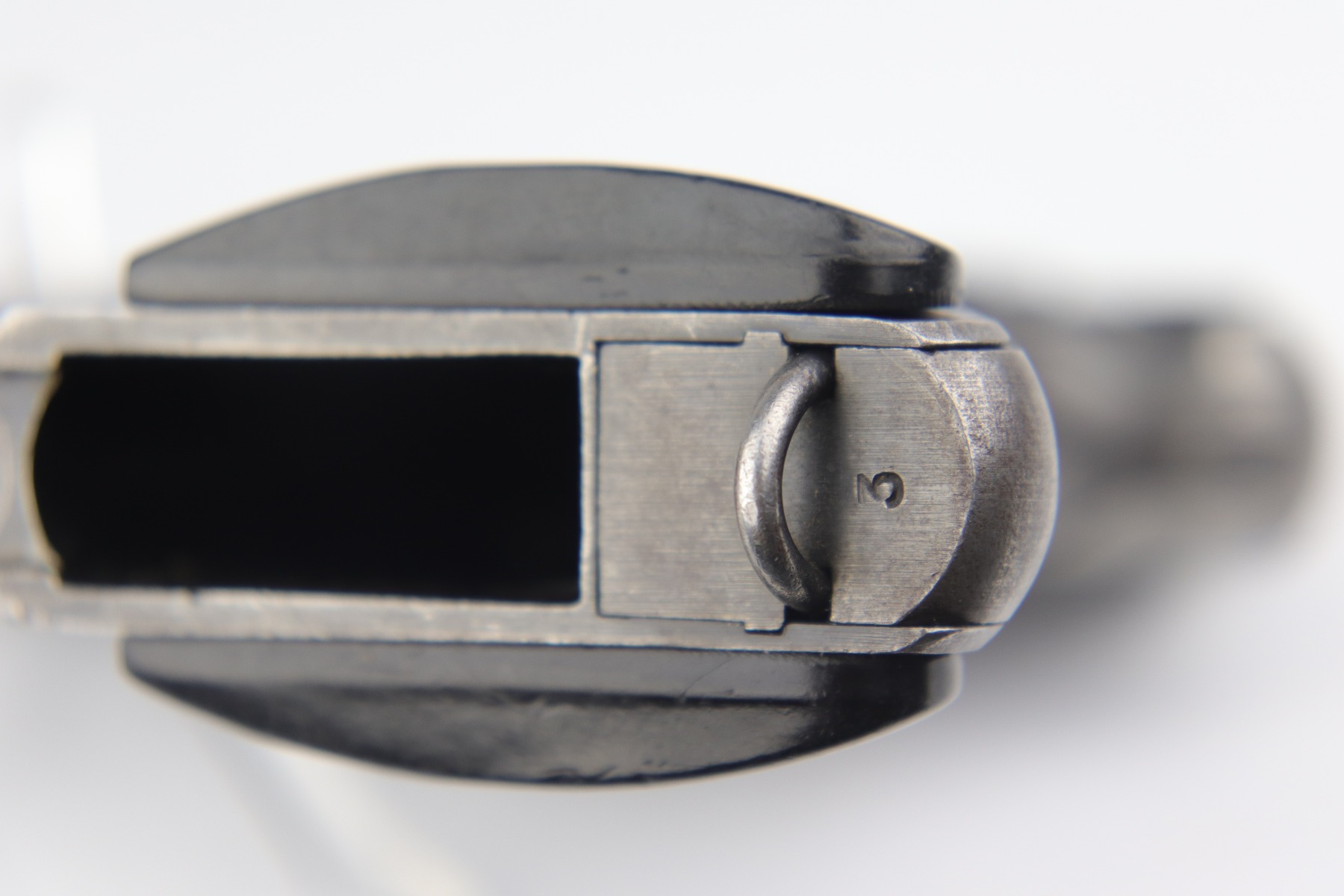 12/18/18 – This is an original Nazi Radom VIS 35 rig with holster and spare magazine. The gun is all matching but the finish is thoroughly thinned throughout. Excellent black grips. Bore is shiny with strong rifling. BOTH magazines are waffen marked and in good condition. The holster shows a fair amount of age and wear, with a couple small holes in the top/back. It has an internal ‘bnz’ ink stamp with 1944 date.